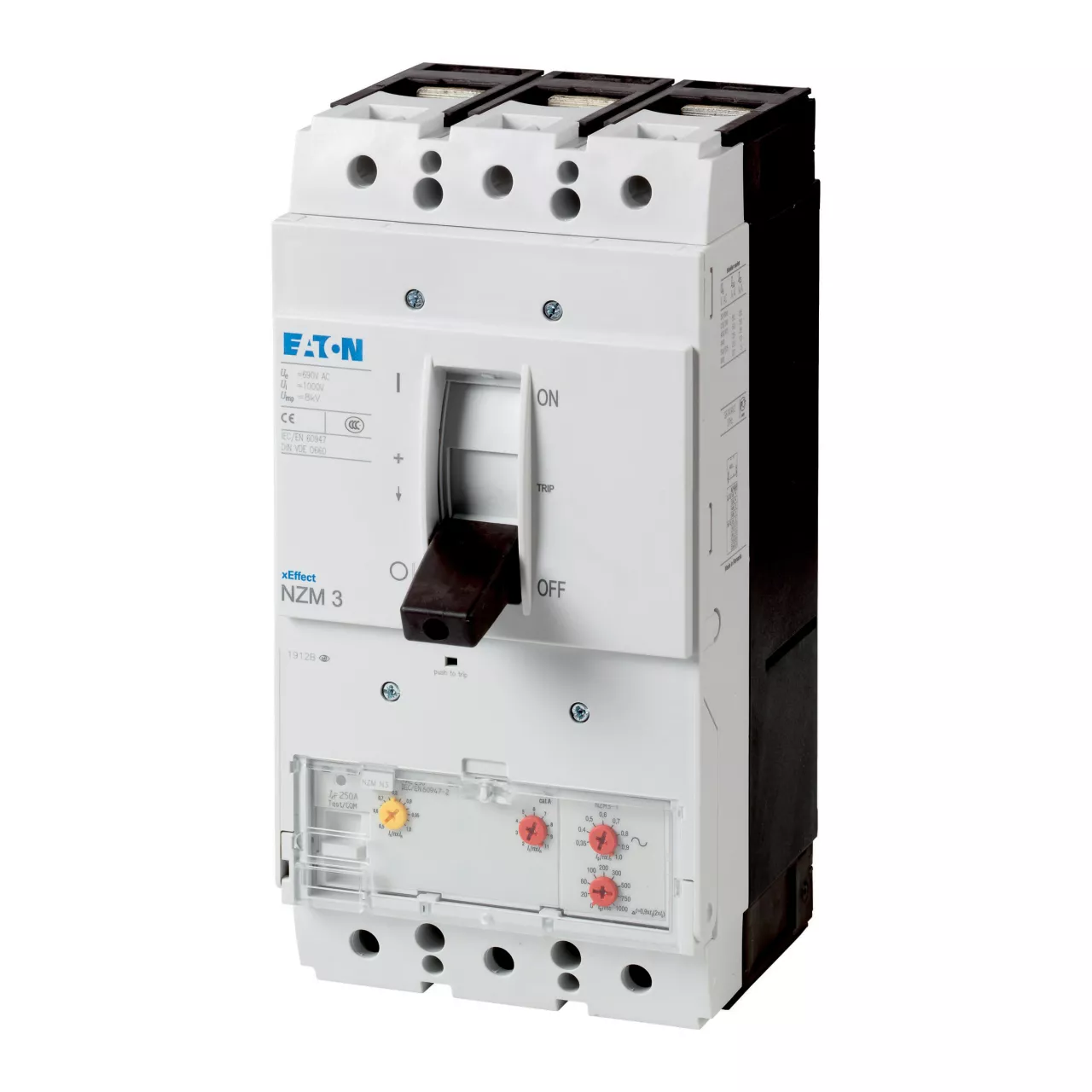 Vermogensautomaat NZM3, 3-polig, Schakelvermogen 400/415 V 50 Hz( Icu ): 50 kA, Nominale bedrijfsstroom = nominale ononderbroken stroom Nominale bedrijfsstroom = nominale ononderbroken stroom (ln = lu): 250 A, Installatietype: Vast, Schroefaansluiting, Standaard/goedkeuring: IEC, Beschermingsfunctie: Installatie- en kabelbeveiliging