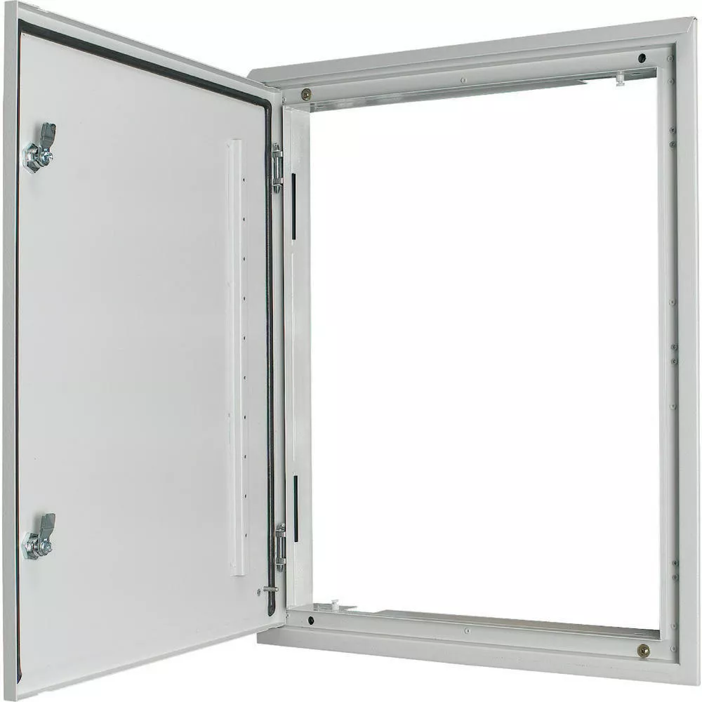 3-komponentowa, podtynkowa ramka drzwiczek IP43, z drzwiczkami, BPA-U-3S-...Szerokość 1000 mm, wysokość zewnętrzna 2060 mm, wysokość płyty czołowej 1950 mm, z uszczelką piankową i profilem odprowadzającym do zastosowań zewnętrznych, zamek na klucz dwupiórowy, charakterystyka materiału: aluminium malowane proszkowo, RAL 7035, wyposażenie w zestawie: ramy, drzwiczki z zawiasami