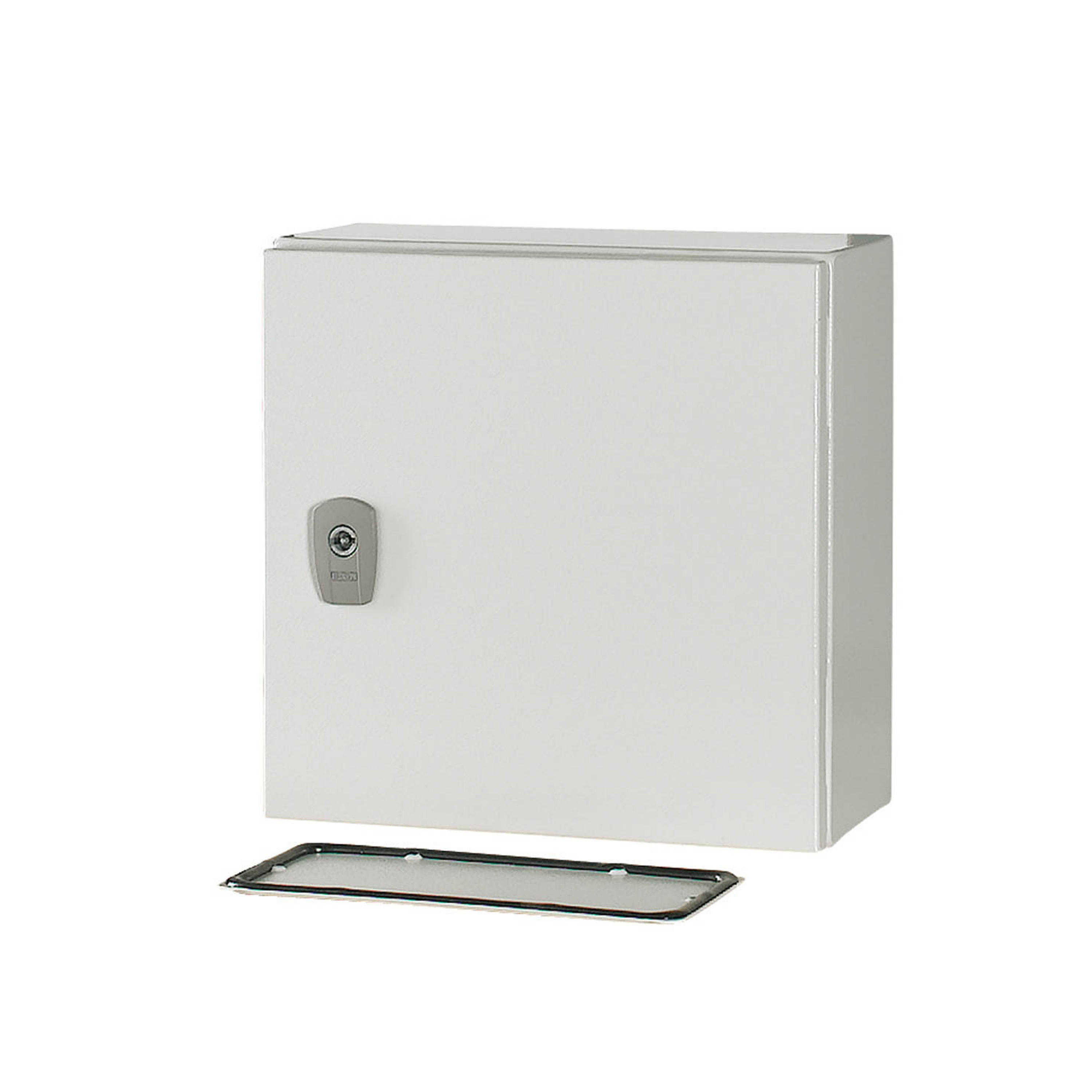 Wandaufbaugehäuse CS, Tür mit umlaufender Polyurethanschaumdichtung , Stoßfestigkeit IK10 nach EN 62262, eintürig, Türanschlag rechts, Öffnungswinkel 120°, Scharnierachsen mit Schnellwechseltechnik, Türprofilleiste mit Lochung im Abstand von 25 mm zur Befestigung von DIN-Tragschienen oder zur Befestigung von Kabelkanälen und -leitungen, genormtes Schließsystem mit Vorreiber, komplett aus Metall, mit Montageplatte aus Stahlblech, Lieferumfang: Schloss, 3 mm-Doppelstabschlüssel. Optionales Zubehör z.B. Drehkomfortgriff PHZ-A-ADD-ON mit Zylinderschloss PHZ-E10/30-GS. Ausgelegt gemäß IEC/EN 62208