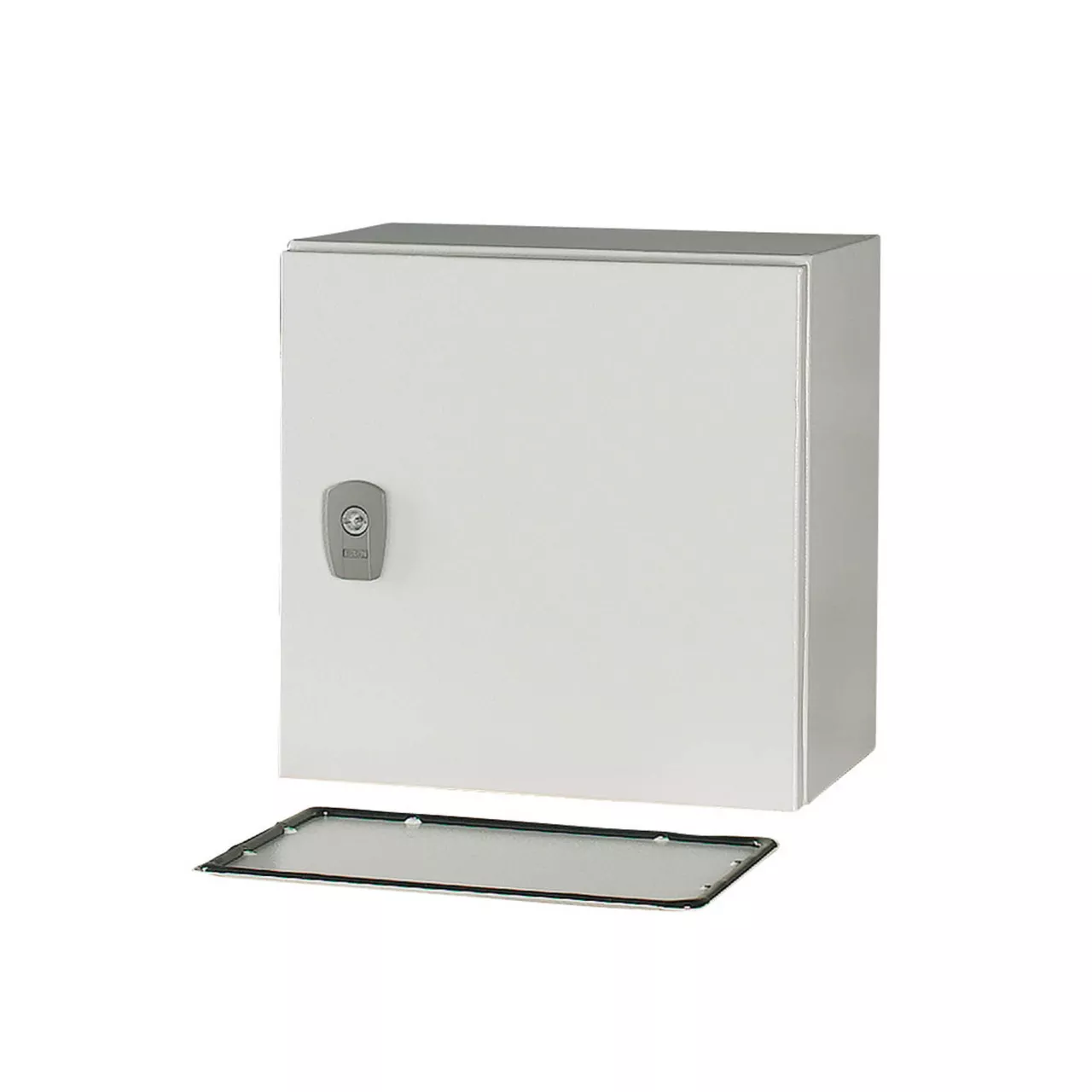 Wandaufbaugehäuse CS, Tür mit umlaufender Polyurethanschaumdichtung , Stoßfestigkeit IK10 nach EN 62262, eintürig, Türanschlag rechts, Öffnungswinkel 120°, Scharnierachsen mit Schnellwechseltechnik, Türprofilleiste mit Lochung im Abstand von 25 mm zur Befestigung von DIN-Tragschienen oder zur Befestigung von Kabelkanälen und -leitungen, genormtes Schließsystem mit Vorreiber, komplett aus Metall, mit Montageplatte aus Stahlblech, Lieferumfang: Schloss, 3 mm-Doppelstabschlüssel. Optionales Zubehör z.B. Drehkomfortgriff PHZ-A-ADD-ON mit Zylinderschloss PHZ-E10/30-GS. Ausgelegt gemäß IEC/EN 62208