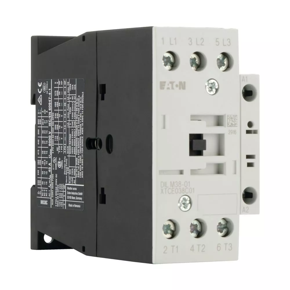 Stycznik, Zastosowanie: Styczniki do silników, Styczniki do 170 A, 3-biegunowy, Kategoria użytkowa: AC-1: Obciążenia nieindukcyjne lub obciążenia o małej indukcyjności, piece oporowe, NAC-3: Standardowe silniki indukcyjne AC: rozruch, wyłączanie w trakcie pracy, AC-4: Stand. silniki indukcyjne AC: rozruch, podłączanie, cofanie, praca spowolnion, Sposób podłączenia: Zaciski śrubowe, Uwagi: Nie nadaje się do silników o klasie sprawności IE3., Liczba biegunów: 3-biegunowy, Znamionowy prąd roboczy AC-3, 380 V 400 V: Ie = 38 A, Znamionowy prąd roboczy AC-1 Prąd cieplny umowny na wolnym powietrzu, 3-biegunowy, 50–60 Hz Otwarcie przy 40°C: Ith =Ie= 45 A, w obudowie: Ith= 36 A