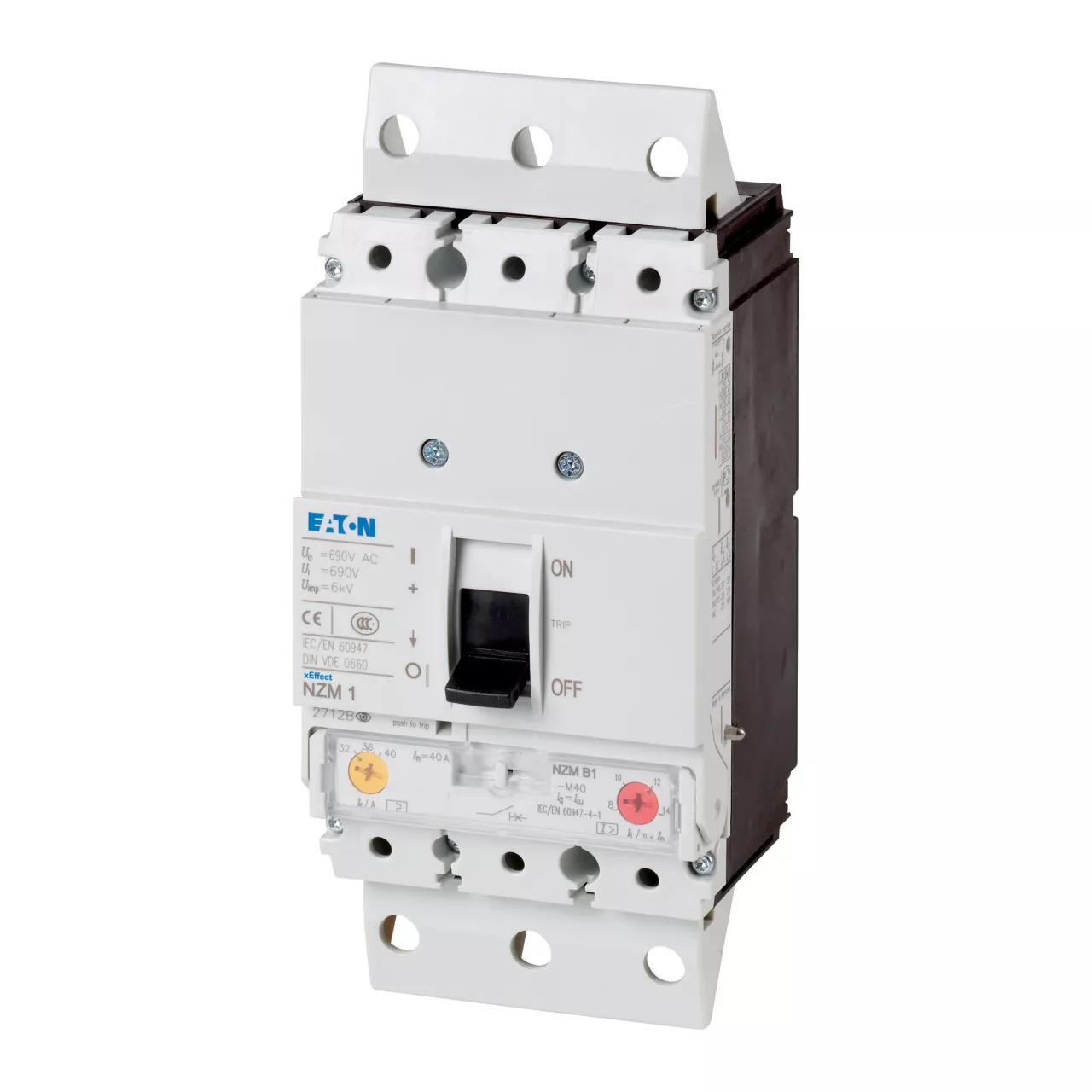 Vermogensautomaat NZM1, 3-polig, Schakelvermogen 400/415 V 50 Hz( Icu ): 36 kA, Nominale bedrijfsstroom = nominale ononderbroken stroom Nominale bedrijfsstroom = nominale ononderbroken stroom (ln = lu): 40 A, Installatietype: Plug-in-units, Raamklem, Standaard/goedkeuring: IEC, Beschermingsfunctie: Installatie- en kabelbeveiliging