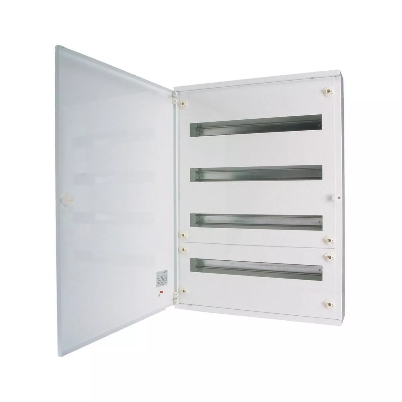 Kompletter BF-O-./..-C Oberputz-Flachverteiler, weiß RAL 9016, 24 Teilungseinheiten pro Reihe, 2-reihig, Höhe 450 mm, Breite 543 mm, Tiefe 140 mm, einschließlich Tür, Frontschilder, DIN-Schienen-Montagerahmen und neutrale/PE-Klemmen. Gehäuse: geschlossenes Design, einschließlich Rückwand, Rückwand als Befestigungsebene nutzbar, 2 Kabeldurchsteckflansche für schlanke Verteiler mit einer Breite von 24 Teilungseinheiten, oben, vorgeprägte Kabeleinführungsöffnungen unten, Klemmen auf Gehäuse vormontiert (kein Verlust von Teilungseinheiten). Mauerwanne mit Türrahmen, Rückwand als Befestigungsebene nutzbar, leicht ausbrechbare Kabeleinführungsöffnungen