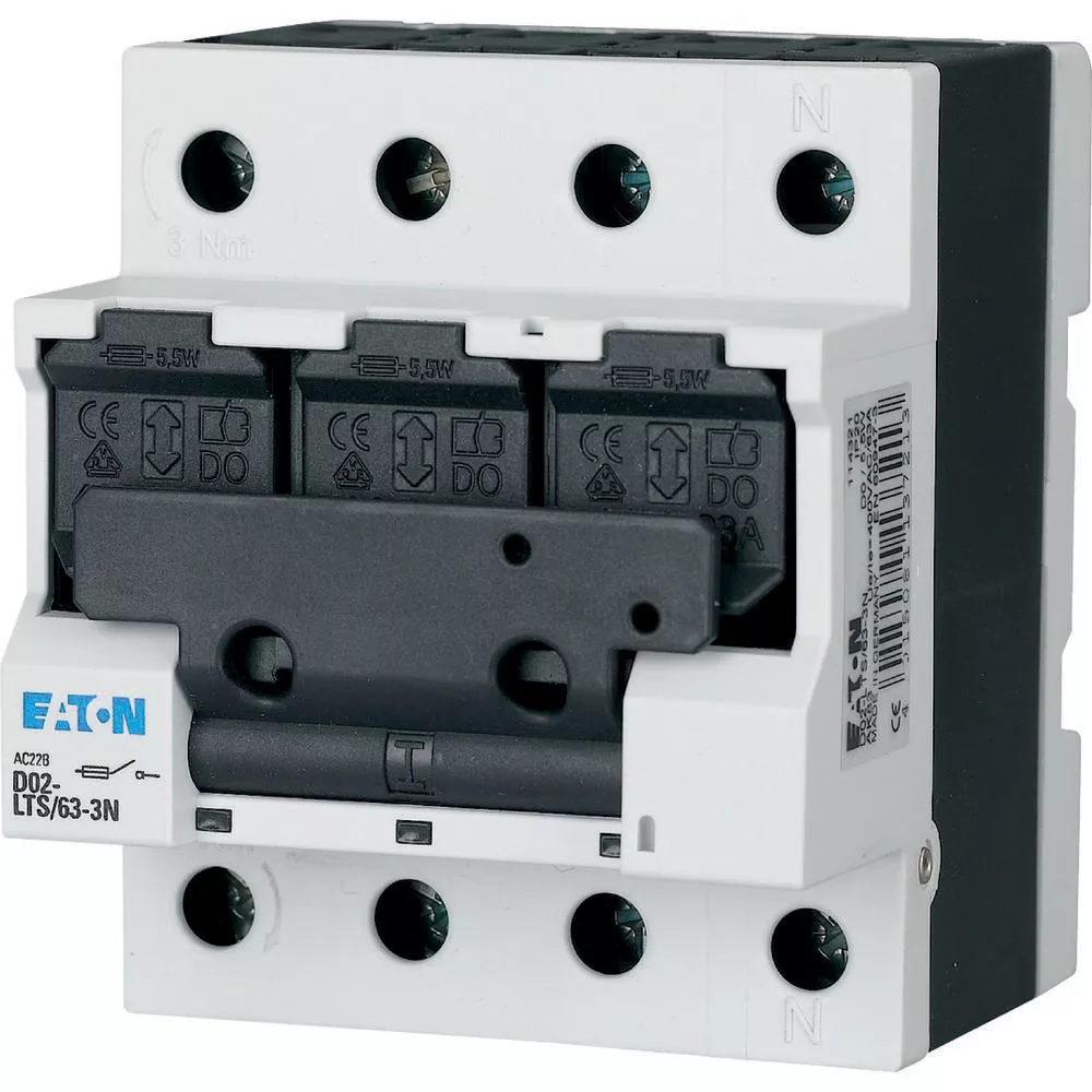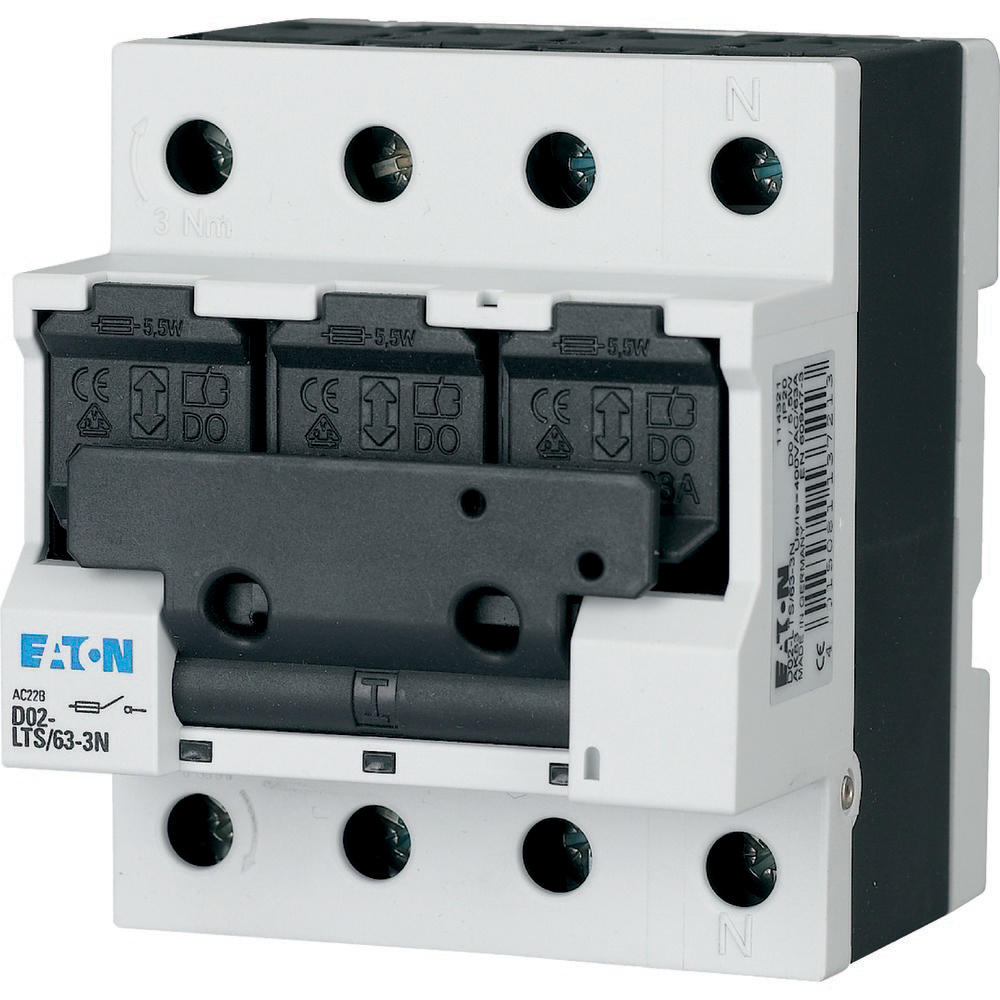 Bemessungsbetriebsspannung 400 V AC, geeignet für Sicherungseinsätze mit Betriebsklasse gG (gL), aM, nur 4 Platzeinheiten breit, mit FI verschienbar, Stromkodierung durch Hülsen-Passeinsätze, plombierbar, doppelte Leiterführung auf beiden Seiten möglich, Version mit Hilfsschalter D02-LTS/63-3-HK, Haltefedern für D01 Sicherungseinsätze oder zylindrische Einsätze 10 x 38 im Lieferumfang enthalten