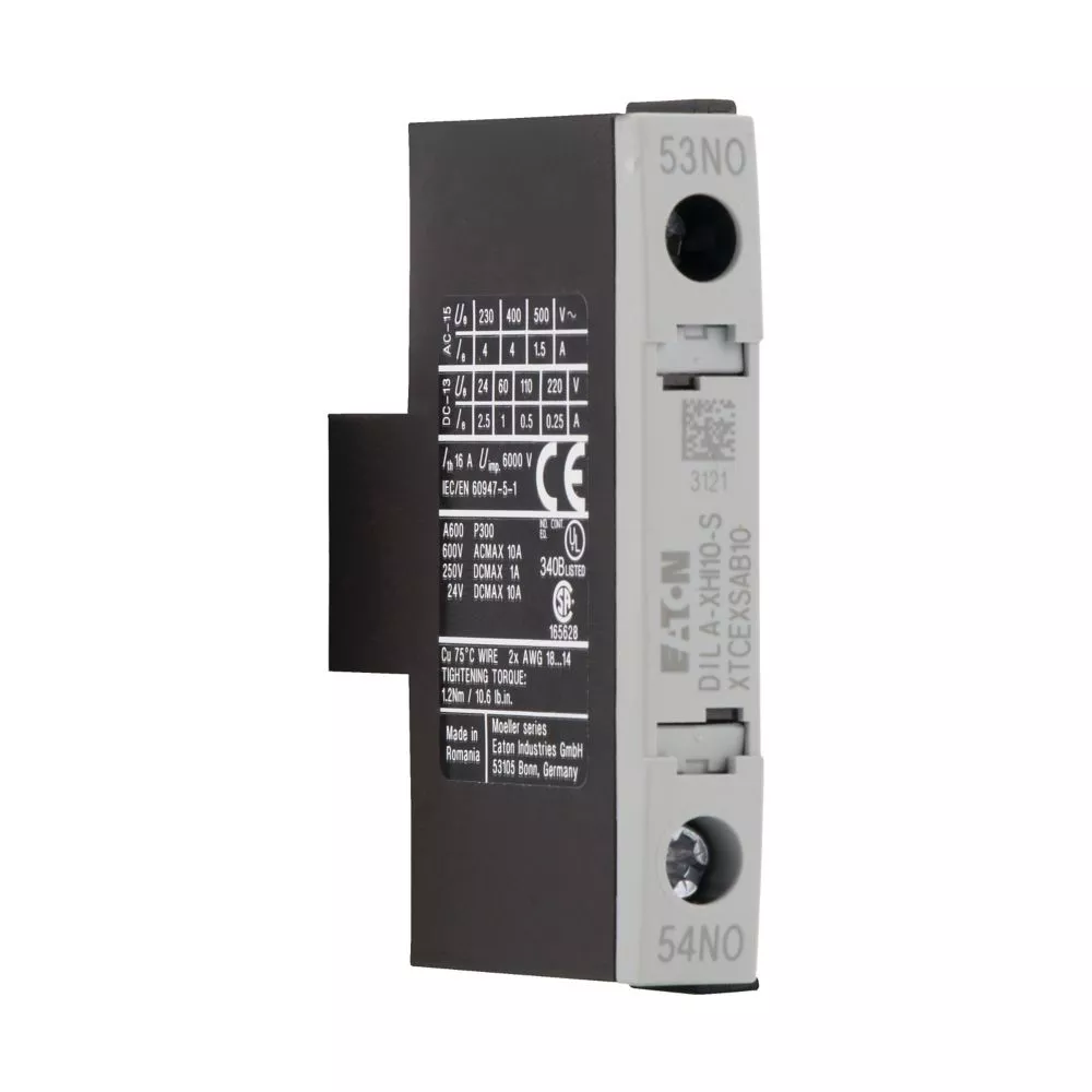 Hulpcontactblok, met onderling vergrendelde tegenoverliggende contacten, schakelelementen volgens EN 50005, versie E combinaties komen overeen met EN 50011 en hebben de voorkeur. De DC bekrachtigde relais DILA(C)-22 mag alleen worden gecombineerd met 2-polige hulpcontacten. Functie: voor standaard toepassingen, 1-polig, aansluittechniek: schroefklemmen, nominale bedrijfsstroom AC-15 220 V 230 V 240 V: Ie= 4 A, nominale bedrijfsstroom AC-15 380 V 400 V 415 V: Ie= 4 A, contacten no = normaal open: 1 no, type montage: zijdelings gemonteerd, voor gebruik met: DILM7…, DILM9…, DILM12…, DILM15…, DILMP20…, DILA…, type: Hulpcontacten zijmontage
