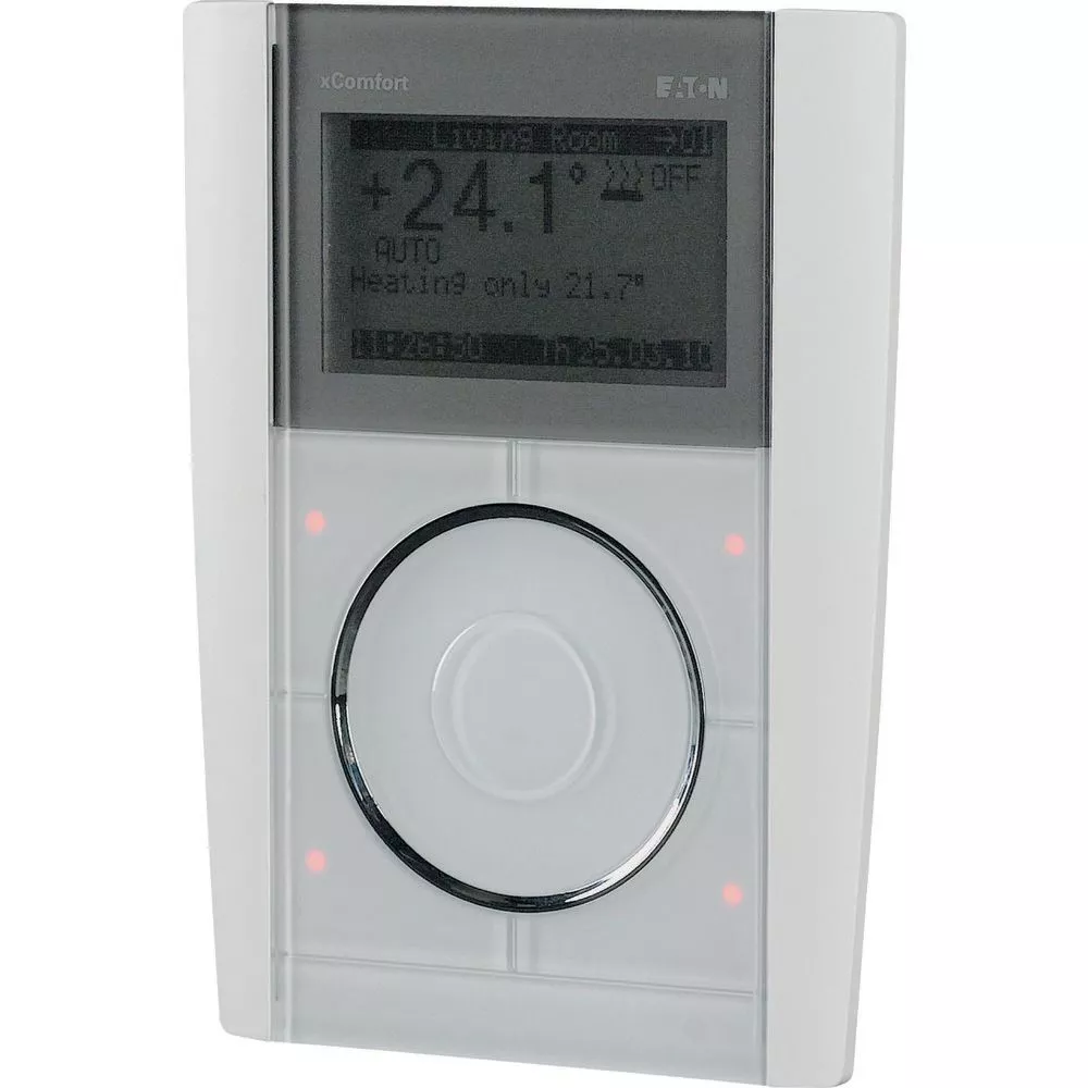 Der Room-Manager ist ein zentrales Anzeige- und Bediengerät, welches vorgegebene und geprüfte Anwendungen einer modernen Elektroinstallation wie z. B. Einzelraumheizung und -kühlung, Belüftung, Zeitfunktionen, Schaltung, Sicherheit usw. Der Room-Manager kommuniziert mit allen Geräten des Eaton-RF-Systems. Modernste Druckknopftechnologie ermöglicht eine einfache Bedienung vor Ort und die Einstellung aller Parameter (z. B. Zeitprogramm, Temperatur usw.) für den Benutzer. Das hintergrundbeleuchtete Grafikdisplay garantiert einfache und prägnante Darstellung der wichtigsten Informationen für den Endkunden. Die Installation erfolgt per Aufputzmontage.