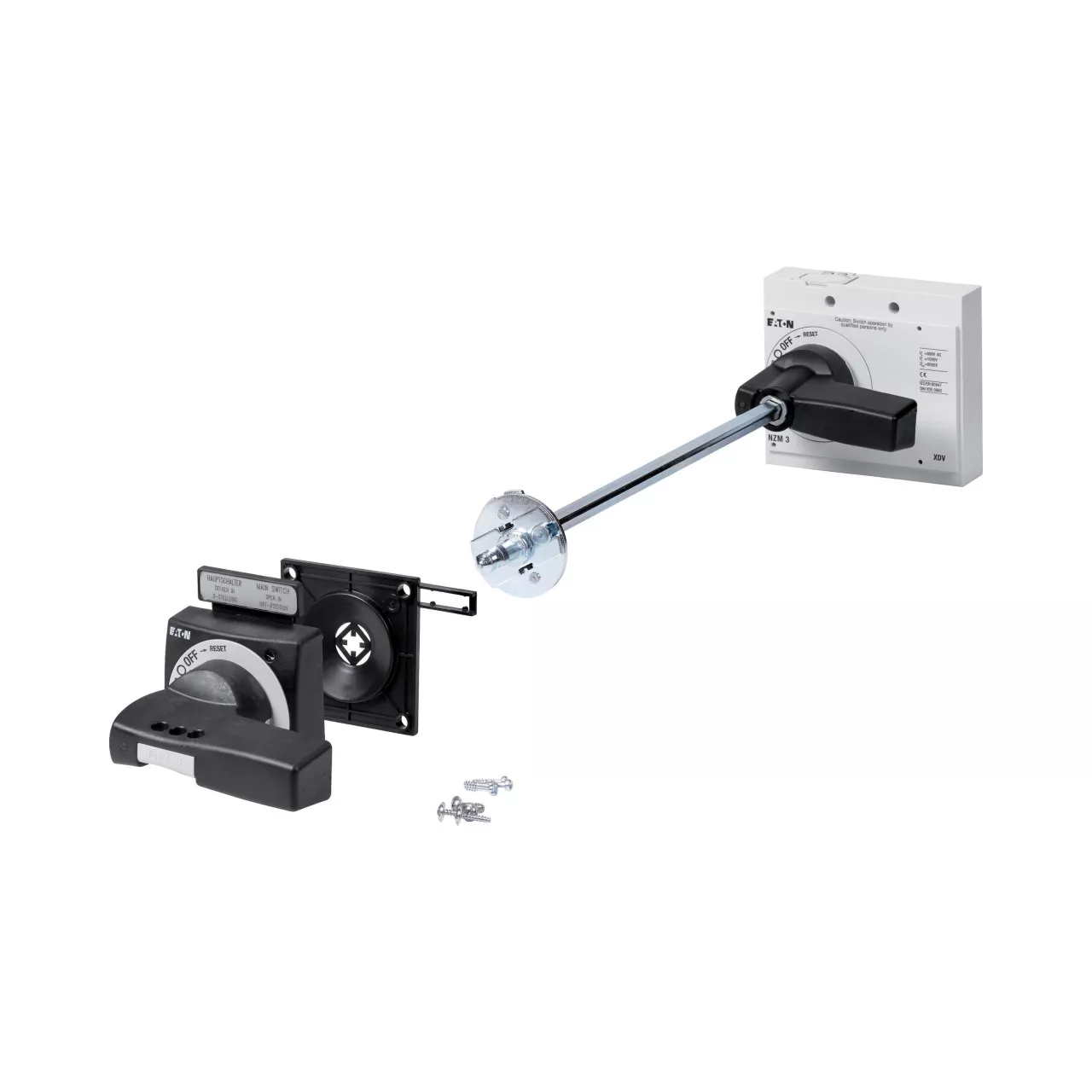 Optionele accessoires voor vermogensschakelaars uit de serie NZM bieden een uitgebreid assortiment toepassingsmogelijkheden voor wereldwijd gebruik. Modulaire functionele groepen maken de montage flexibel en eenvoudig. Opmerking: Deurkoppelingshandgreep met draaibediening. Extra draaigreep op schakelaar met bedieningswijze Bewuste handeling/Deliberate Action. Verlengingsas NZM…-XV6 voor montagediepte van 600 mm, asverlenging NZM1/2-XV4 bij NZM1 voor 400 mm inbouwdiepte. Externe waarschuwingsplaat/indicatieplaat in Duits/Engels. Zwart-gele bliksemschicht. Externe waarschuwingsplaat/markeringsplaat kan worden vastgeklikt