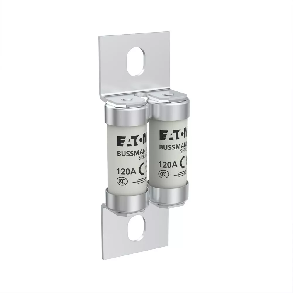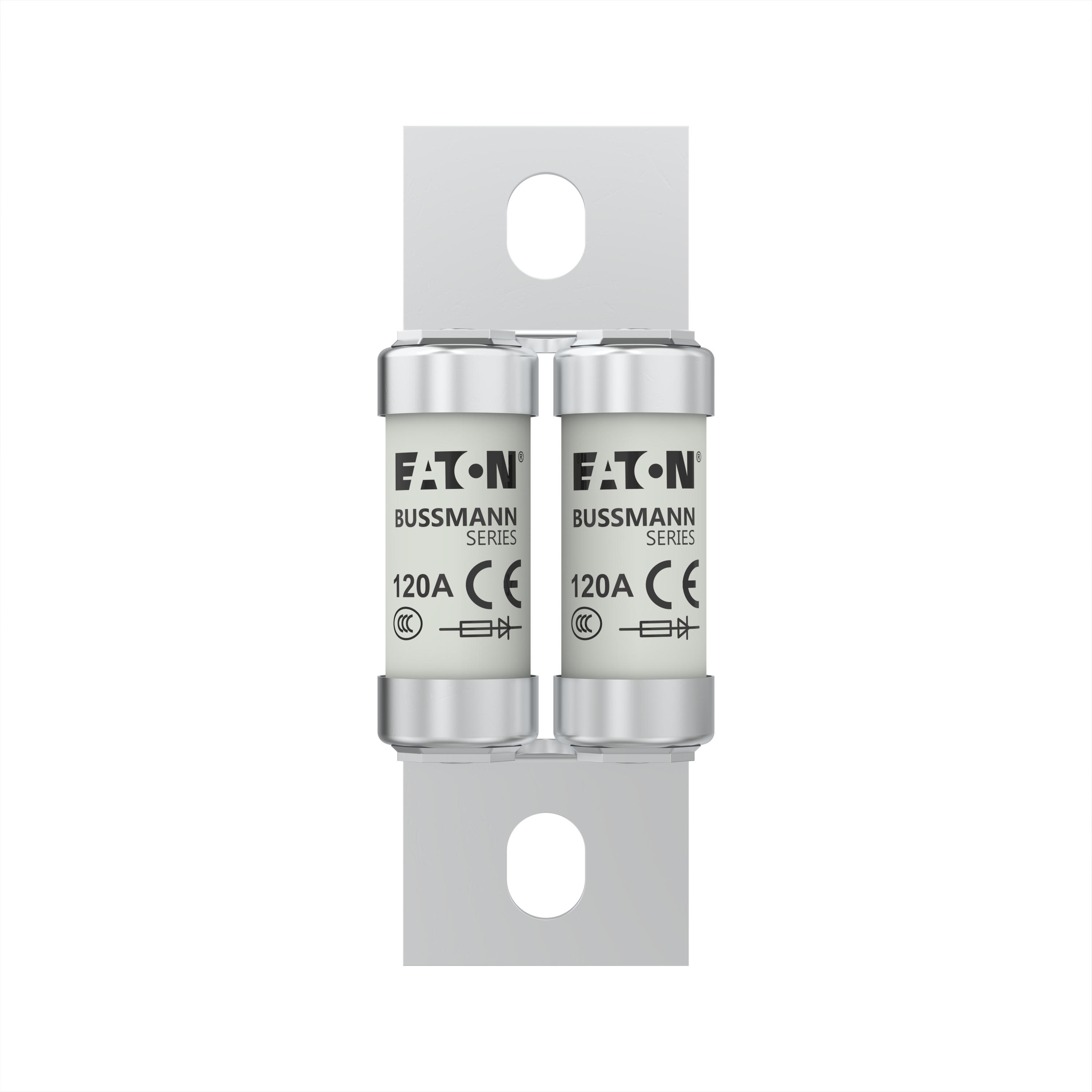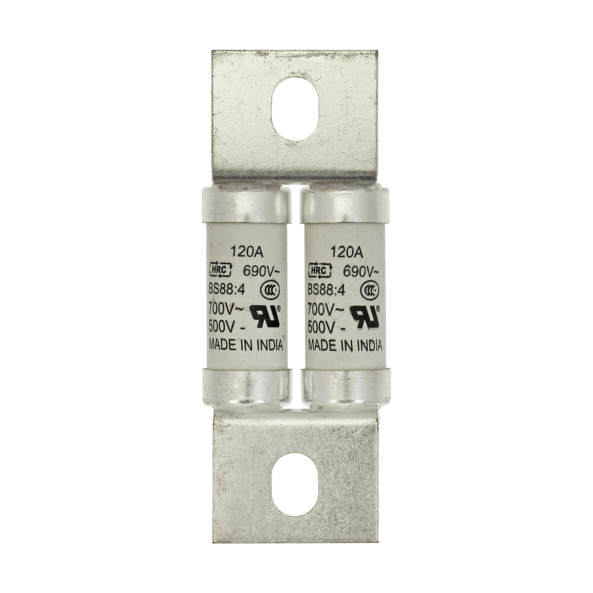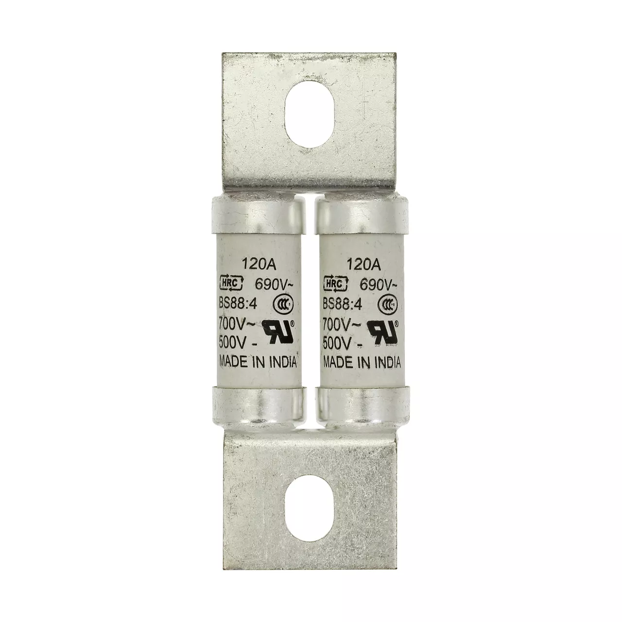 Sicherung, Sicherungseinsatz, superflink, 120 A, 690 V AC, 500 V DC, BS88, 37 x 94 mm, aR, BS, gekröpfte verschraubte Anschlussfahnen (Doppelzylinder), Gemeinsamer DC-Bus Schutz, Gleichstromantriebe, Leistungsumrichter/Gleichrichter und Anlasser mit reduzierter Spannung, BS88-4, IEC 60269-4, Ausschaltvermögen 200 kA, Optionale Zusatzausrüstung Sicherungshalter BH-1132