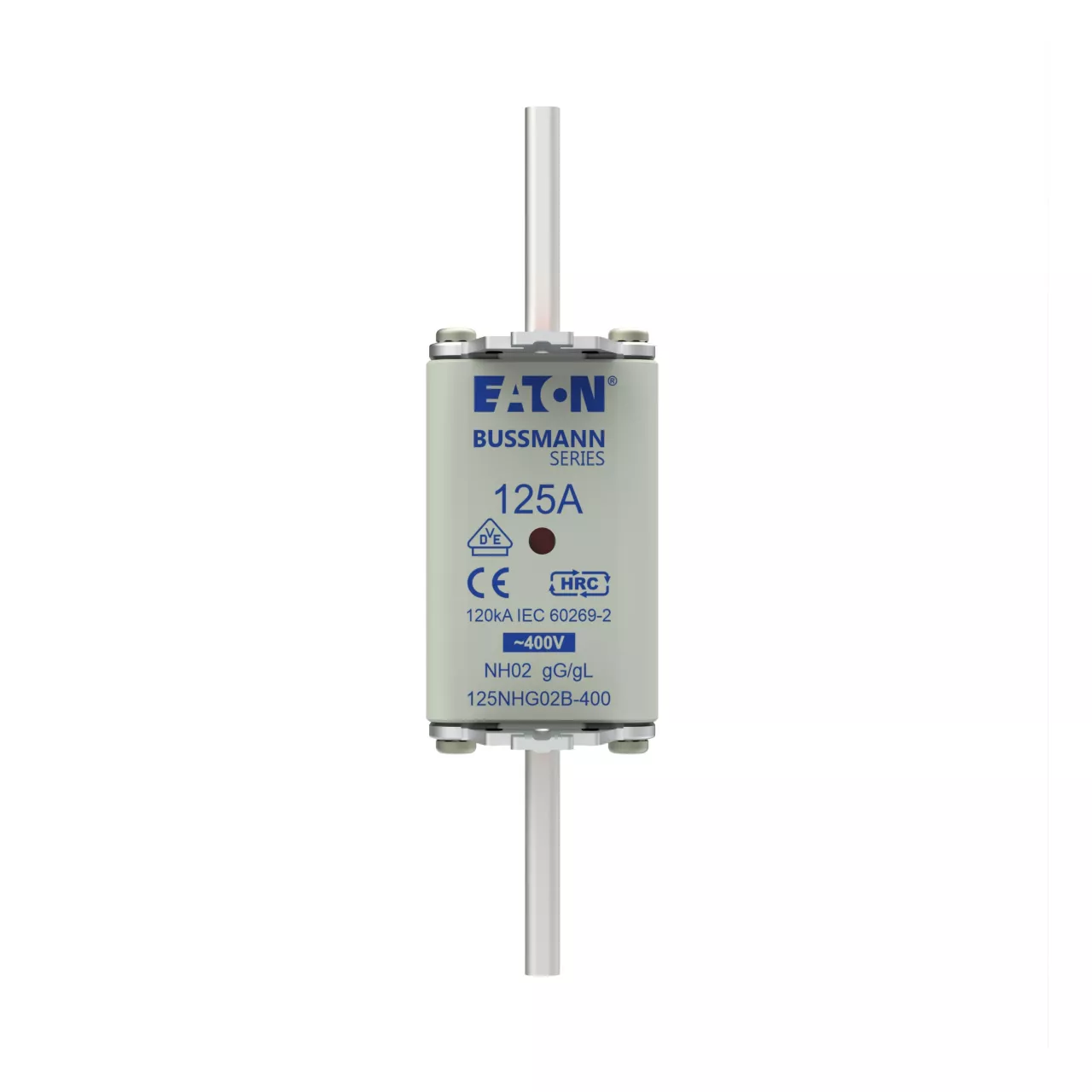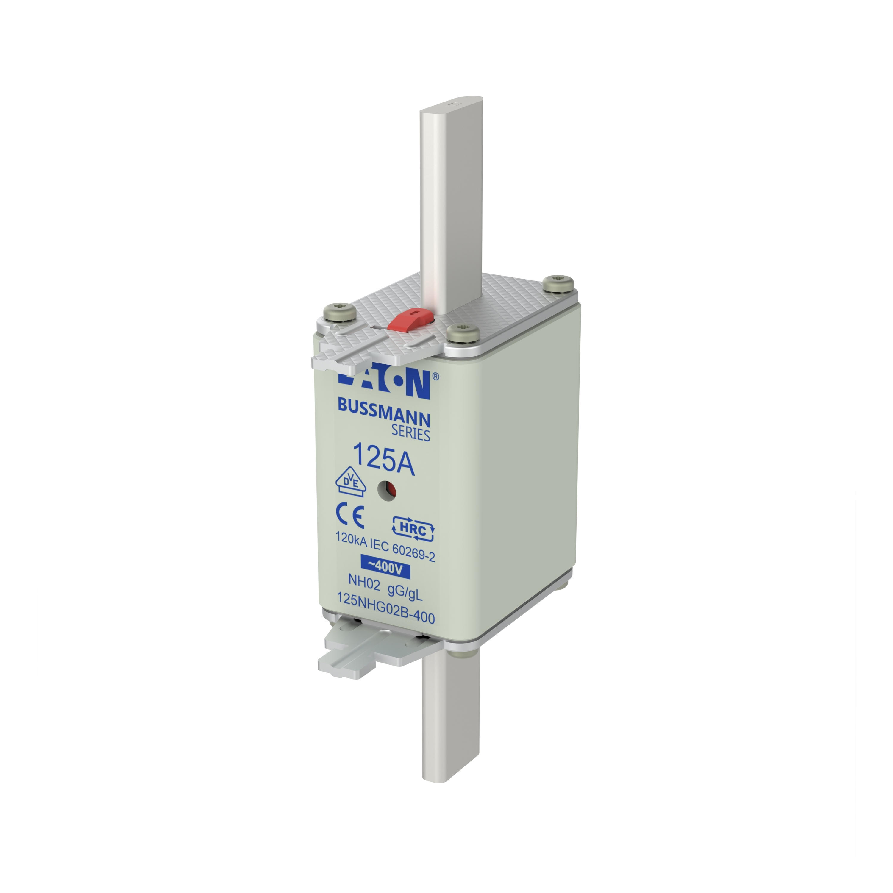 zekering, zekeringelement, Lage spanning, 125 A, AC 400 V, NH02, gL/gG, IEC, dubbel (combinatie-) meldersysteem, vierkant huis met mescontacten, onder spanning staande grepen, IEC 60269-2 zekeringsysteem A, DIN 43620, VDE 0636-2. Uitschakelvermogen 120 kA