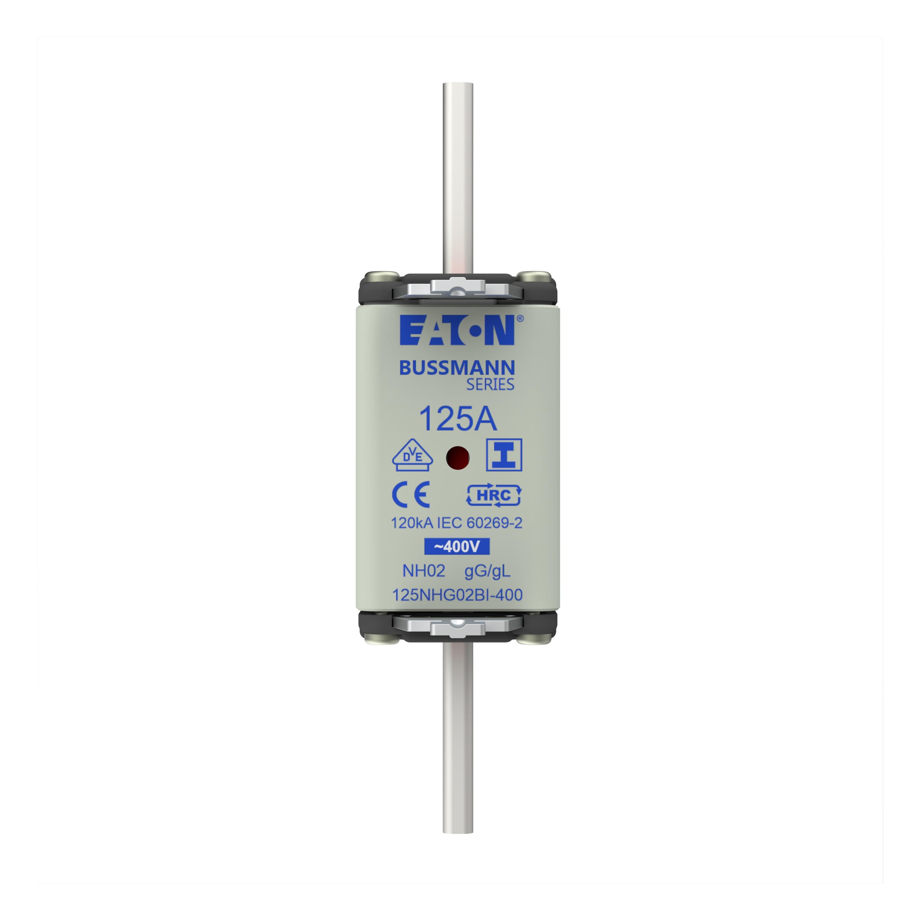 zekering, zekeringelement, Lage spanning, 125 A, AC 400 V, NH02, gL/gG, IEC, dubbel (combinatie-) meldersysteem, vierkant huis met mescontacten, geïsoleerde grepen, IEC 60269-2 zekeringsysteem A, DIN 43620, VDE 0636-2. Uitschakelvermogen 120 kA