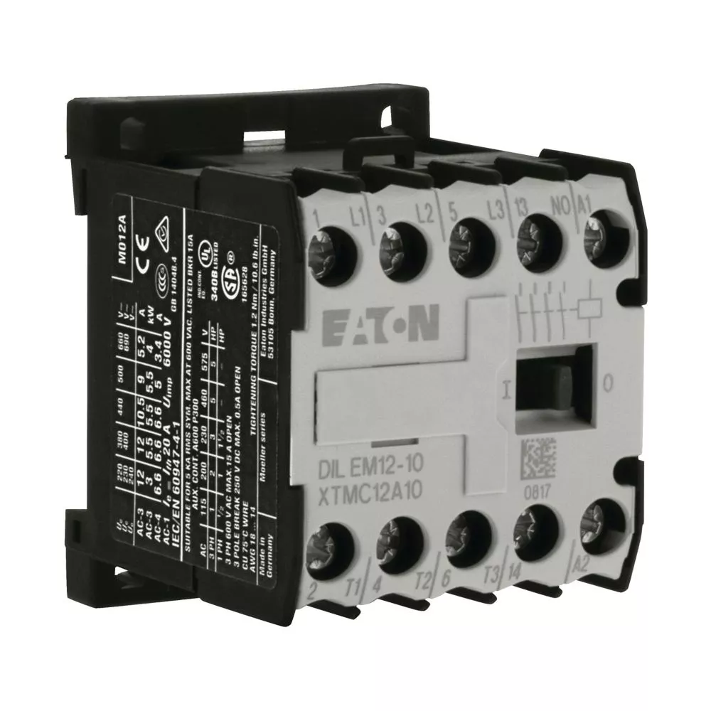 Leistungsschütz, Anwendung: Leistungsschütze für Motoren, Kleinschütze für Motoren und ohmsche Lasten, Leistungsschütze DILEM, Gebrauchskategorie: AC-1: Nicht oder leicht induktive Lasten, Widerstandsöfen, NAC-3: Käfigläufermotoren: anlassen, während Betrieb ausschalten, AC-4: Käfigläufermotoren: anlassen, Einstecken, reversieren, Tippen, Anschlusstechnik: Schraubklemmen, Beschreibung: Mit Hilfskontakt, Anzahl der Pole: 3-polig, Bemessungsbetriebsstrom AC-3, 380 V, 400 V: Ie= 12 A, Bemessungsbetriebsstrom AC-1 konventioneller thermischer Strom, 3-polig, 50 - 60 Hz Offen bei 40 °C: Ith =Ie= 22 A, gekapselt: Ith = 16 A