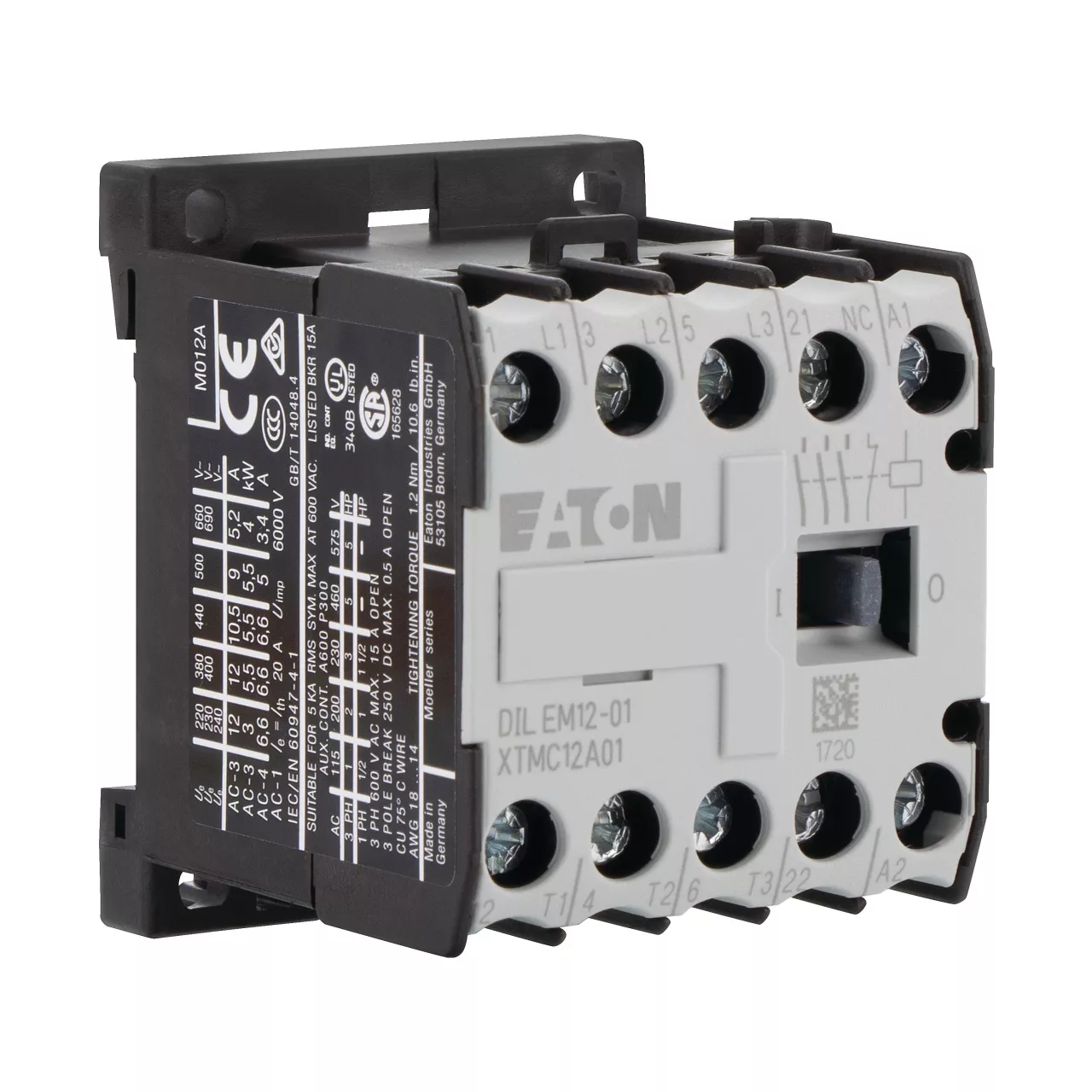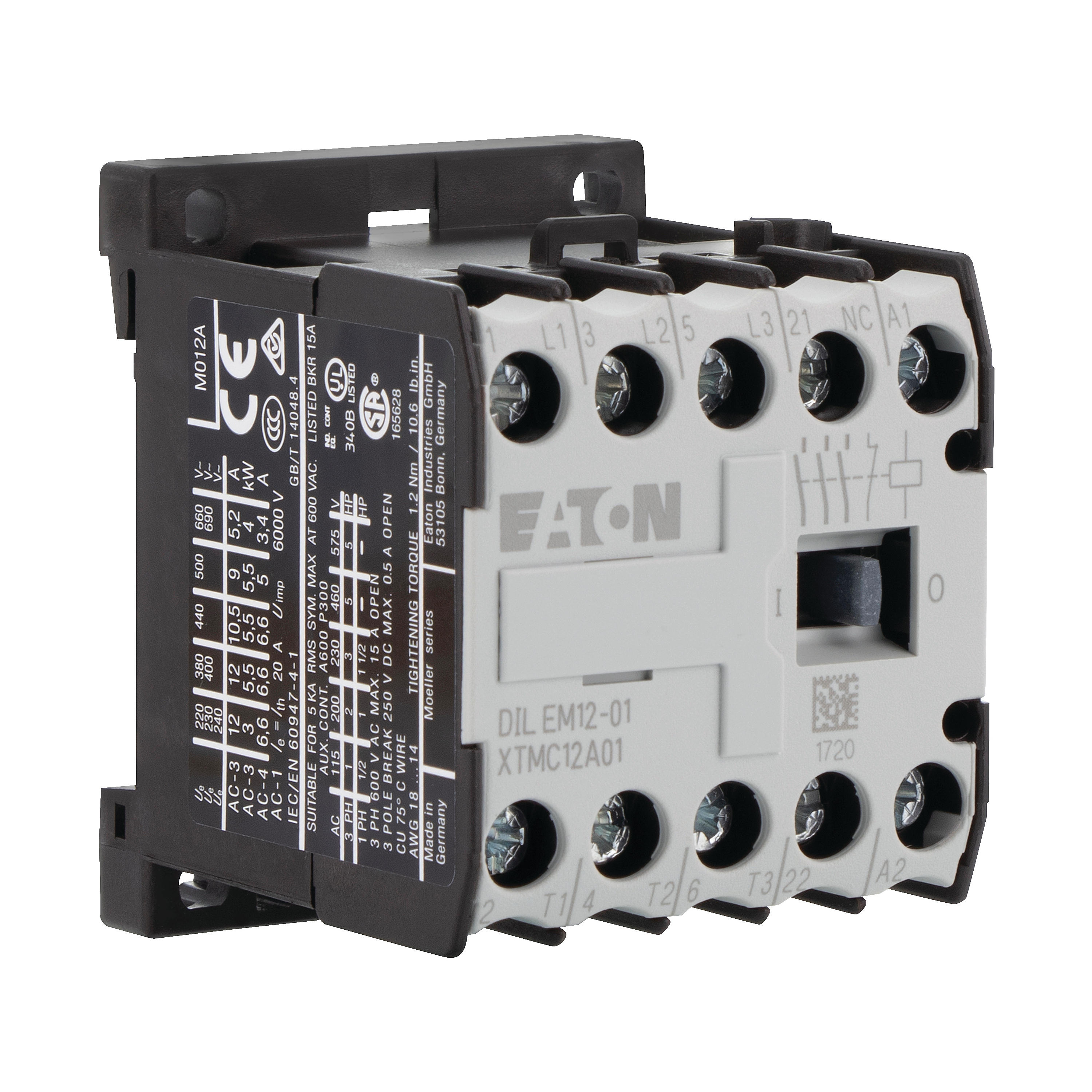 Leistungsschütz, Anwendung: Leistungsschütze für Motoren, Kleinschütze für Motoren und ohmsche Lasten, Leistungsschütze DILEM, Gebrauchskategorie: AC-1: Nicht oder leicht induktive Lasten, Widerstandsöfen, NAC-3: Käfigläufermotoren: anlassen, während Betrieb ausschalten, AC-4: Käfigläufermotoren: anlassen, Einstecken, reversieren, Tippen, Anschlusstechnik: Schraubklemmen, Beschreibung: Mit Hilfskontakt, Anzahl der Pole: 3-polig, Bemessungsbetriebsstrom AC-3, 380 V, 400 V: Ie= 12 A, Bemessungsbetriebsstrom AC-1 konventioneller thermischer Strom, 3-polig, 50 - 60 Hz Offen bei 40 °C: Ith =Ie= 22 A, gekapselt: Ith = 16 A