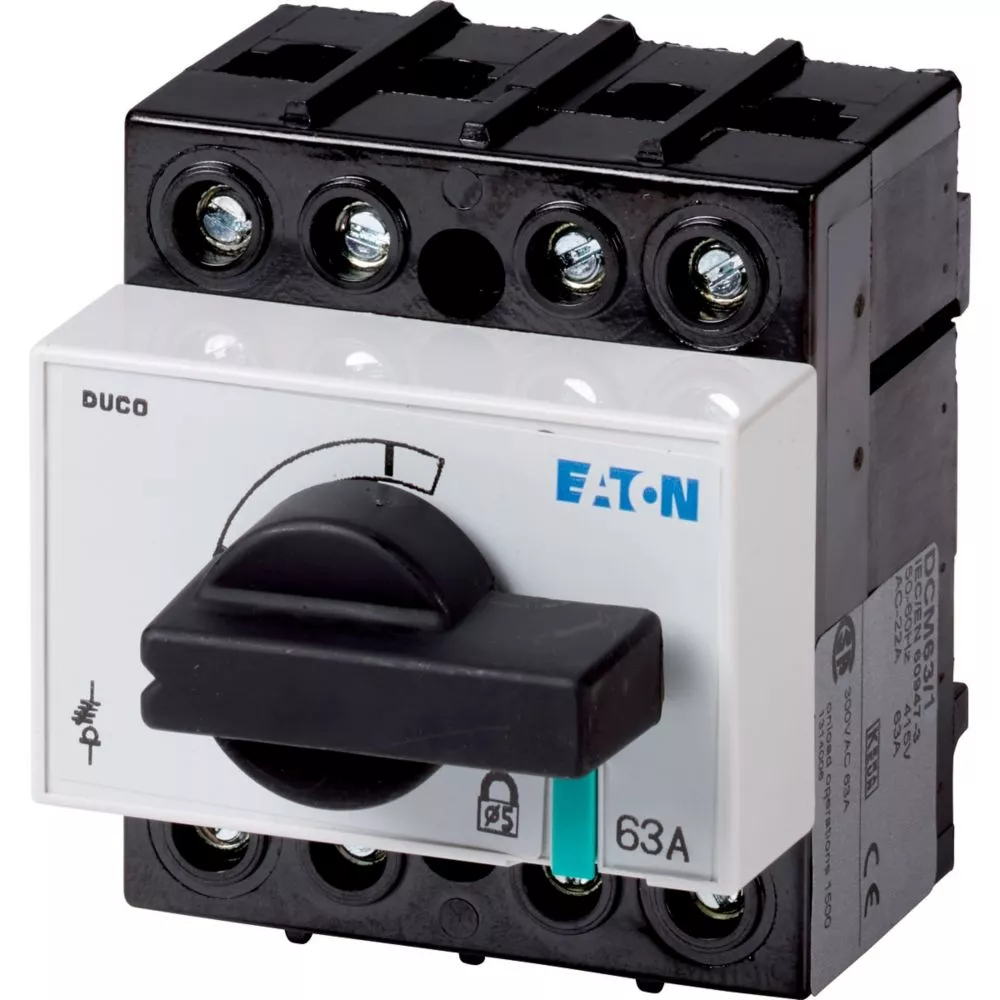 Rozłącznik izolacyjny, Zacisk śrubowy: Rozłącznik izolacyjny, Wyłącznik główny, wyłącznik serwisowy, Odniesienie grupy części DCM, Z czarnym uchwytem obrotowym i osią napędu, 3-biegunowy + SN (bezpośredni), Uwagi: 1 kłódka, 5 mm, Element blokujący: Możliwość zablokowania w położeniu 0 (Wył.), Stopień ochrony: IP20, Projekt: montaż powierzchniowy, Moc znamionowa AC-23A, 50 - 60 Hz 400 V: P = 30 kW, Znamionowy prąd ciągły: Iu = 63 A, Sposób podłączenia: Połączenie pionowe, Normy: IEC/EN 60947, VDE 0660, IEC/EN 60204, Rozłącznik izolacyjny zgodnie z normą IEC/EN 60947-3