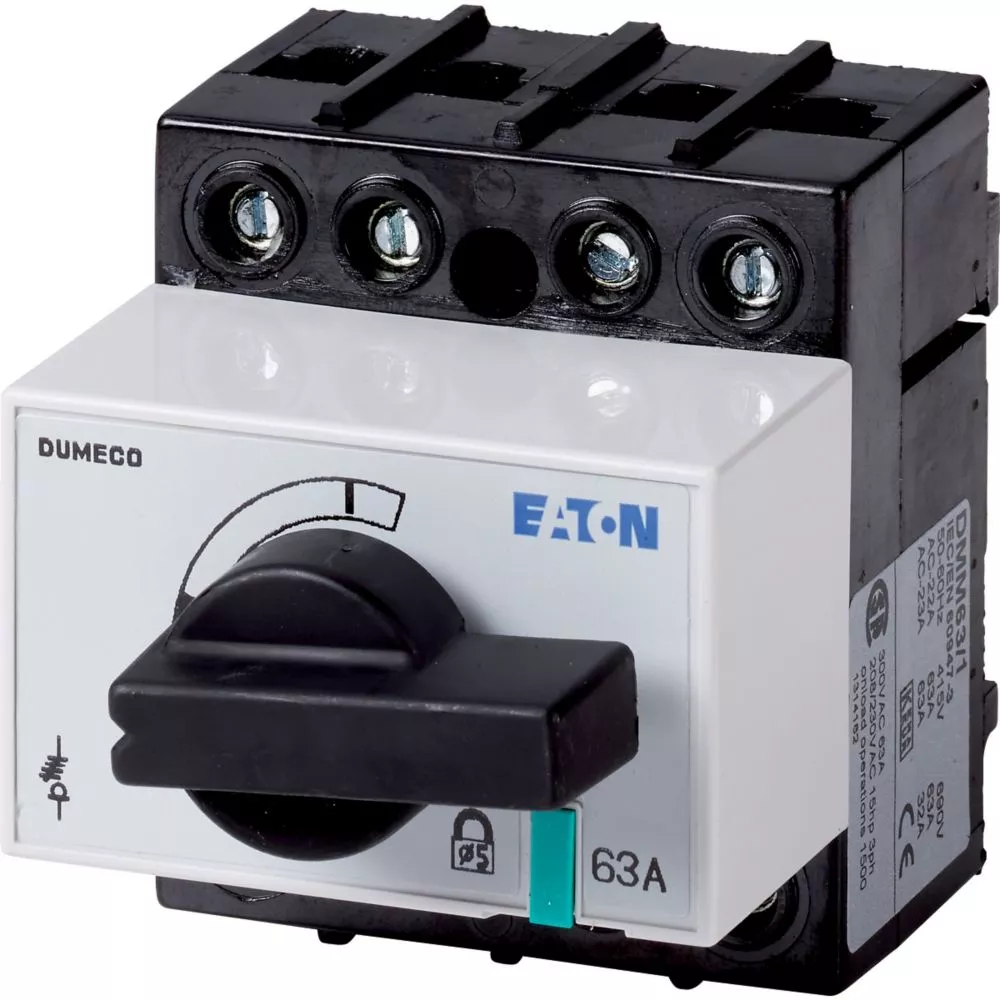 Rozłącznik izolacyjny, Zacisk śrubowy: Rozłącznik izolacyjny, Wyłącznik główny, wyłącznik serwisowy, Odniesienie grupy części DMM, Z czarnym uchwytem obrotowym i osią napędu, Informacje dotyczące dostarczonego sprzętu: styk pomocniczy montowany przez użytkownika., 3-biegunowy + SN (bezpośredni), Uwagi: 1 kłódka, 5 mm, Element blokujący: Możliwość zablokowania w położeniu 0 (Wył.), Stopień ochrony: IP20, Projekt: montaż powierzchniowy, Moc znamionowa AC-23A, 50 - 60 Hz 400 V: P = 30 kW, Znamionowy prąd ciągły: Iu = 63 A, Sposób podłączenia: Połączenie pionowe, Normy: IEC/EN 60947, VDE 0660, IEC/EN 60204, Rozłącznik izolacyjny zgodnie z normą IEC/EN 60947-3