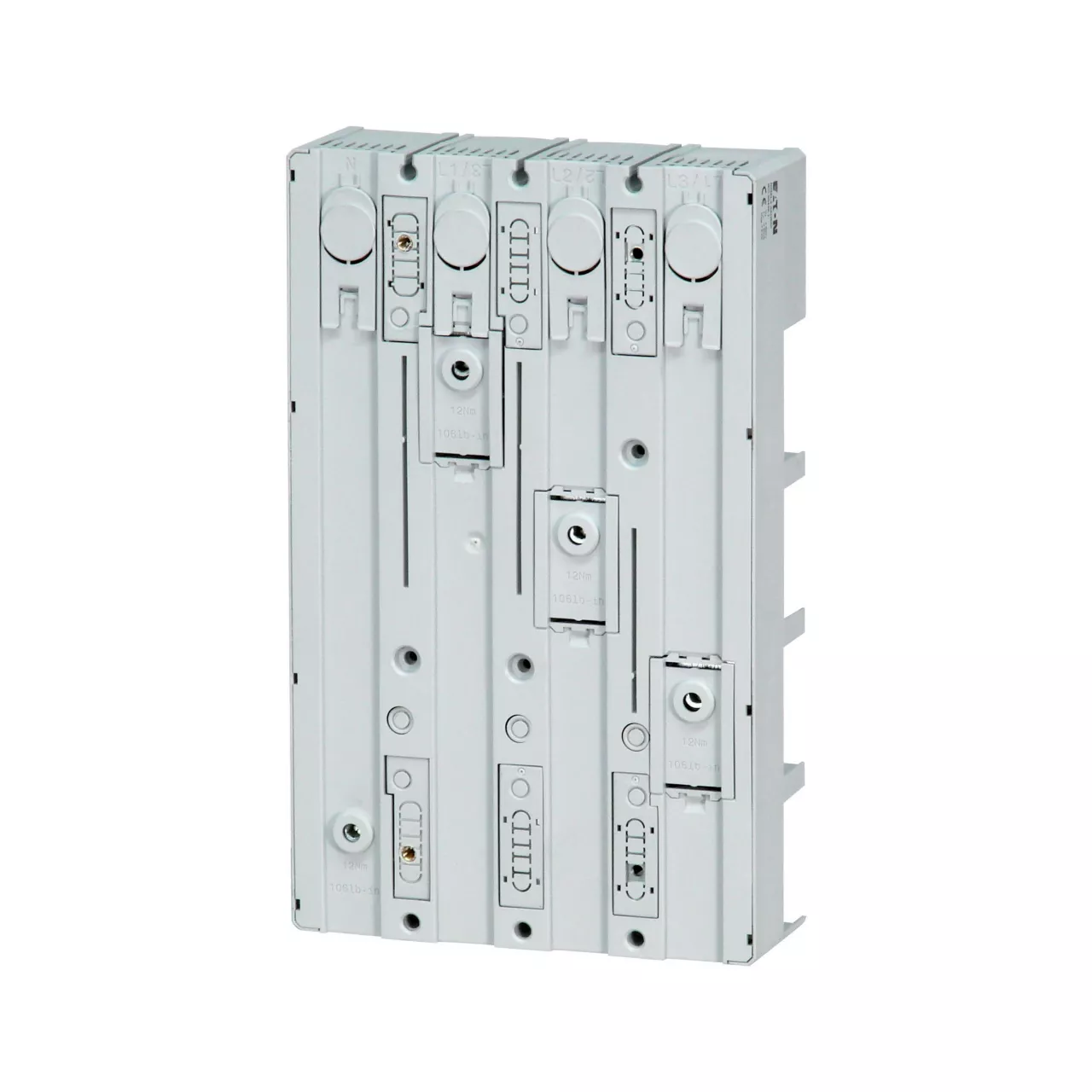 Typgeprüfter Sammelschienenadapter für Leistungsschalter NZM und Lasttrennschalter N, für Aufputzmontage auf Kupfer-Sammelschienen 12 bis 30 x 5 bis 10, Doppel-T und Dreifach-T-Profil, Bemessungsbetriebsstrom Ie=630 A, kann für NZM3, PN3, N(S)3, NZM3(-4), PN3(-4), N3(-4) verwendet werden, Adapterbreite = 185 mm, Bemessungsbetriebsspannung Ue=690 VAC, Schraubanschluss an der Sammelschiene mit 5 mm oder 10 mm Dicke, Kabelanschluss unten, Temperaturbeständig bis 120 °C, selbstverlöschend UL 94, Bahnwiderstand CTI 200, Anzahl der Pole = 4, Sammelschienenabstand = 60 mm, verwendbar in Verbindung mit Sammelschienensystem SASY 60i