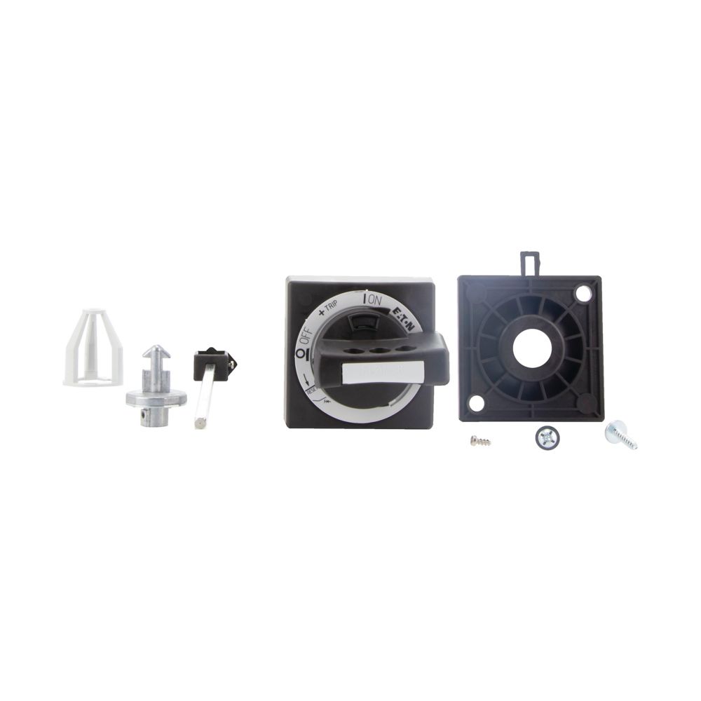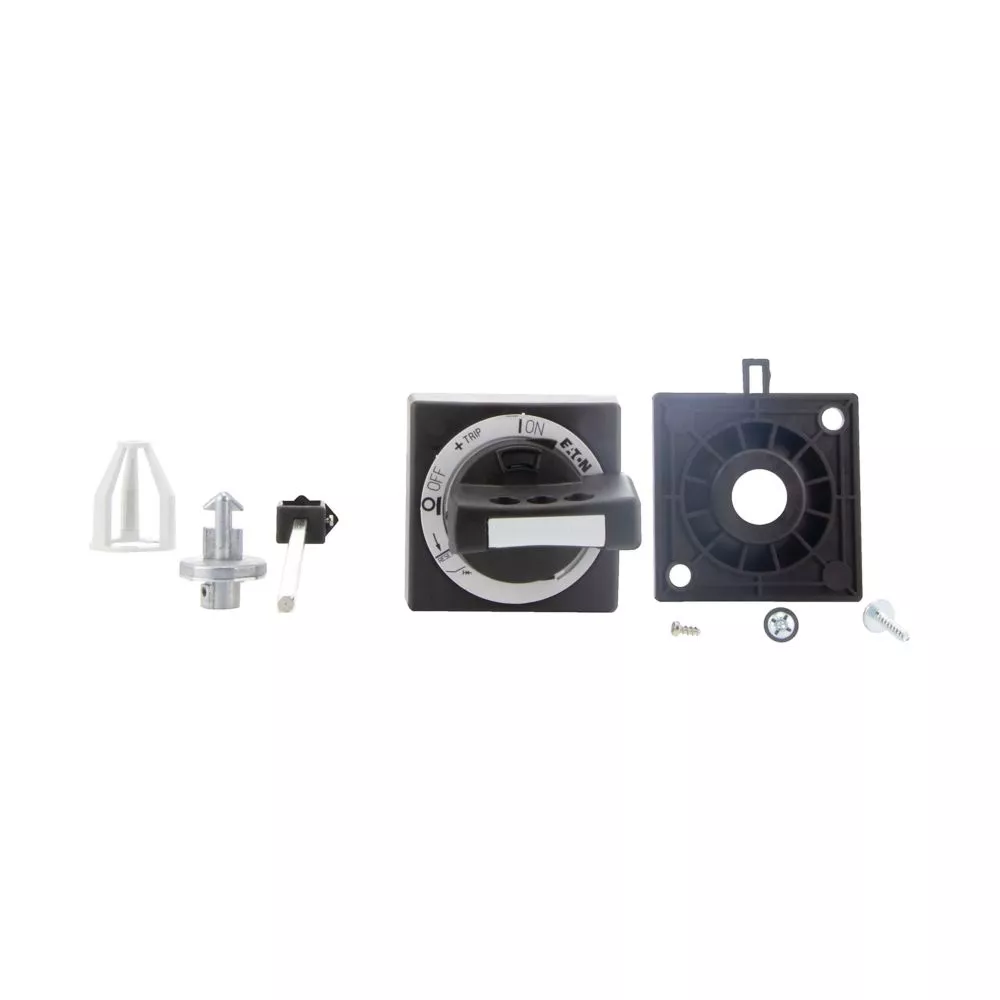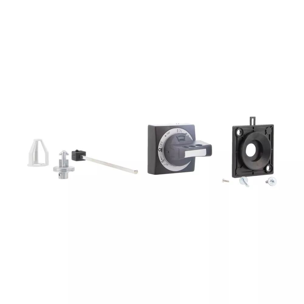 Uchwyt obrotowy sprzęgła drzwi do użytku jako wyłącznik główny zgodnie z normą EN 60204 w tablicach rozdzielczych MCC z wbudowanym układem PKE obróconym o 90 stopni, z wtykowym przedłużaczem PKZ0-XAH, możliwość docięcia na żądaną długość przy głębokości montażu 100…200 mm. Standardowo w zestawie znajduje się kosz z wałkiem przedłużającym. Z położeniem przełącznika ZAŁ./WYŁ. i „+” (wyzwolenie), możliwość zablokowania w położeniu wył. za pomocą 3 kłódek o grubości pałąka 4 – 8