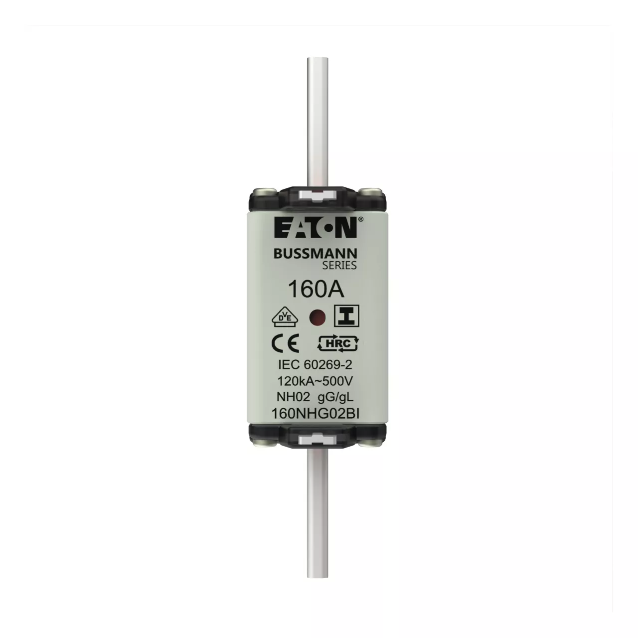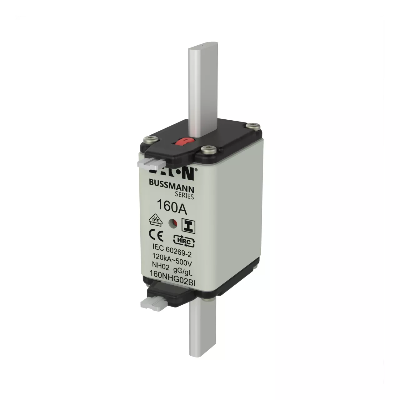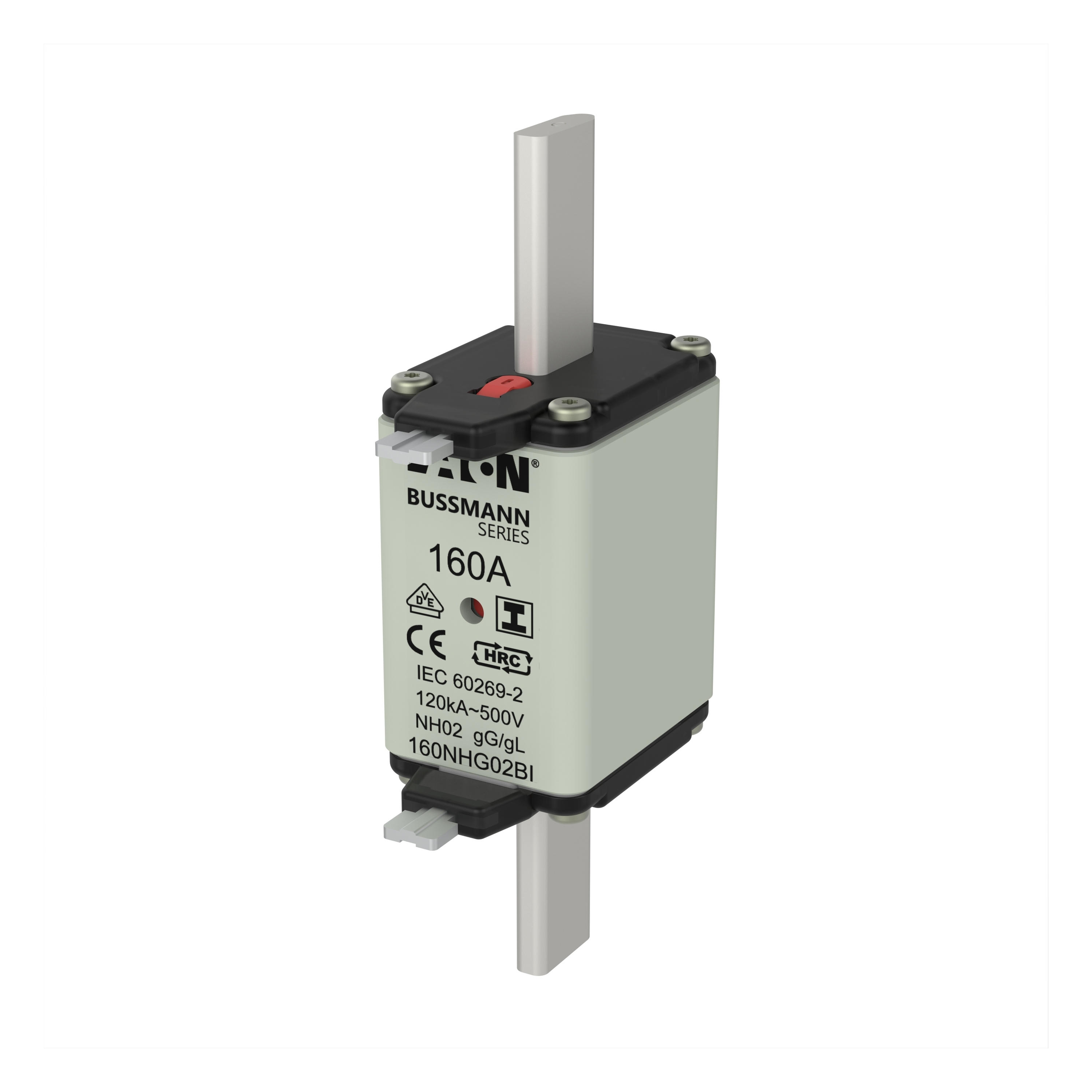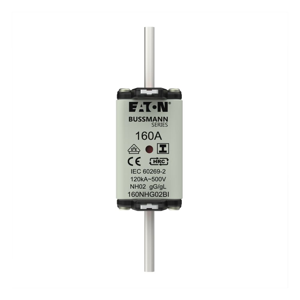 zekering, zekeringelement, Lage spanning, 160 A, AC 500 V, NH02, gL/gG, IEC, dubbel (combinatie-) meldersysteem, vierkant huis met mescontacten, geïsoleerde grepen, IEC 60269-2 zekeringsysteem A, DIN 43620, VDE 0636-2, uitschakelvermogen 120 kA