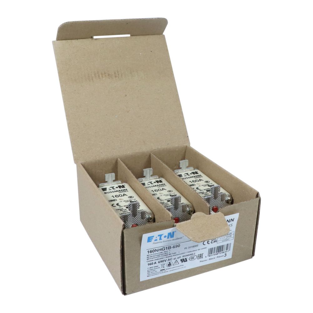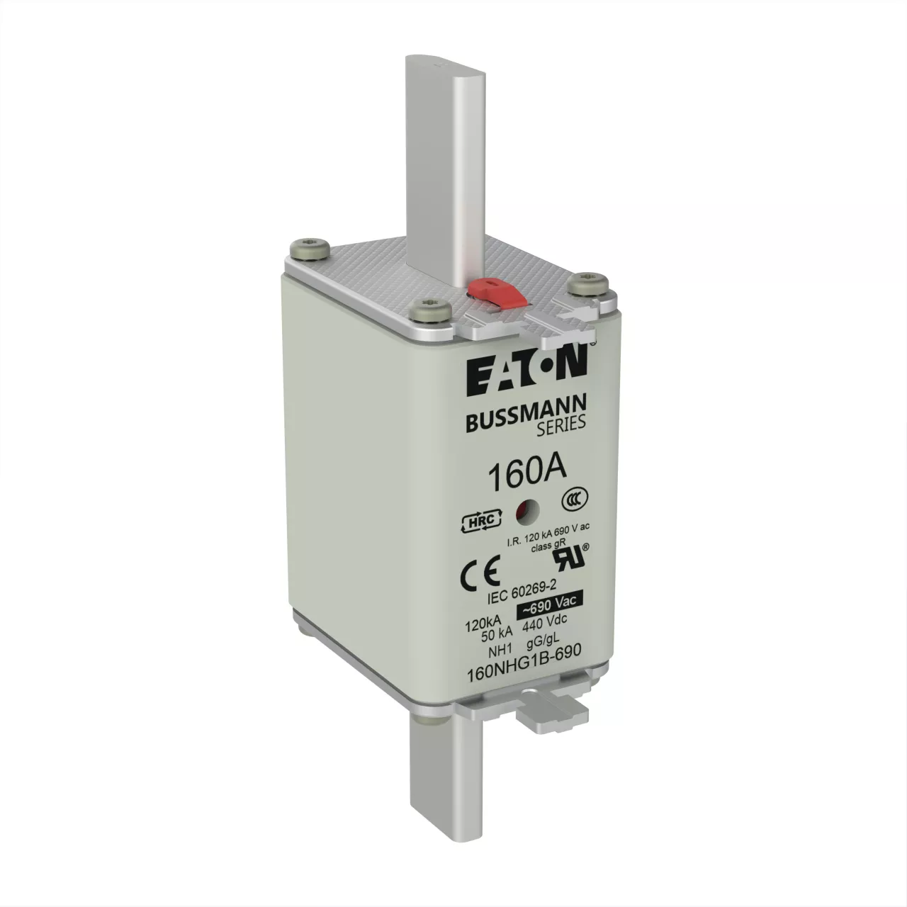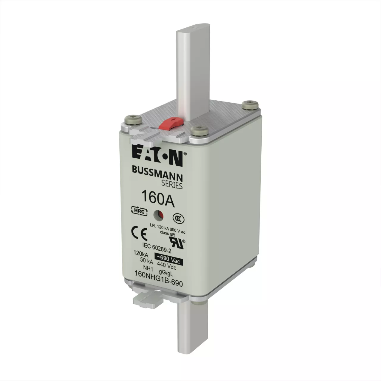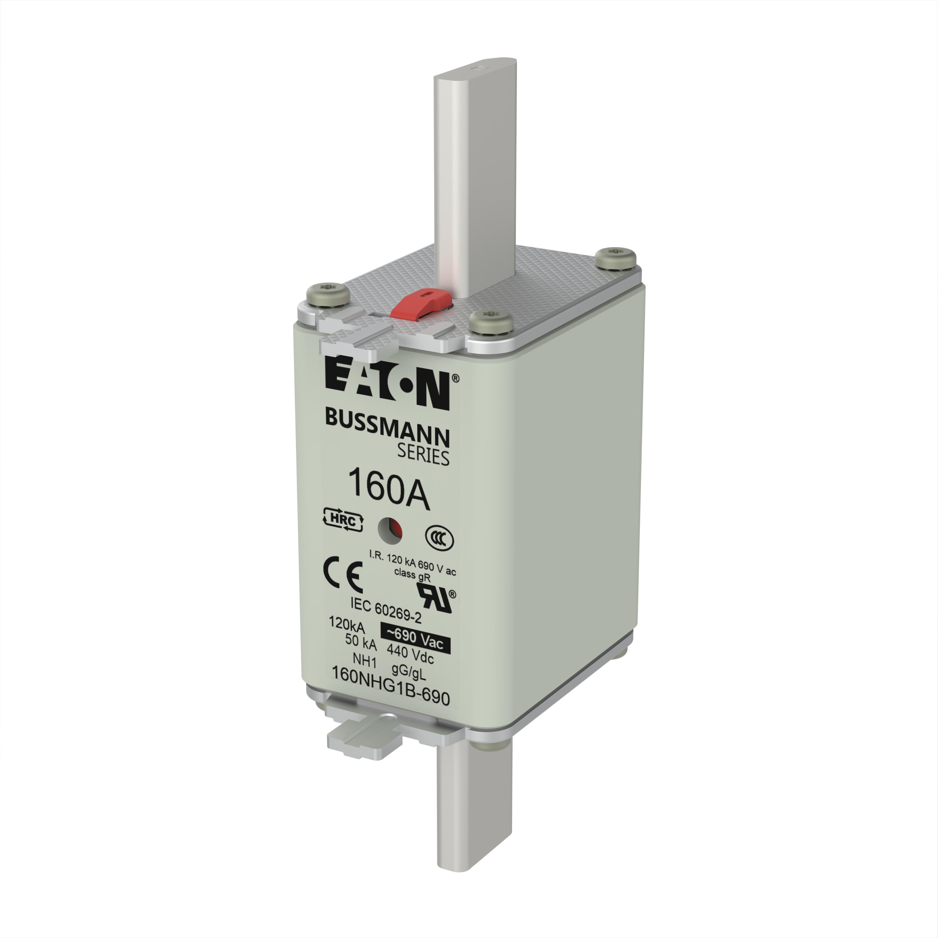 Fuse, Fuse-link, low voltage, 160 A, AC 690 V, NH1, gL/gG, IEC, dual indicator, square body with knife blade contacts, live gripping lugs, IEC 60269-2 fuse system A, DIN 43620, VDE 0636-2, Breaking Capacity 120 kA, Optional accessories fuse-holder SD1-D
