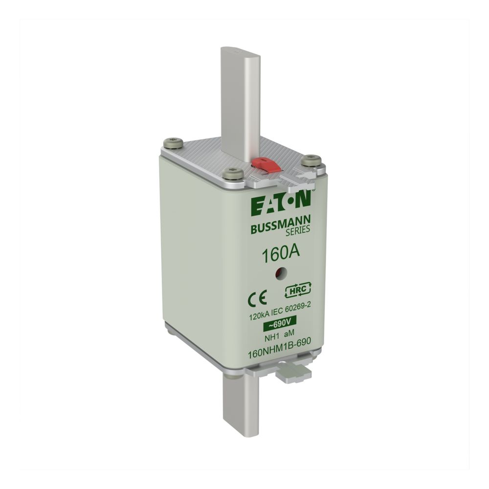 Bezpiecznik, wkładka bezpiecznikowa, niskie napięcie, 160 A, AC 690 V, NH1, aM, IEC, Układ podwójnego sygnalizatora (kombinacja), korpus kwadratowy ze stykami nożowymi, ruchome uchwyty, IEC 60269-2 układ bezpiecznikowy A, DIN 43620, VDE 0636-2. Zdolność wyłączania 120 kA