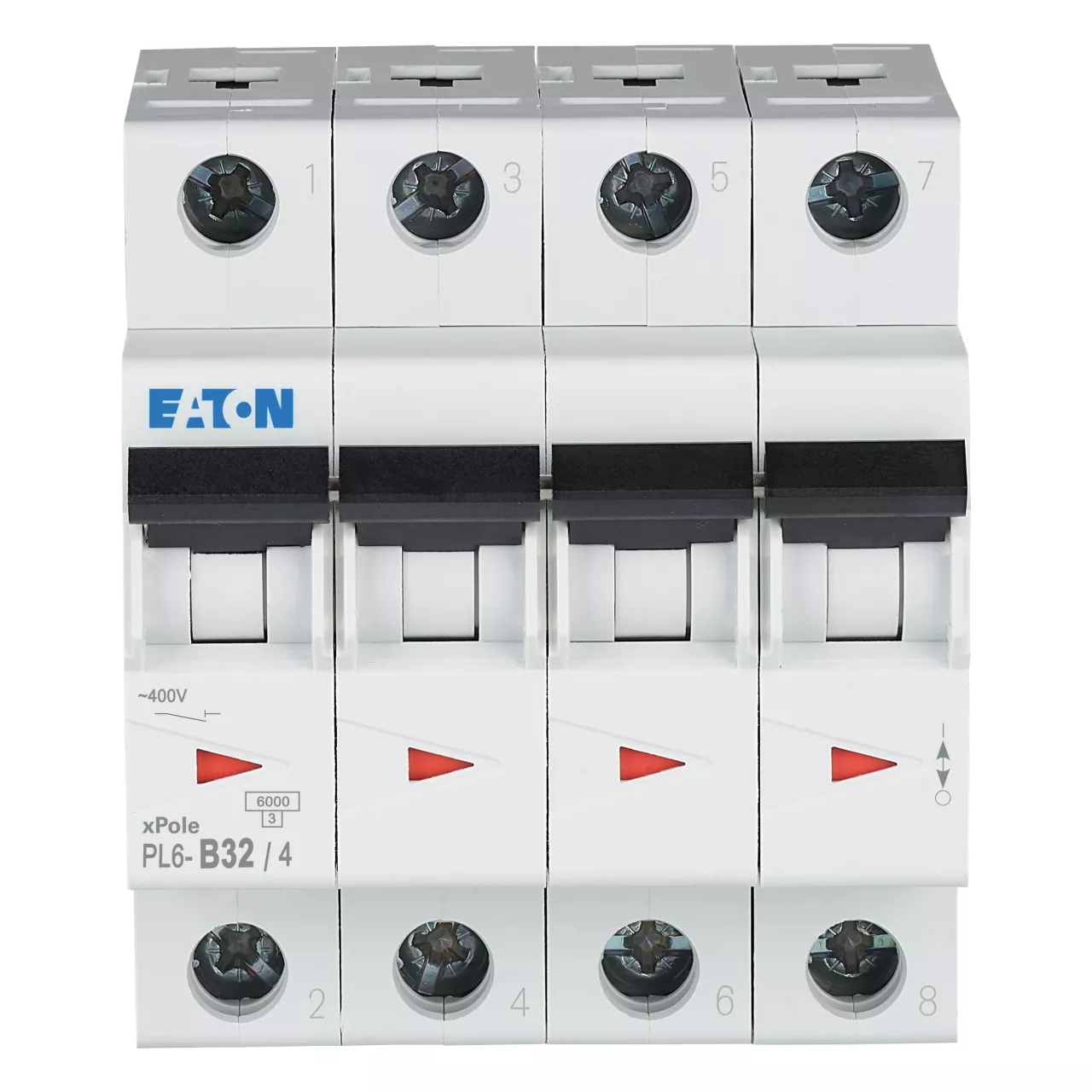 Leitungsschutzschalter (MCB), PL6, 4-polig, Auslösecharakteristik: B, Bemessungsstrom Ein: 32 A, Bemessungsschaltvermögen nach IEC/EN 60898-1: 6 kA, Schaltgeräte für den Wohnungsbereich und kommerzielle Anwendungen