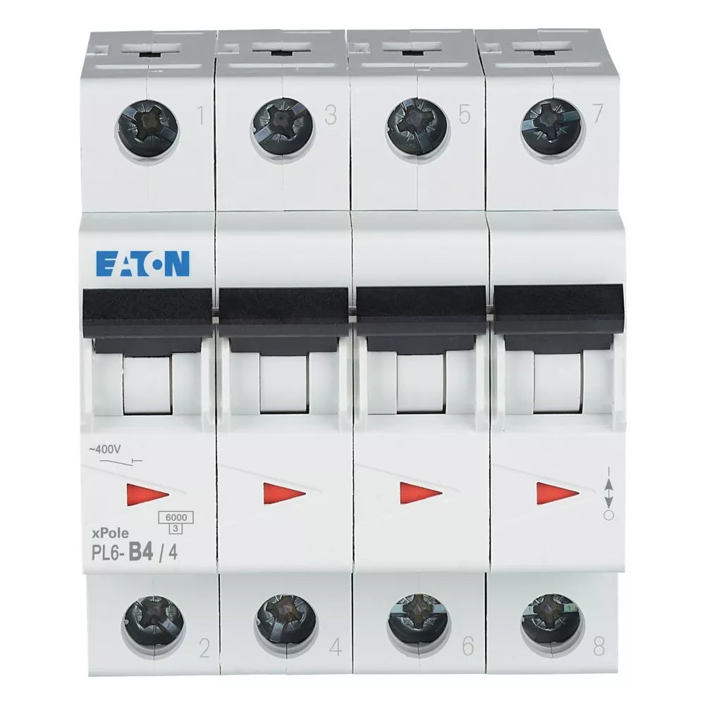 Leitungsschutzschalter (MCB), PL6, 4-polig, Auslösecharakteristik: B, Bemessungsstrom Ein: 4 A, Bemessungsschaltvermögen nach IEC/EN 60898-1: 6 kA, Schaltgeräte für den Wohnungsbereich und kommerzielle Anwendungen