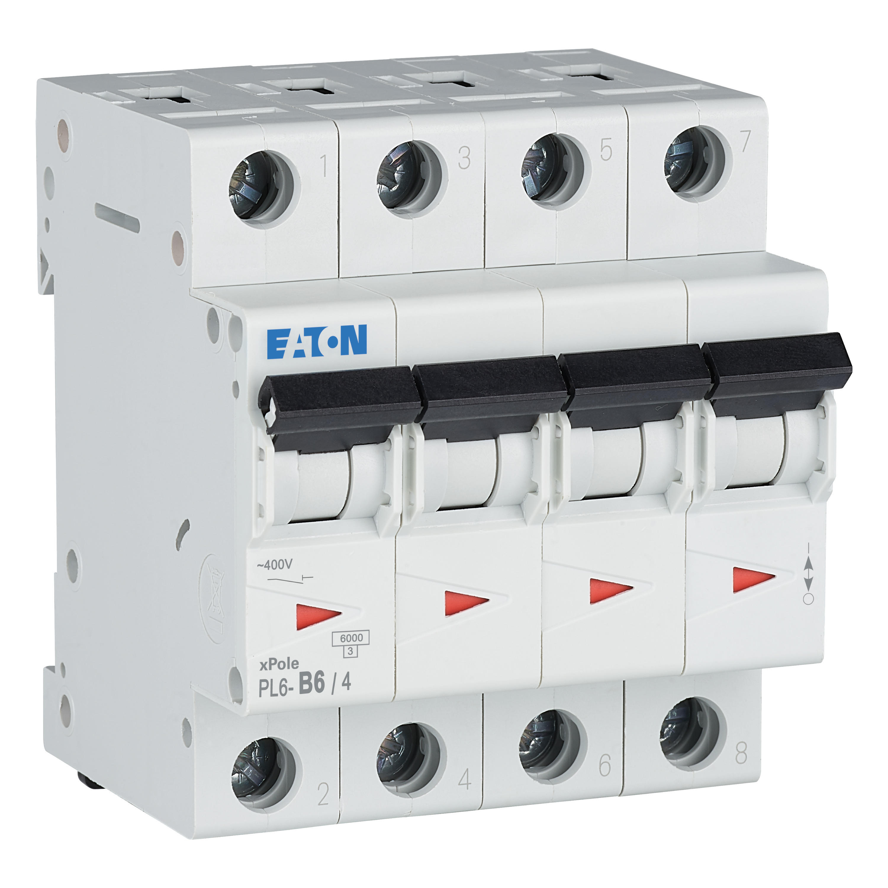 Leitungsschutzschalter (MCB), PL6, 4-polig, Auslösecharakteristik: B, Bemessungsstrom Ein: 6 A, Bemessungsschaltvermögen nach IEC/EN 60898-1: 6 kA, Schaltgeräte für den Wohnungsbereich und kommerzielle Anwendungen