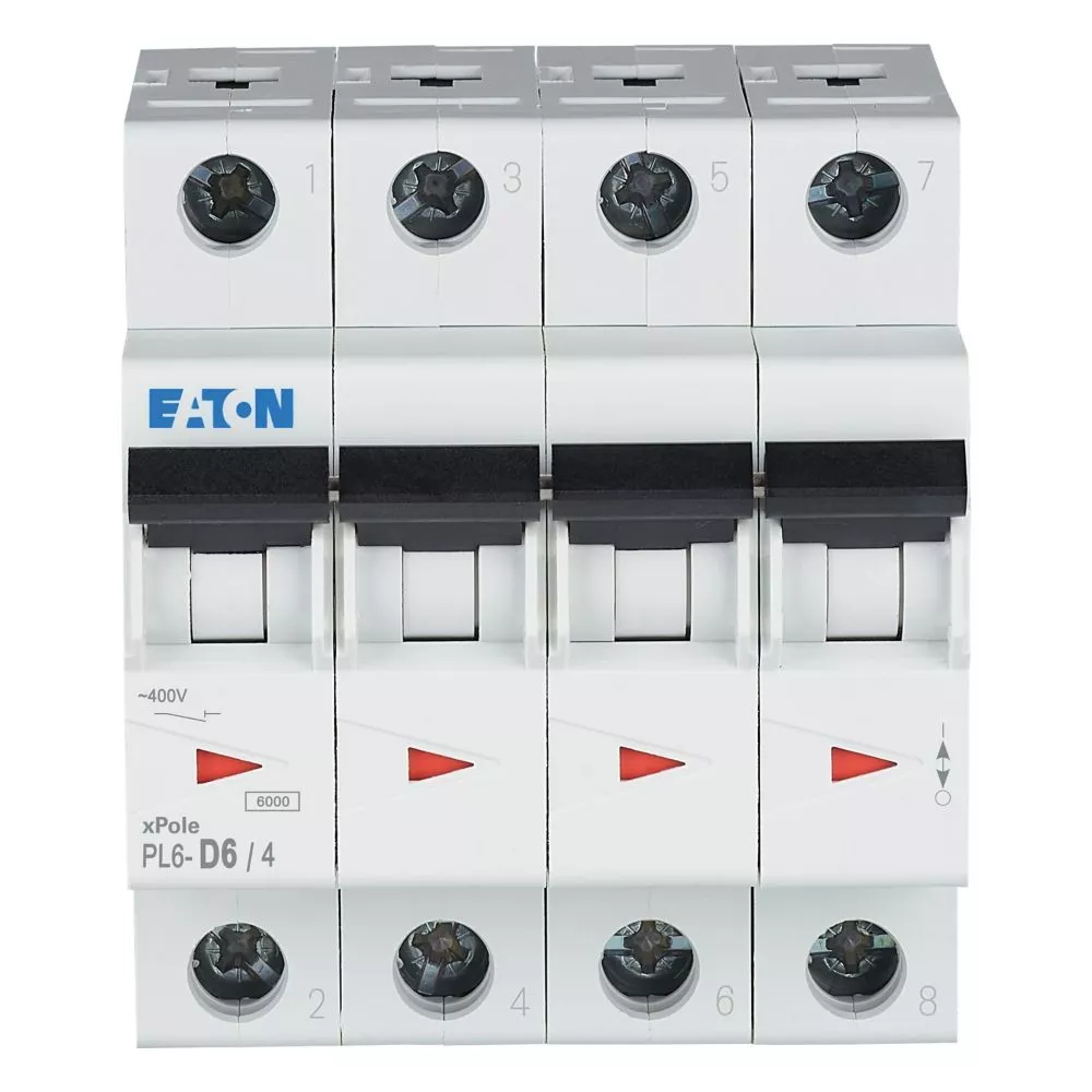 Leitungsschutzschalter (MCB), PL6, 4-polig, Auslösecharakteristik: D, Bemessungsstrom Ein: 6 A, Bemessungsschaltvermögen nach IEC/EN 60898-1: 6 kA, Schaltgeräte für den Wohnungsbereich und kommerzielle Anwendungen
