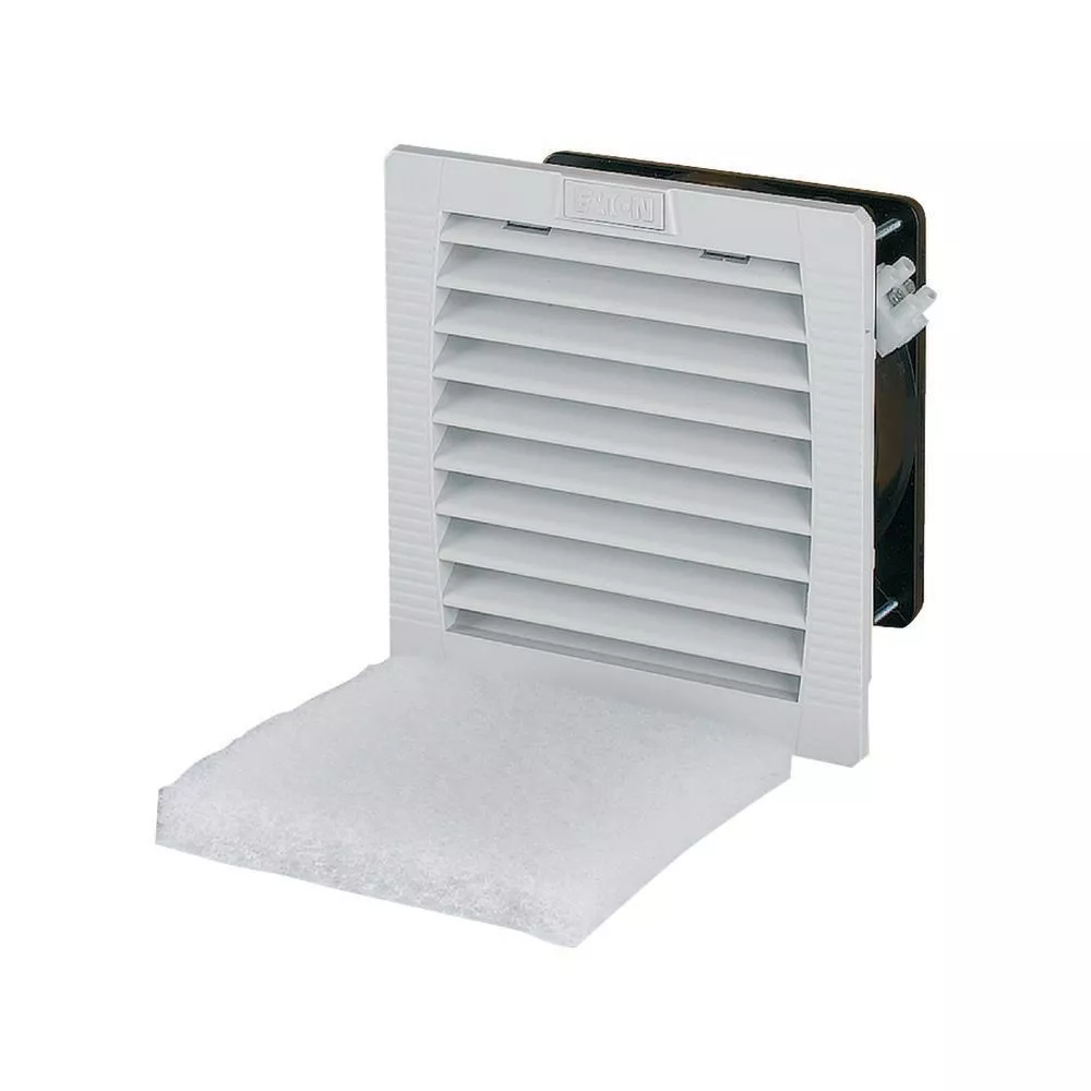 Filterlüfter zum Be- und Entlüften von Anlagen; einfache Installation; einfacher Wechsel der Filtermatten; Schutzart IP54; einfacher Luftförderrichtungswechsel; Gleitlager; selbstverlöschender Kunststoff UL94 V-0; Sicherung mit 6 A; Luftfördermenge freiblasend 61/70 m³/h; Ausschnitt [HxB] 125 mm x 125 mm; Abmessungen 145 mm x 145 mm