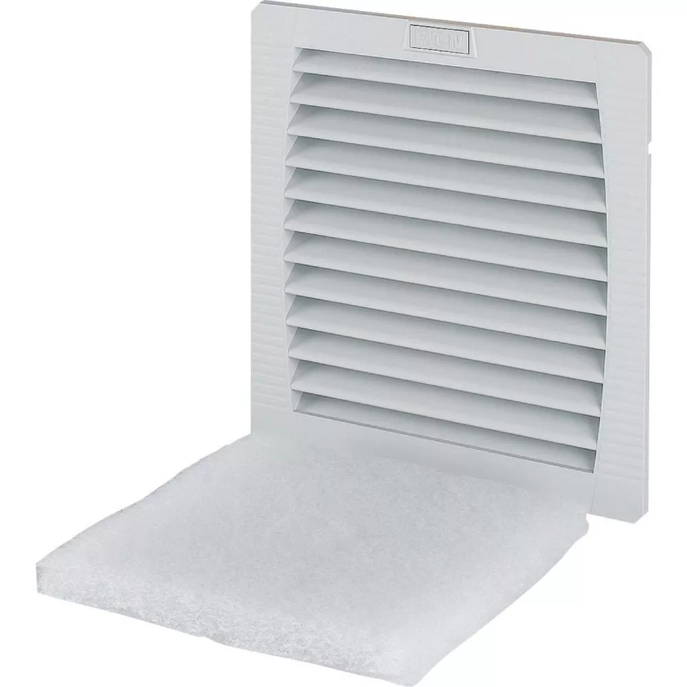 Filterlüfter zum Be- und Entlüften von Anlagen; einfache Installation; einfacher Wechsel der Filtermatten; Schutzart IP54; einfacher Luftförderrichtungswechsel; Gleitlager; selbstverlöschender Kunststoff UL94 V-0; Sicherung mit 6 A; Luftfördermenge freiblasend 110/125 m³/h; Ausschnitt [HxB] 177 mm x 177 mm; Abmessungen 202 mm x 202 mm