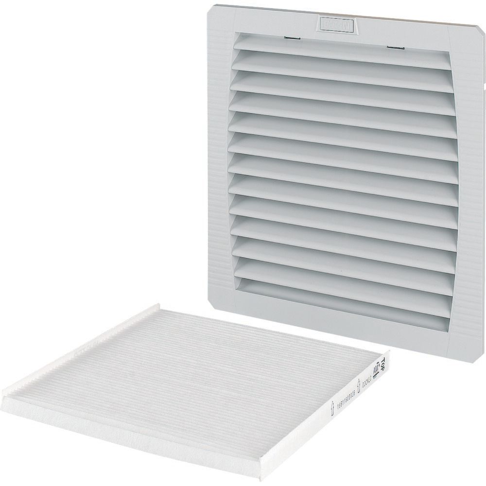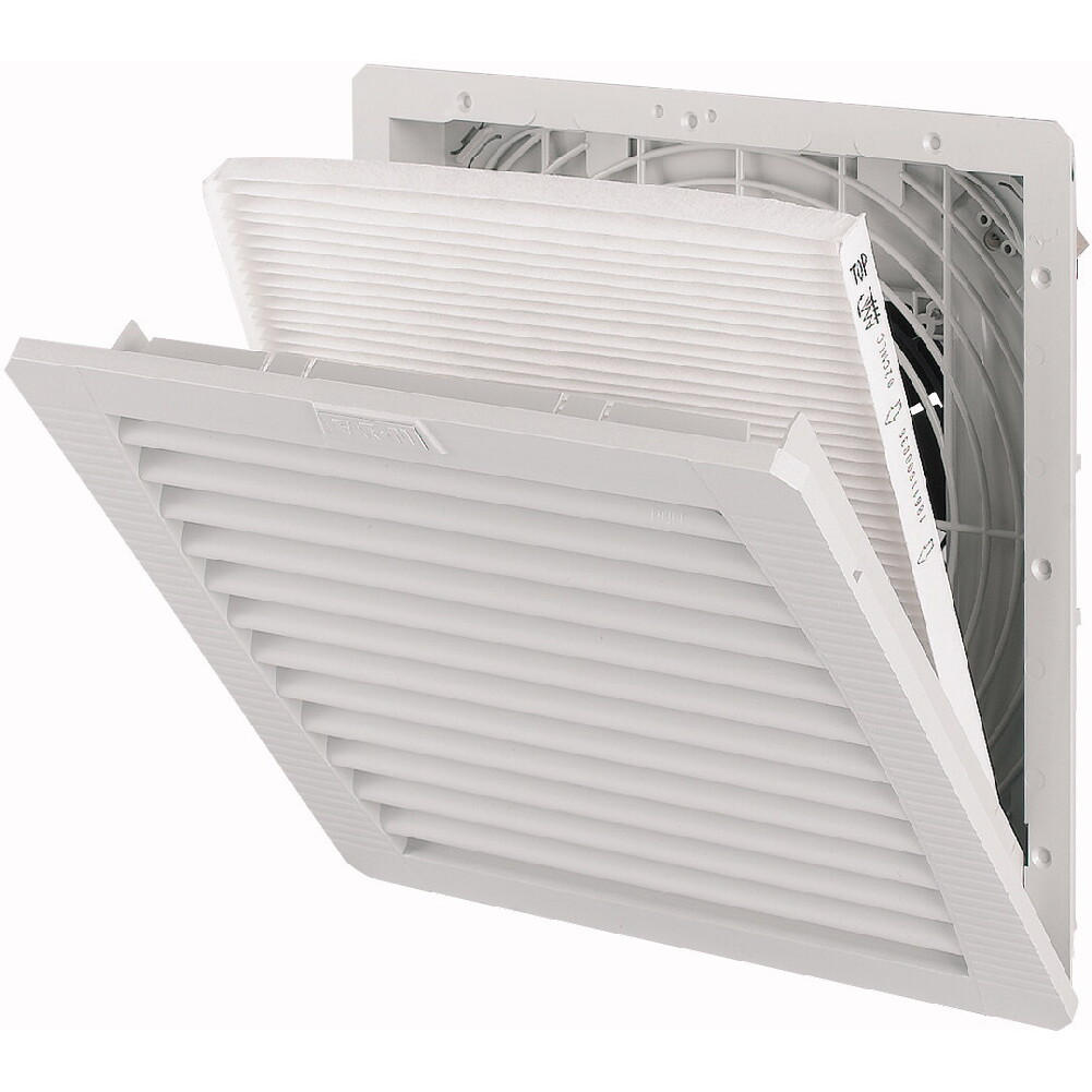 Filterlüfter zum Be- und Entlüften von Anlagen; einfache Installation; einfacher Wechsel der Filtermatten; Schutzart IP55; einfacher Luftförderrichtungswechsel; Gleitlager; selbstverlöschender Kunststoff UL94 V-0; Sicherung mit 6 A; Luftfördermenge freiblasend 233/265 m³/h; Ausschnitt [HxB] 223 mm x 223 mm; Abmessungen 252 mm x 252 mm; UV-beständig