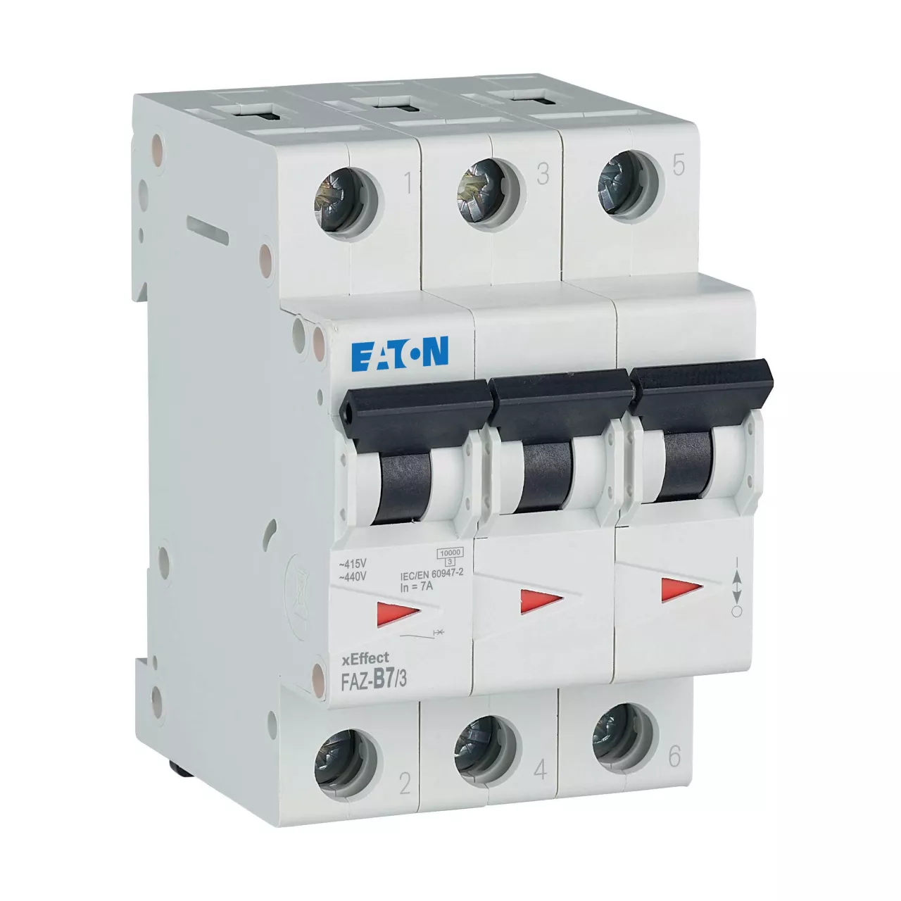 Installatieautomaat (MCB), FAZ, 3-polig, afschakelkarakteristiek: B, nominale stroom In: 7 A, nominaal schakelvermogen (IEC/EN 60947-2): 15 kA, Schakelapparatuur industriële en geavanceerde commerciële toepassingen