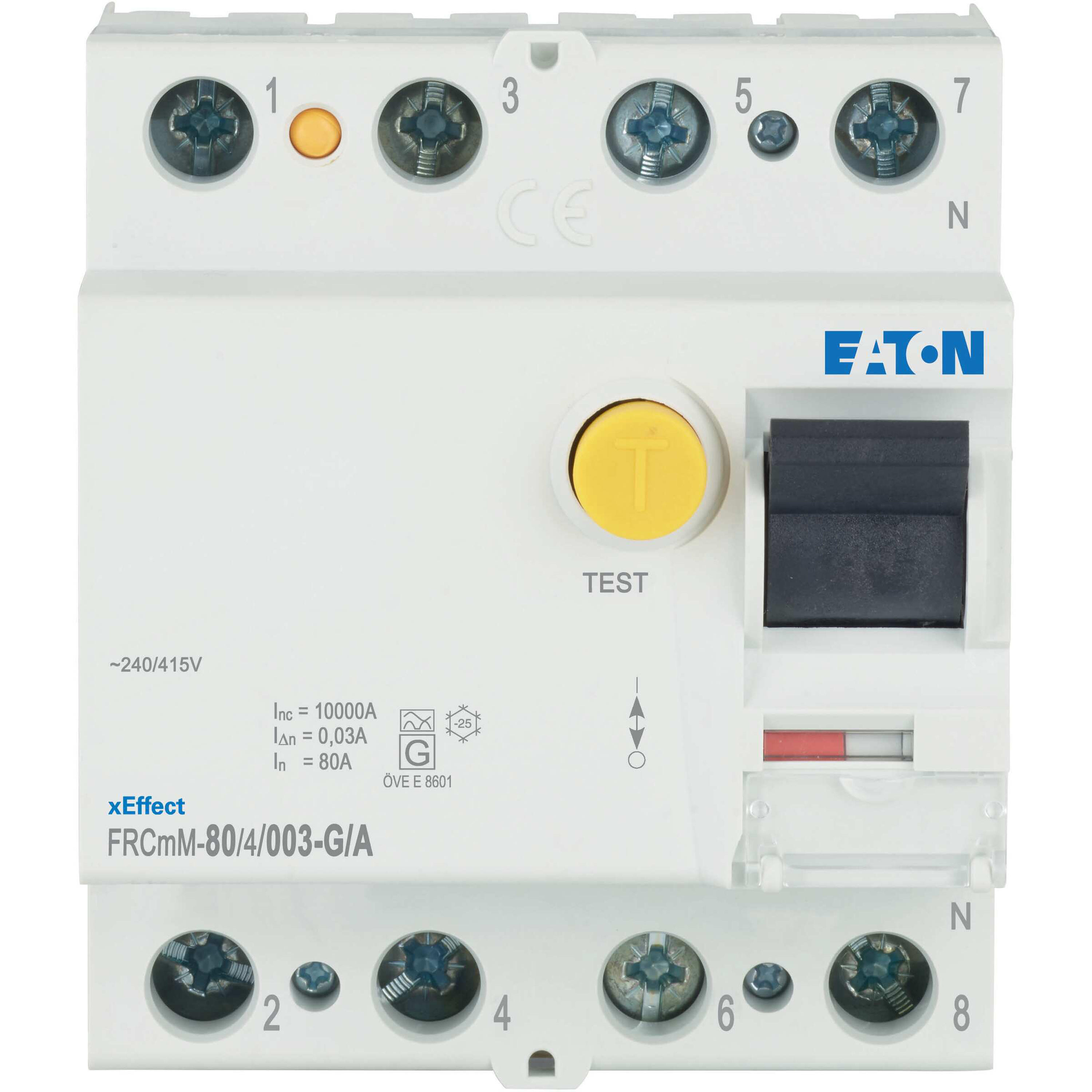 Fehlerstrom-Schutzschalter FRCmM, 4-polig, Bemessungsstrom Ein: 80 A, Bemessungskurzschlussfestigkeit Icn: 10 kA mit Vorsicherung kA, Bemessungsfehlerstrom IΔN: 0.03 A, Schaltgeräte für industrielle und erweiterte kommerzielle Anwendungen