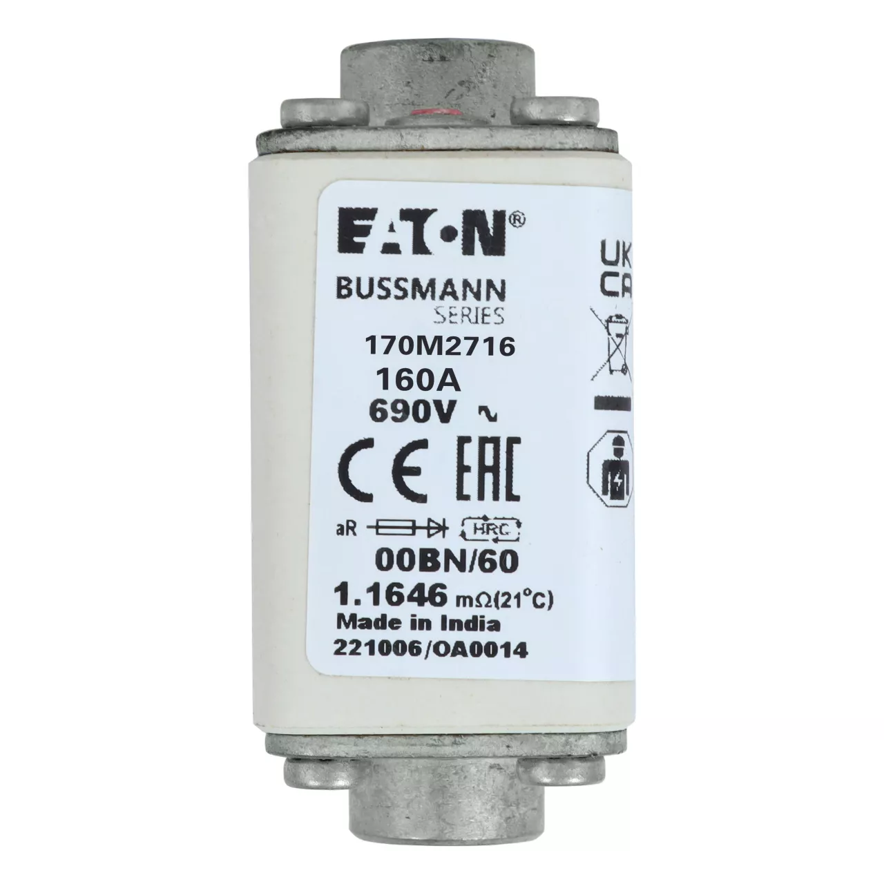 170M2716 Wkładka szybka, 160 A, AC 690 V, rozmiar 00, 30 x 48 x 64 mm, aR, IEC, wskaźnik optyczny