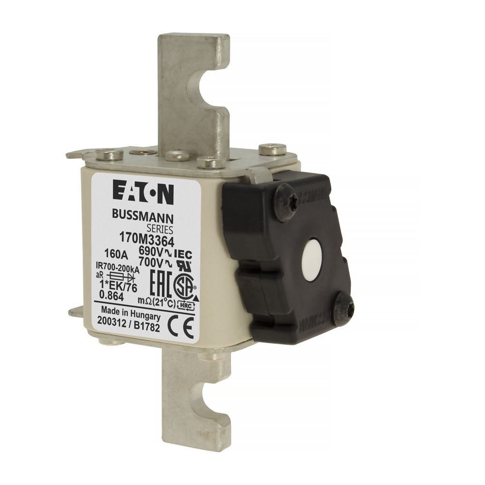 Bezpiecznik, wkladka topikowa, szybka, 160 A, AC 690 V, kompaktowy rozmiar 1, 45 x 59 x 102 mm, aR, IEC, UL, pojedynczy wskaznik, korpus prostopadloscienny z zaciskami przykrecanymi centralnie (szczelinowymi), styl francuski, wskaznik typu K dla mikroprzelacznika, ochrona pólprzewodników, IEC 60269-4, zdolnosc wylaczania 200 kA