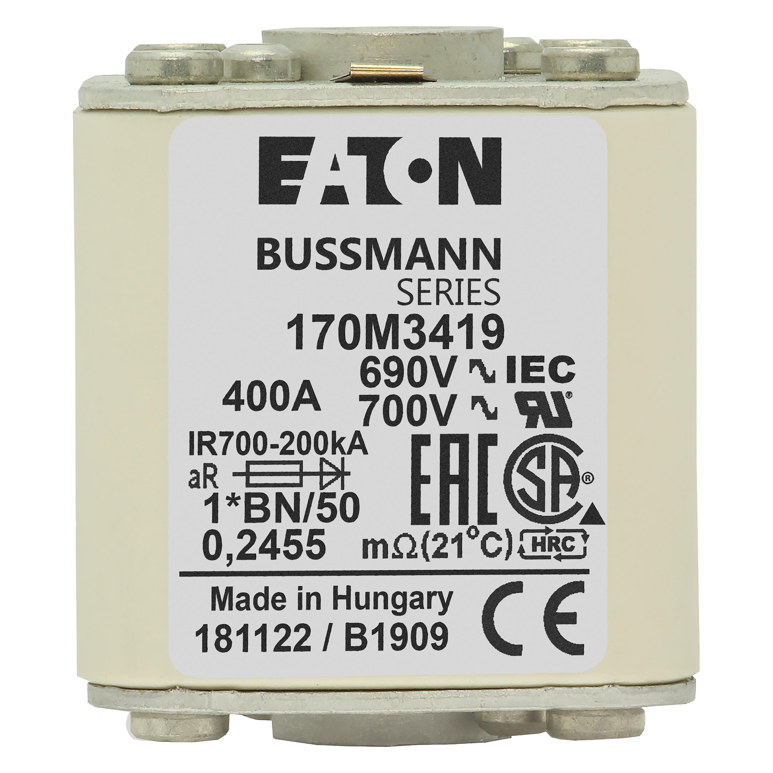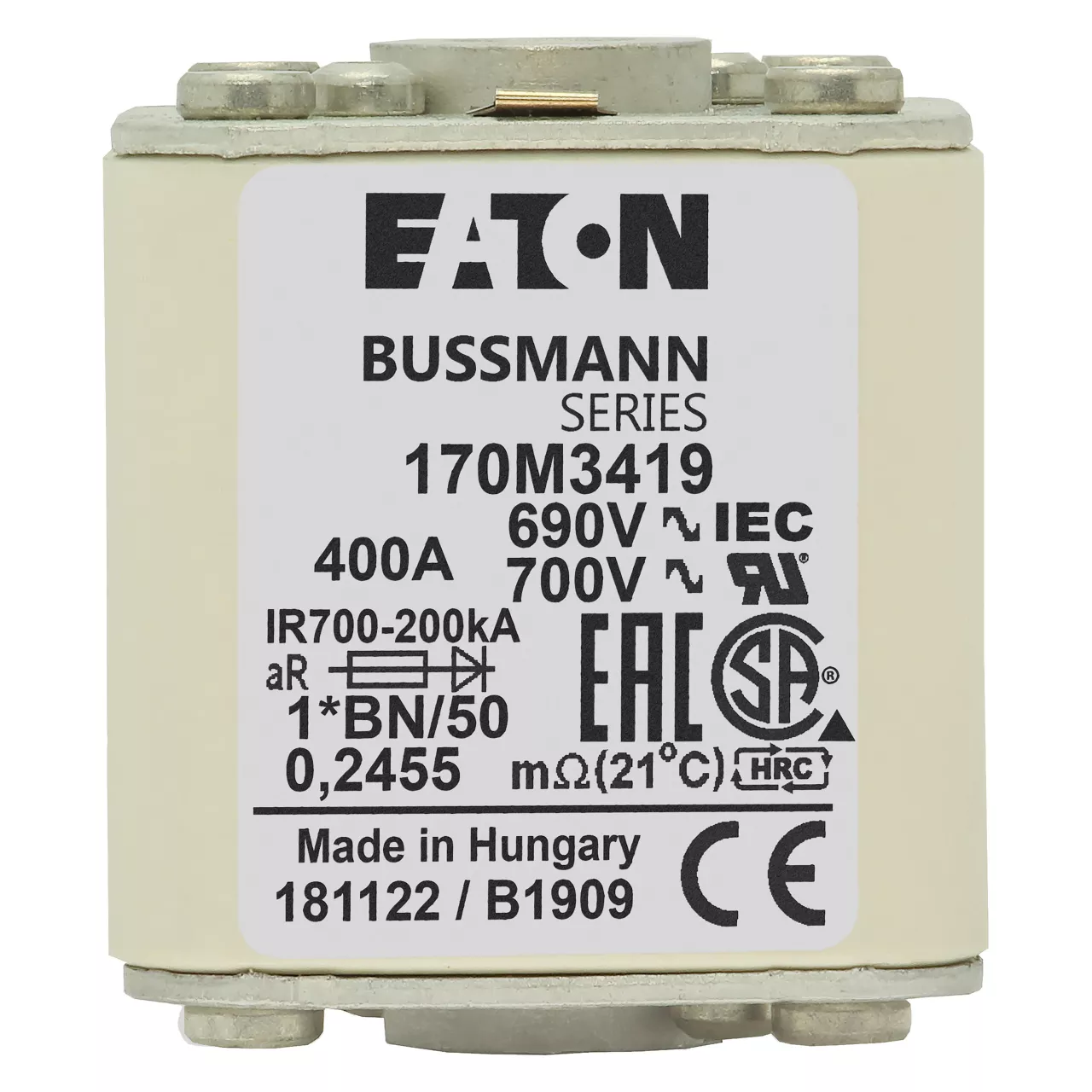 170M3419 Wkładka szybka, 400 A, AC 690 V, compact size 1, 45 x 59 x 51 mm, aR, IEC, UL, wskaźnik, flush end, M8