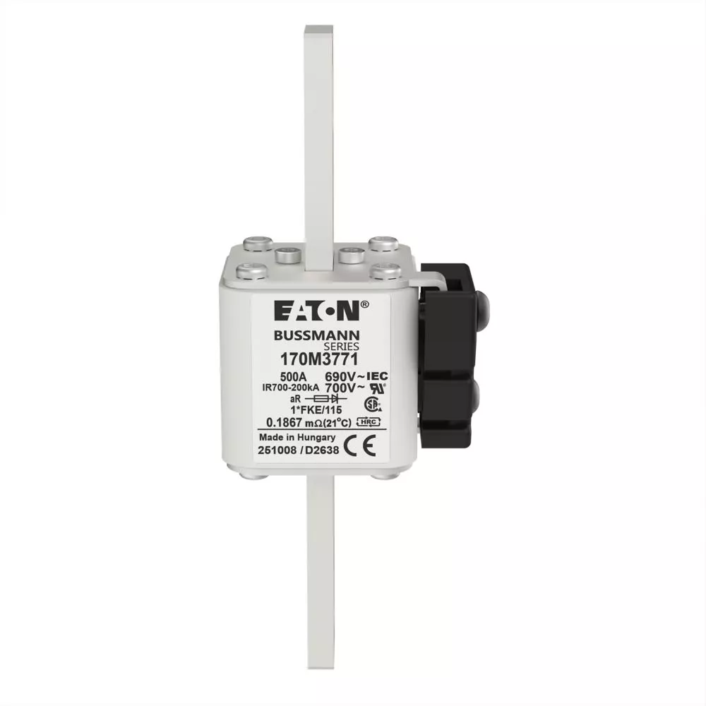 Bezpiecznik, wkladka topikowa, szybka, 500 A, AC 690 V, kompaktowy rozmiar 1, 45 x 59 x 148 mm, aR, IEC, UL, pojedynczy wskaznik, korpus prostopadloscienny z zaciskami przykrecanymi centralnie, styl amerykanski, wskaznik typu K dla mikroprzelacznika, ochrona pólprzewodników, IEC 60269-4, zdolnosc wylaczania 200 kA