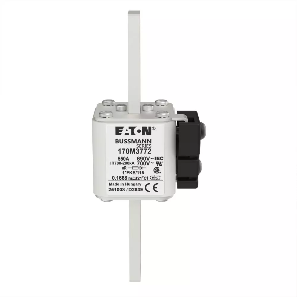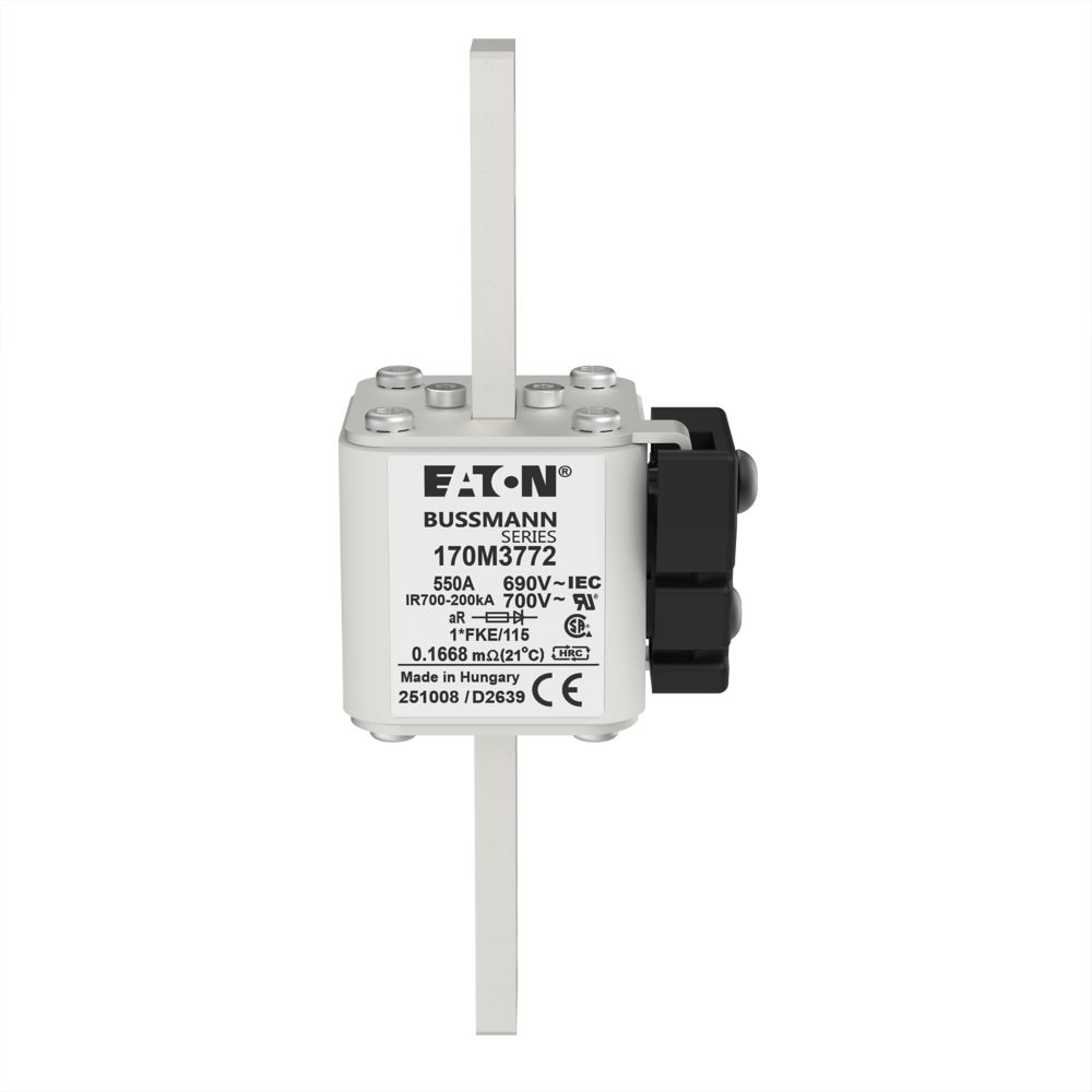 Bezpiecznik, wkladka topikowa, szybka, 550 A, AC 690 V, kompaktowy rozmiar 1, 45 x 59 x 148 mm, aR, IEC, UL, pojedynczy wskaznik, korpus prostopadloscienny z zaciskami przykrecanymi centralnie, styl amerykanski, wskaznik typu K dla mikroprzelacznika, ochrona pólprzewodnika, IEC 60269-4, zdolnosc wylaczania 200 kA
