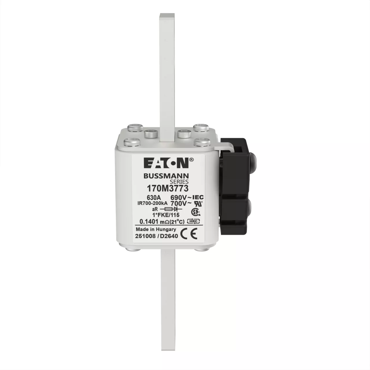 Bezpiecznik, wkladka topikowa, szybka, 630 A, AC 690 V, kompaktowy rozmiar 1, 45 x 59 x 148 mm, aR, IEC, UL, pojedynczy wskaznik, korpus prostopadloscienny z zaciskami przykrecanymi centralnie, styl amerykanski, wskaznik typu K dla mikroprzelacznika, ochrona pólprzewodnika, IEC 60269-4, zdolnosc wylaczania 200 kA
