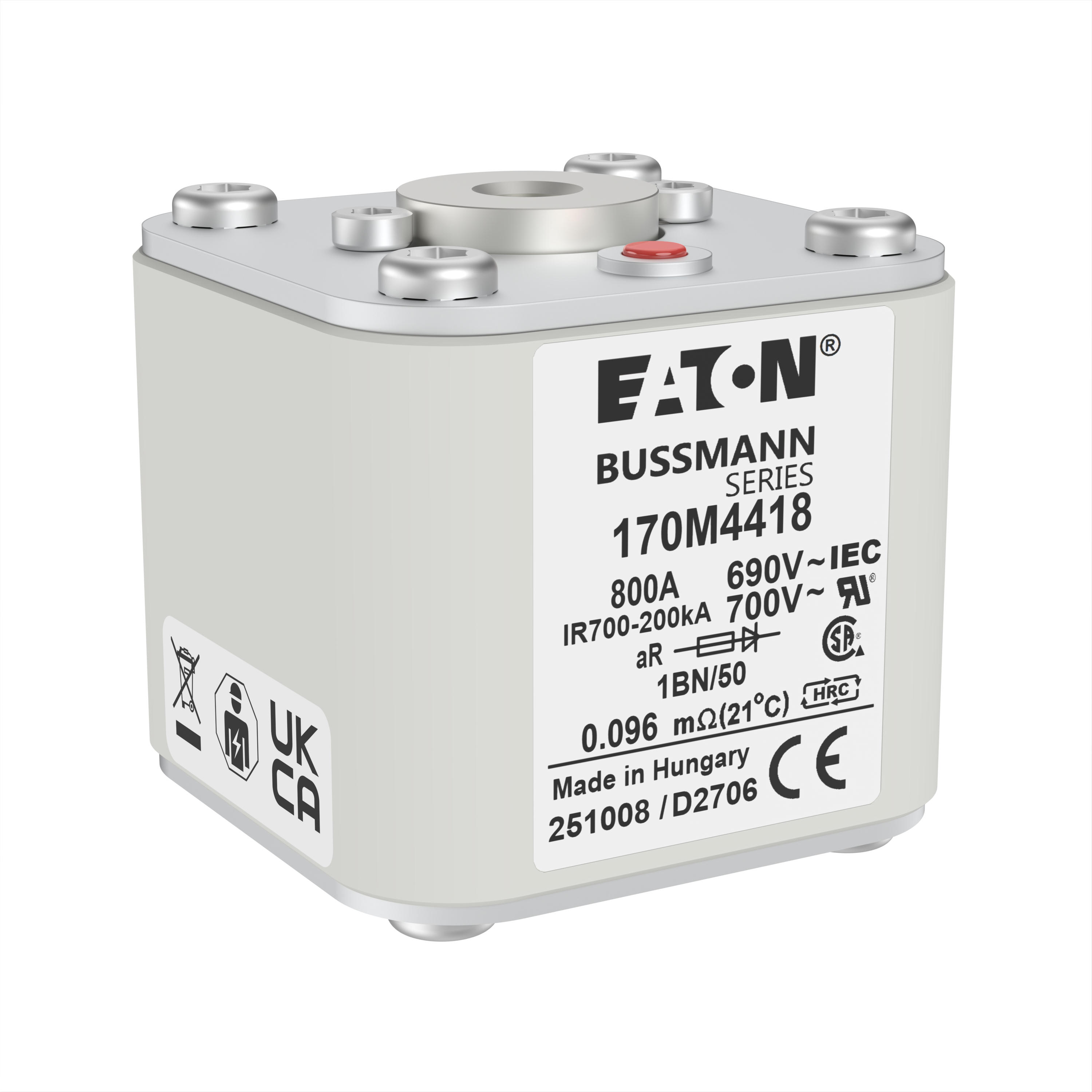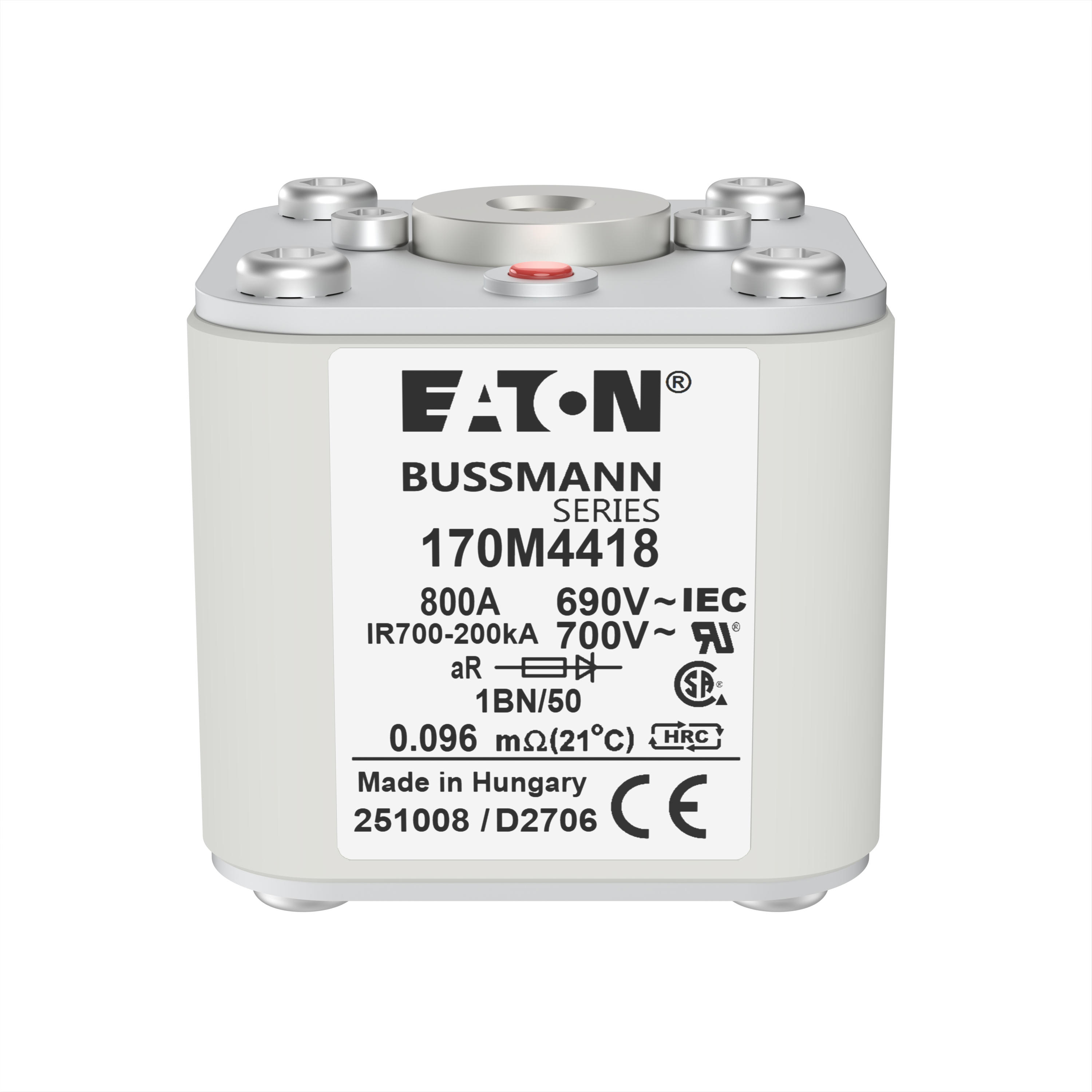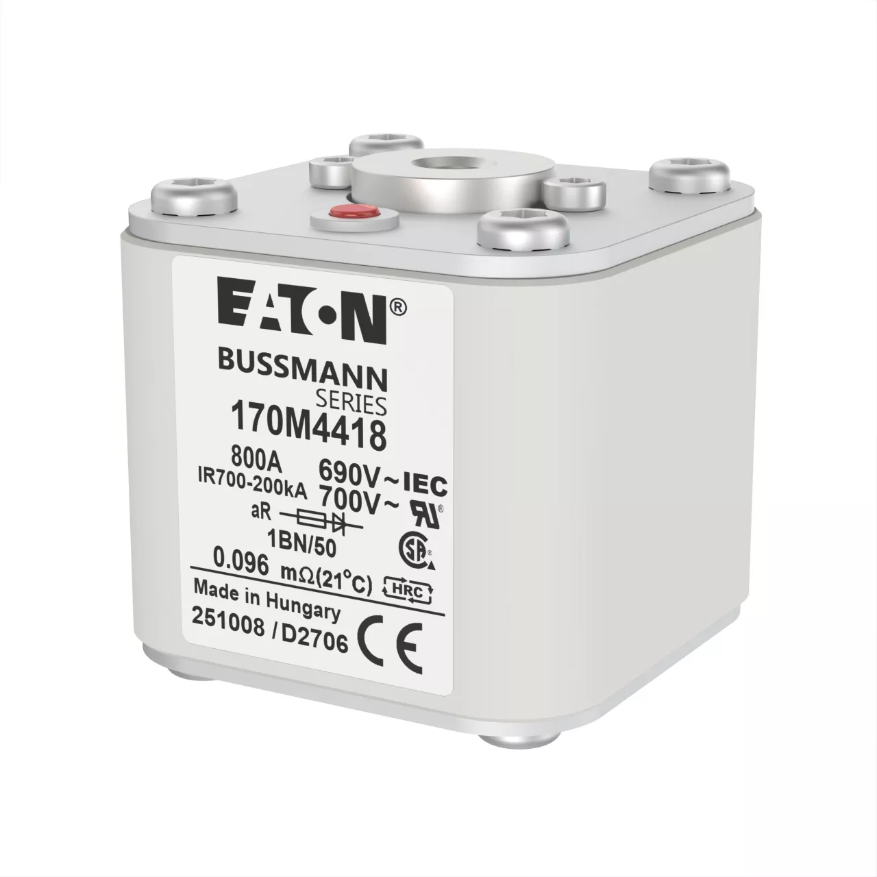 170M4418 Wkładka szybka, 800 A, AC 690 V, size 1, 53 x 69 x 51 mm, aR, IEC, UL, wskaźnik, flush end, M8