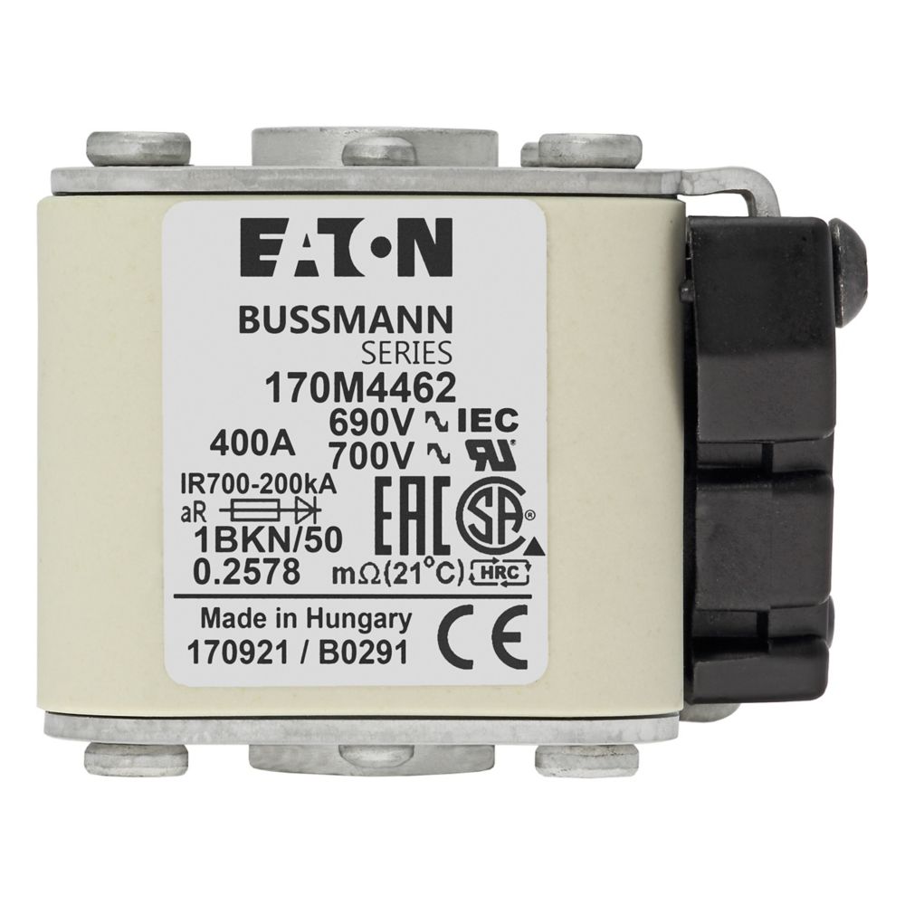 170M4462 Wkładka szybka, 400 A, AC 690 V, size 1, 53 x 69 x 51 mm, aR, IEC, UL, wskaźnik K, flush end, M8