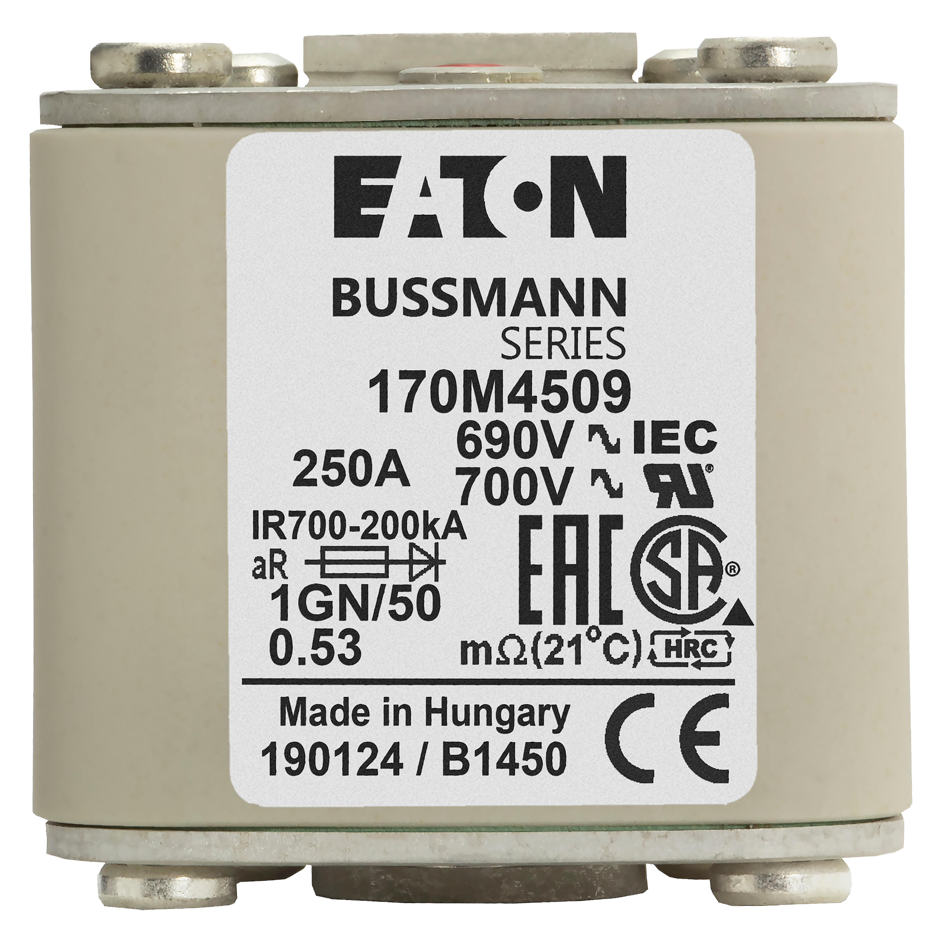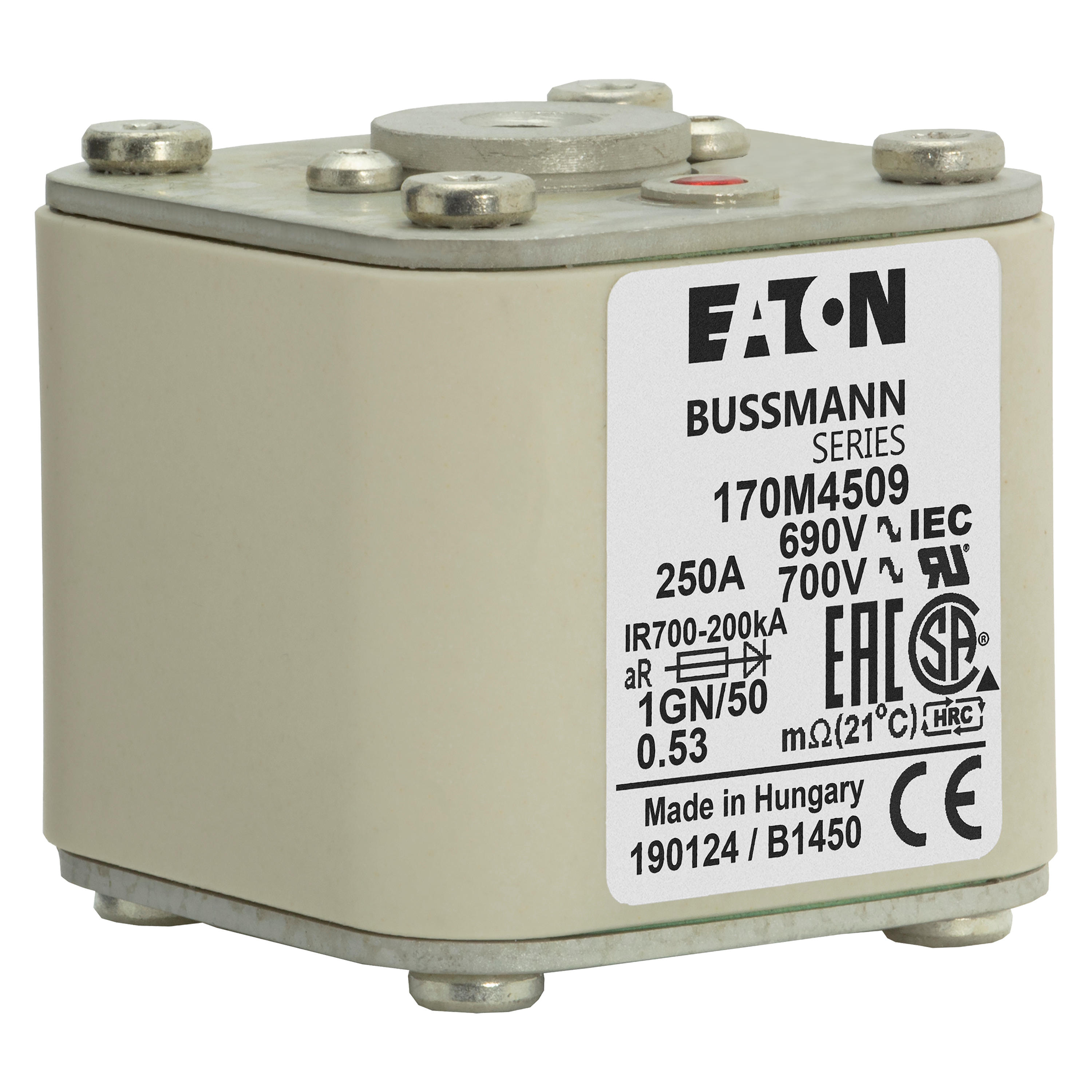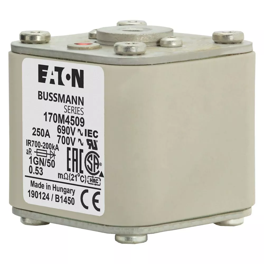 170M4509 Wkładka szybka, 250 A, AC 690 V, size 1, 53 x 69 x 51 mm, aR, IEC, UL, wskaźnik, flush end, 18 UNC