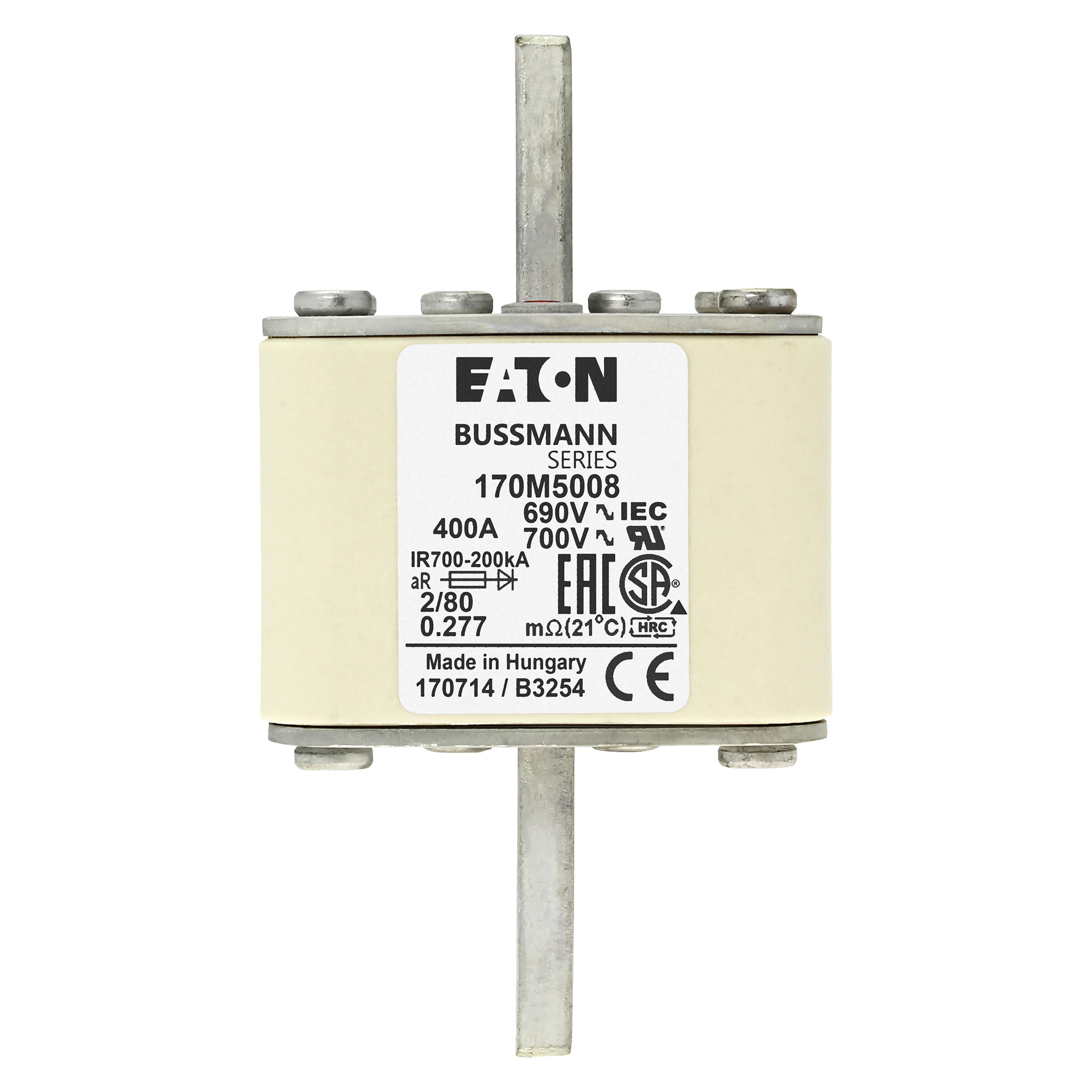 170M5008 Wkładka szybka, 400 A, AC 690 V, DIN 2, 61 x 61 x 108 mm, aR, DIN, IEC, pojedynczy wskaźnik, rozstaw 80 mm