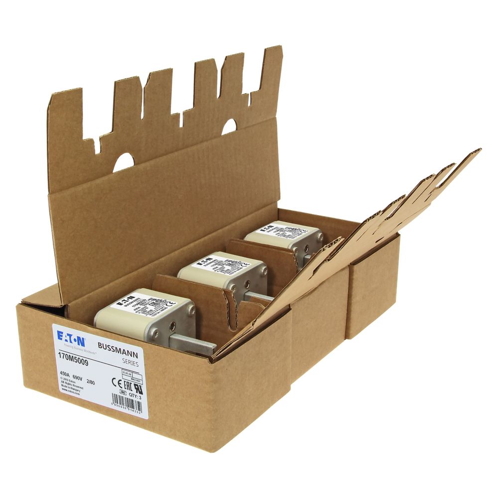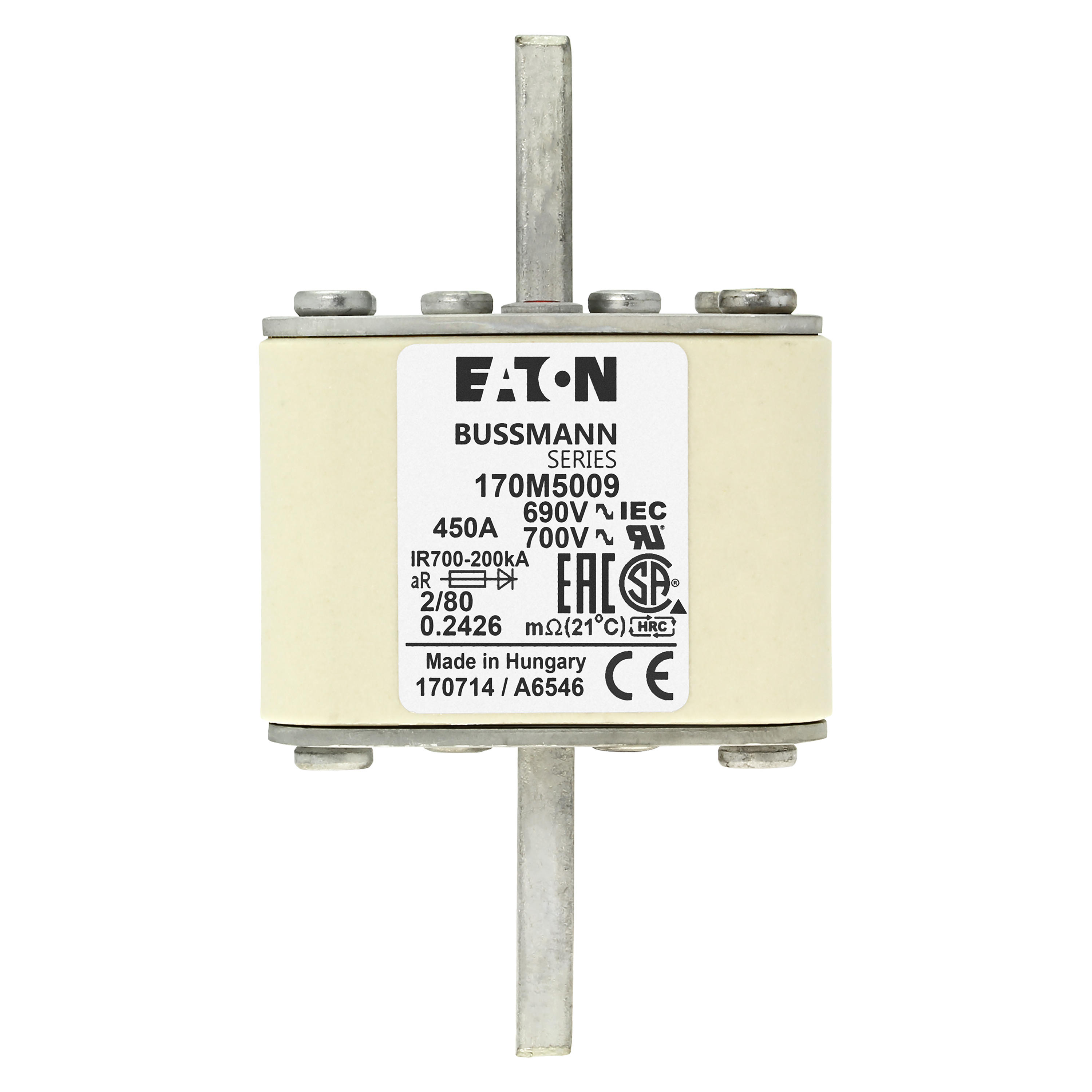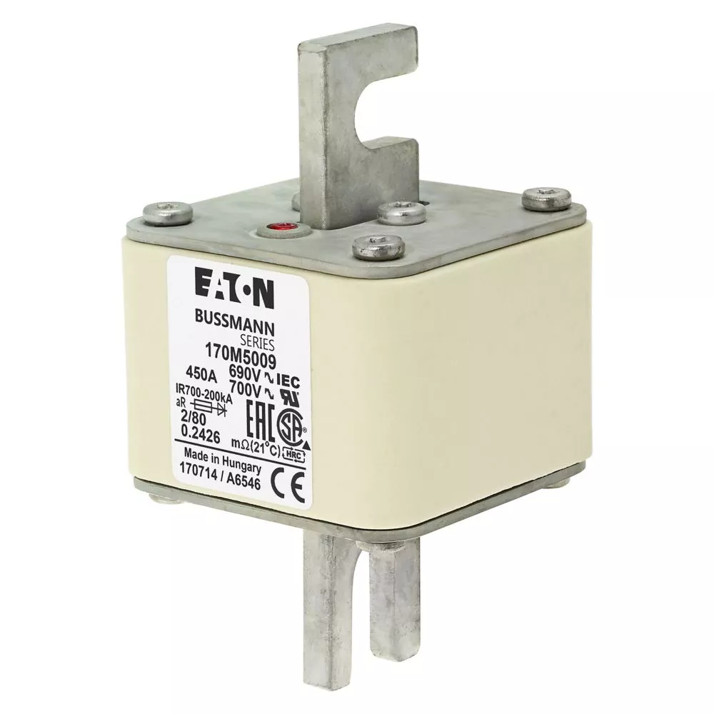 170M5009 Wkładka szybka, 450 A, AC 690 V, DIN 2, 61 x 61 x 108 mm, aR, DIN, IEC, pojedynczy wskaźnik, rozstaw 80 mm