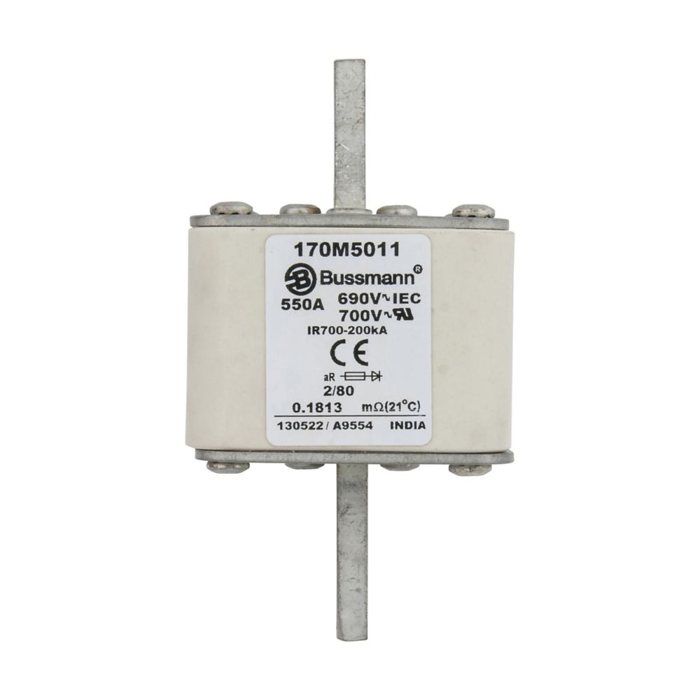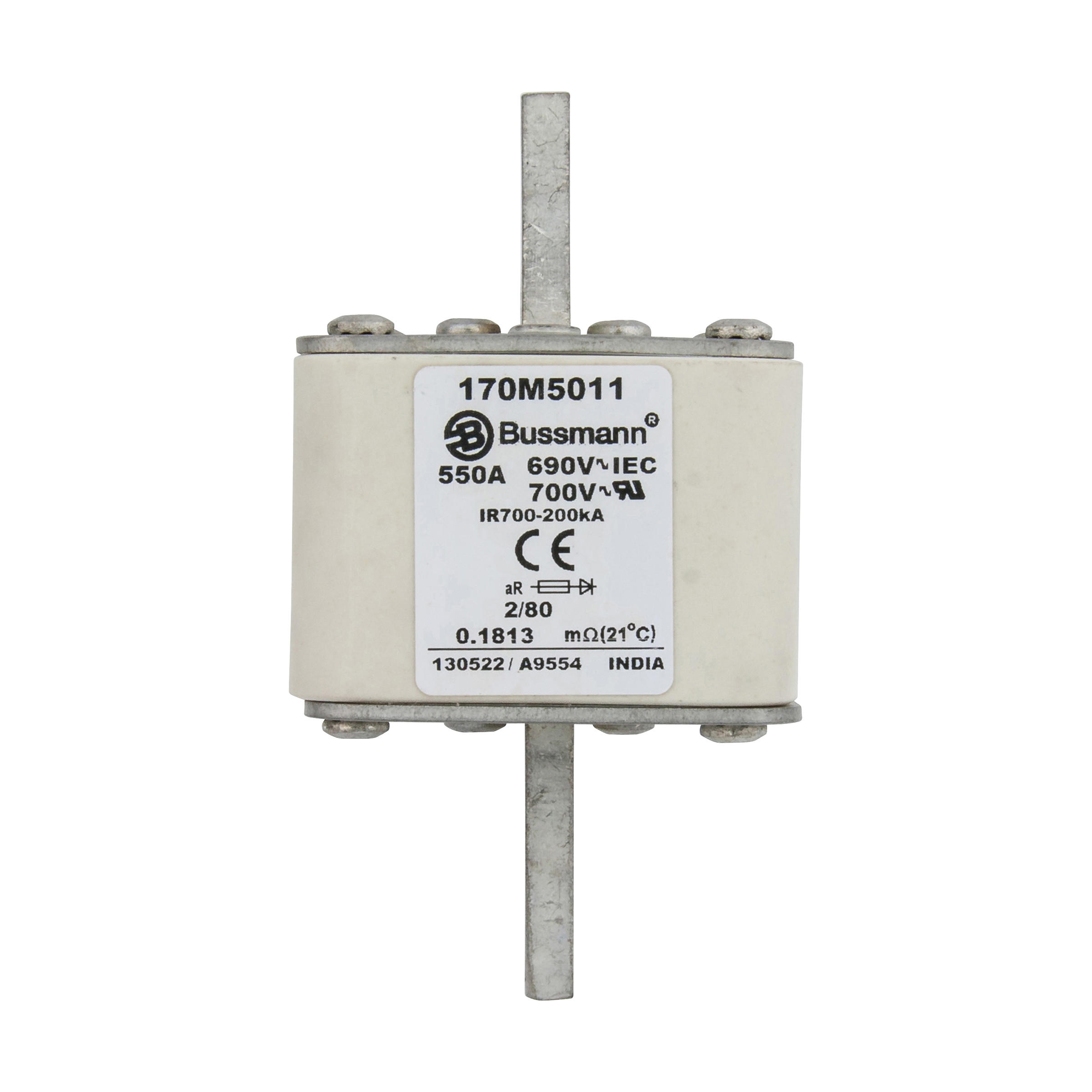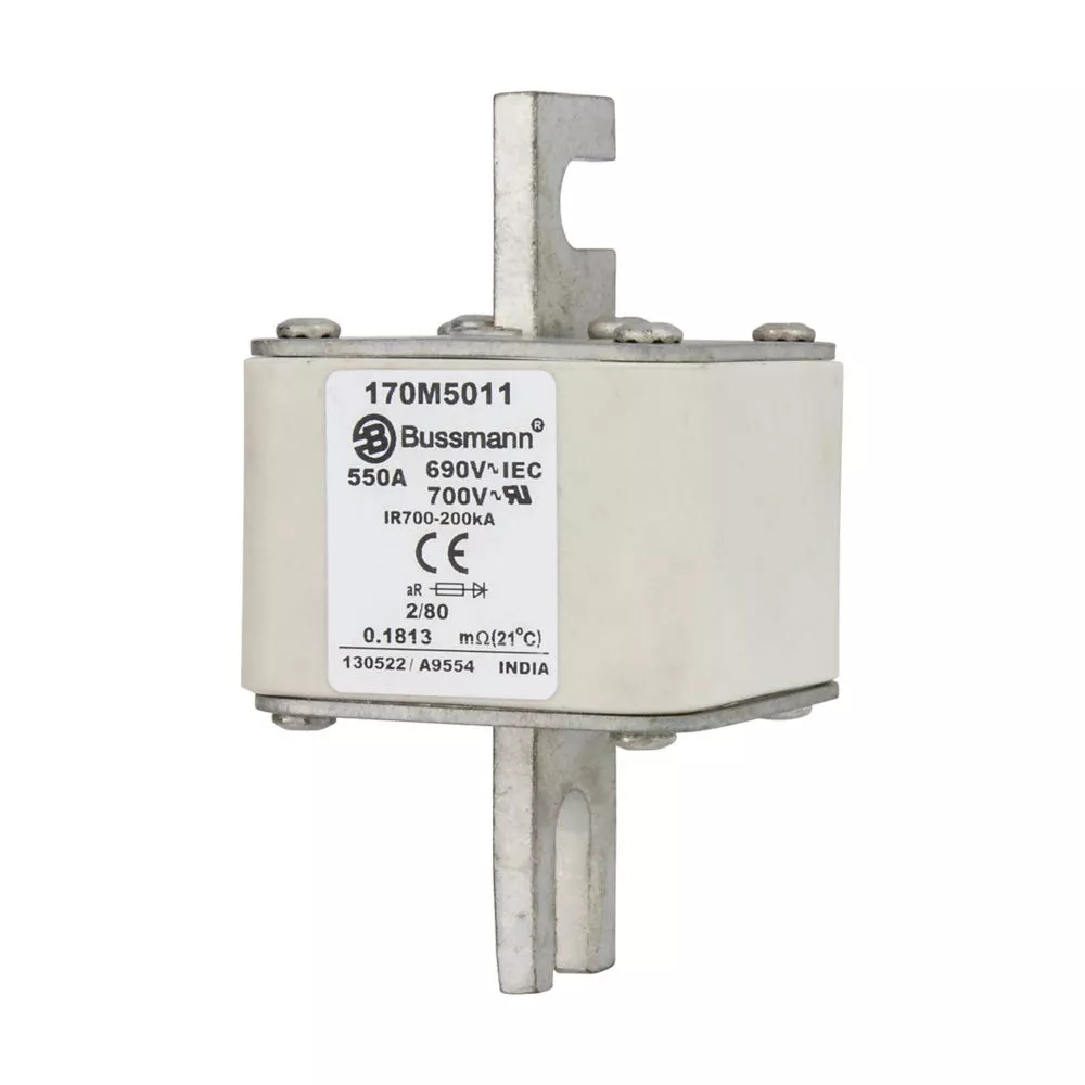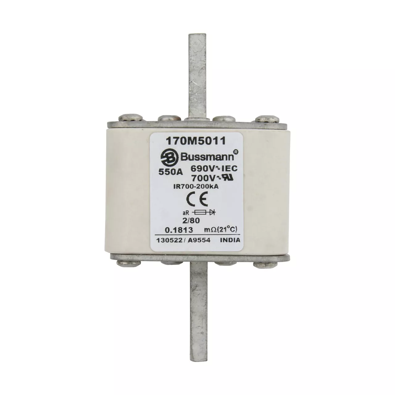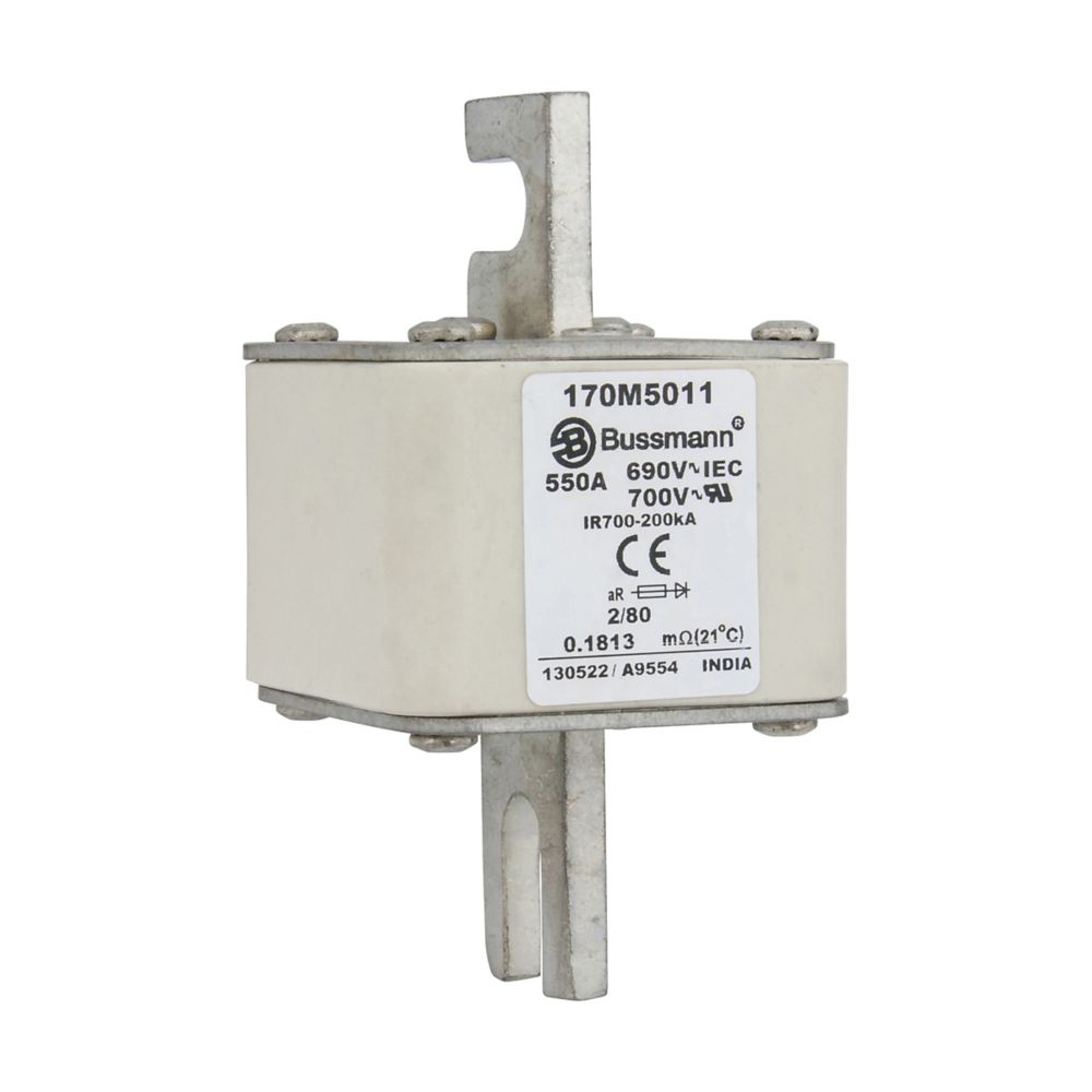 170M5011 Wkładka szybka, 550 A, AC 690 V, DIN 2, 61 x 61 x 108 mm, aR, DIN, IEC, pojedynczy wskaźnik, rozstaw 80 mm