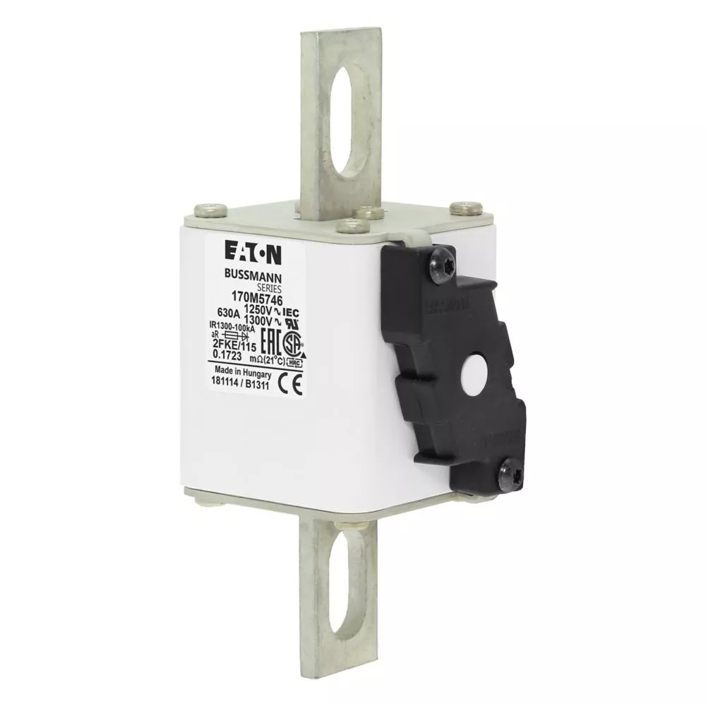 Bezpiecznik, wkladka topikowa, szybka, 630 A, AC 1250 V, rozmiar 2, 61 x 77 x 160 mm, aR, IEC, UL, pojedynczy wskaznik, korpus prostopadloscienny z zaciskami przykrecanymi centralnie, styl amerykanski, wskaznik typu K dla mikroprzelacznika, ochrona pólprzewodnika, IEC 60269-4, zdolnosc wylaczania 100 kA