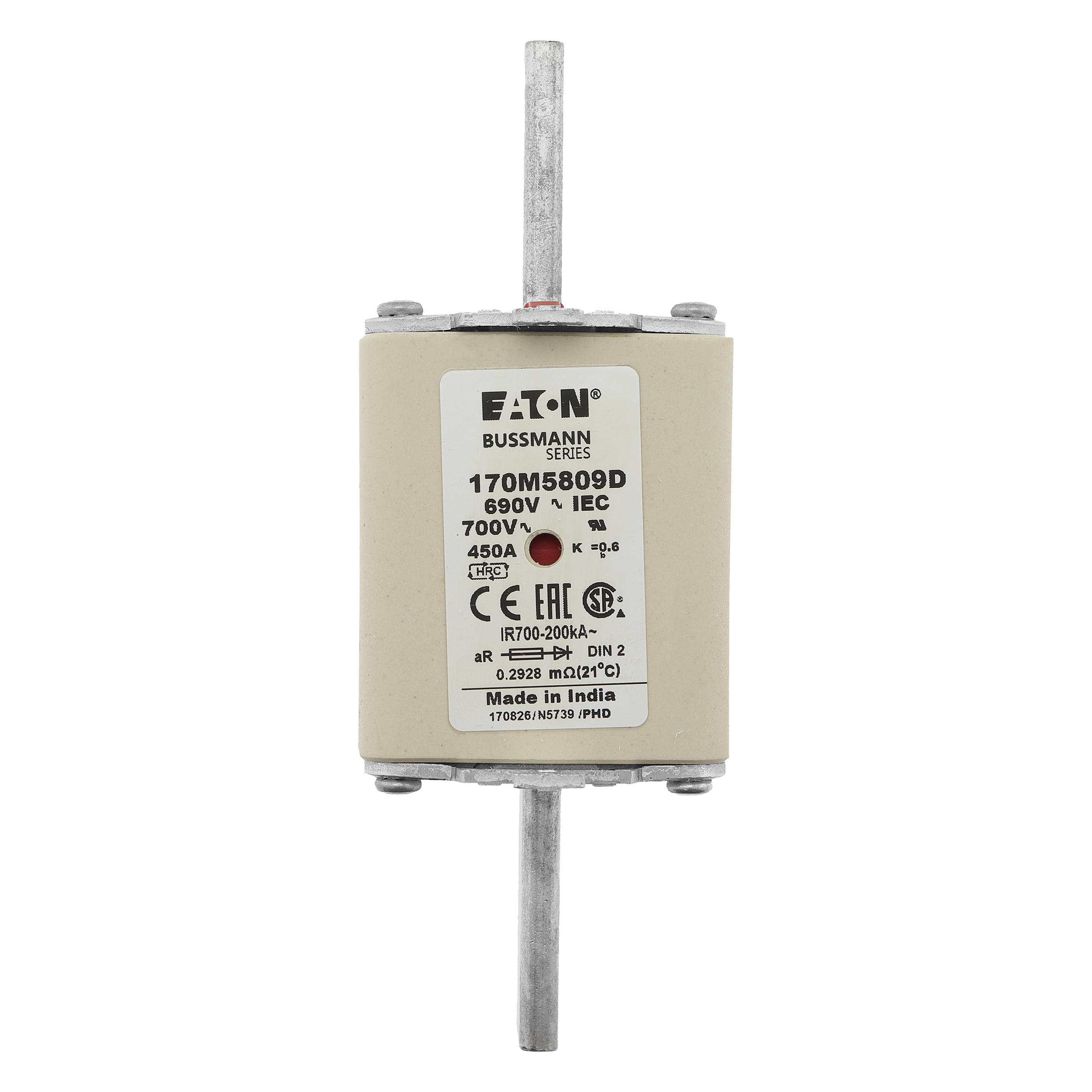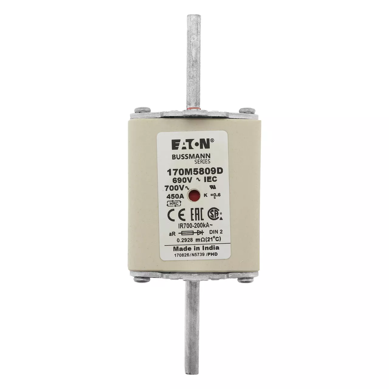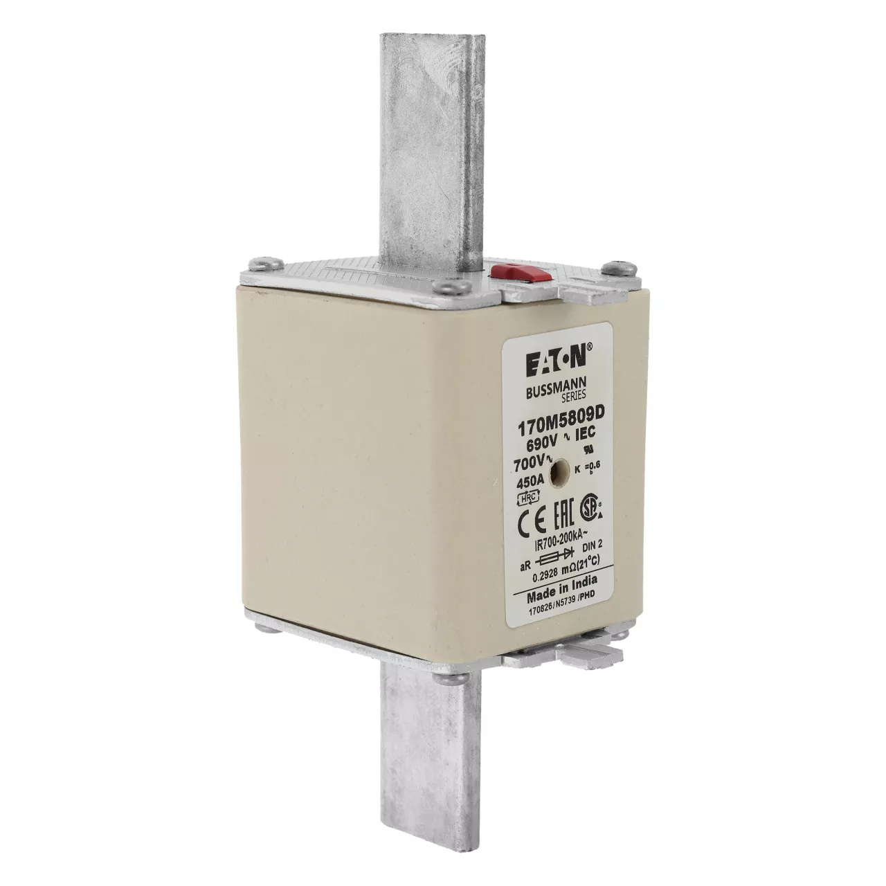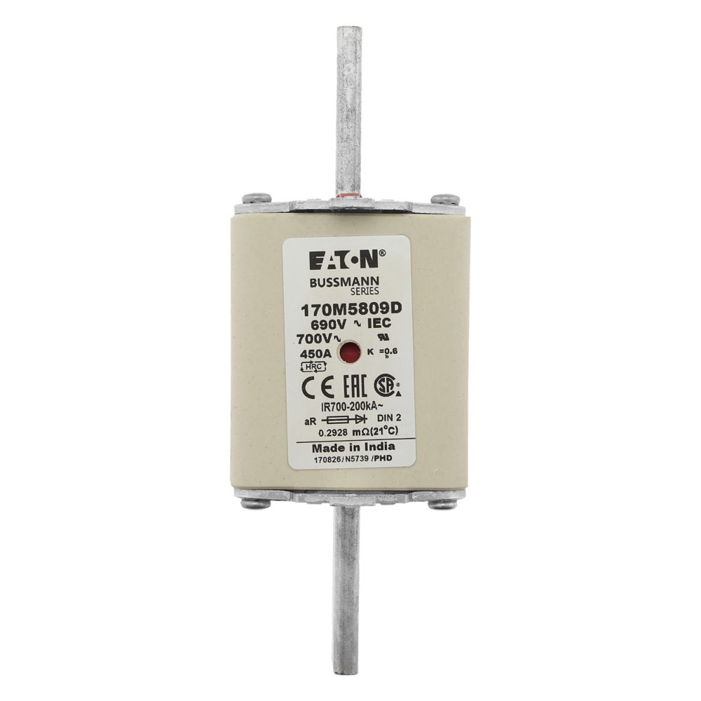 170M5809D Wkładka szybka, 450 A, AC 690 V, DIN 2, aR, DIN, IEC, podwójny wskaźnik, nieizolowane uchwyty