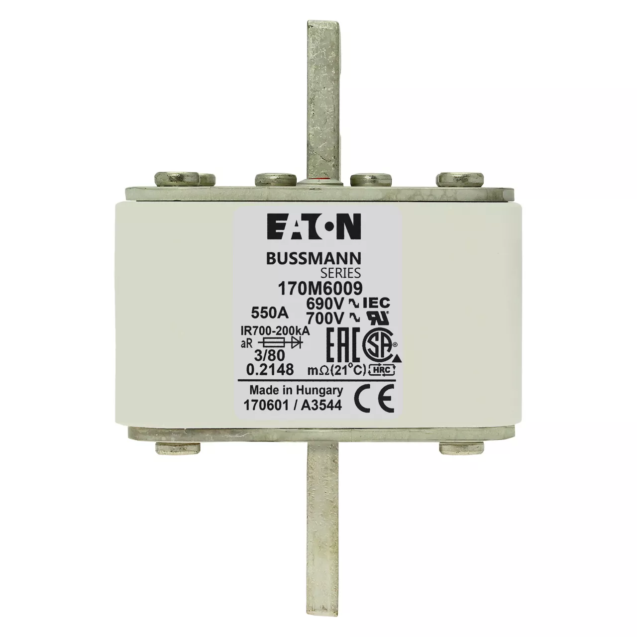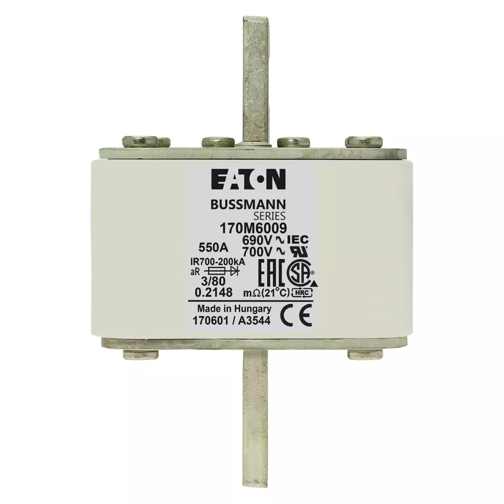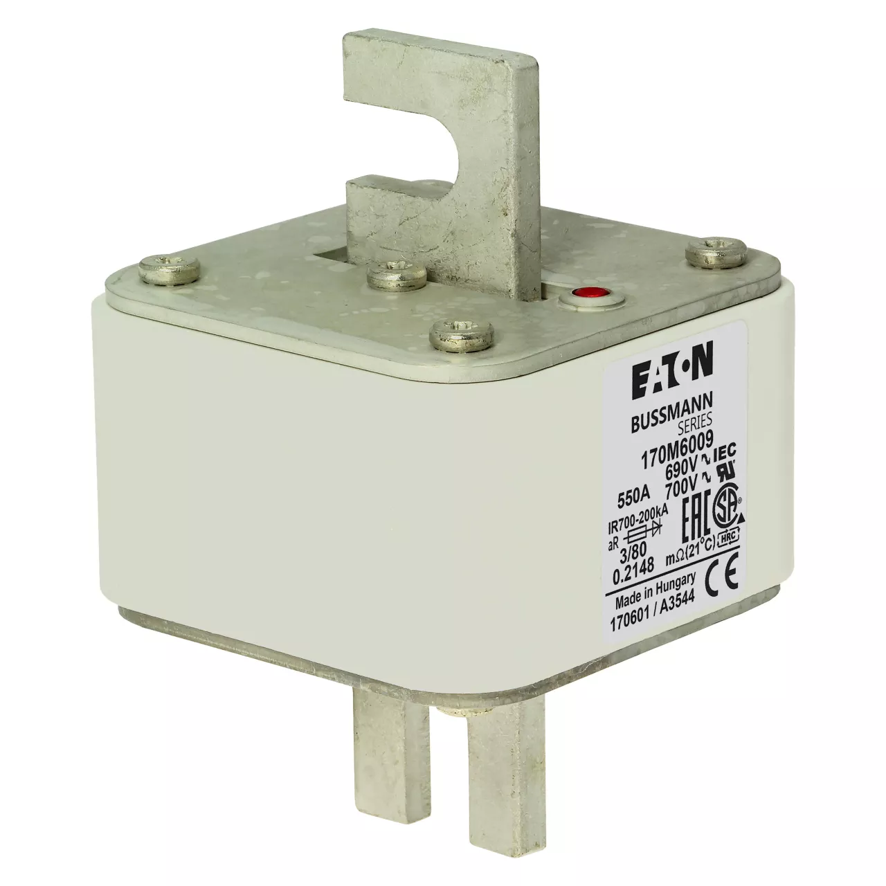 170M6009 Wkładka szybka, 550 A, AC 690 V, DIN 3, 76 x 76 x 109 mm, aR, DIN, IEC, pojedynczy wskaźnik