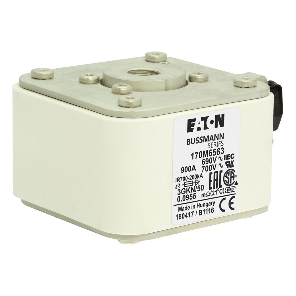 Bezpiecznik, wkladka topikowa, szybka, 900 A, AC 690 V, rozmiar 3, 76 x 92 x 53 mm, aR, IEC, UL, pojedynczy wskaznik, korpus prostopadloscienny ze stykami zlicowanymi, wskaznik typu K dla mikroprzelacznika, z gwintem US, ochrona pólprzewodnika, IEC 60269-4, zdolnosc wylaczania 200 kA