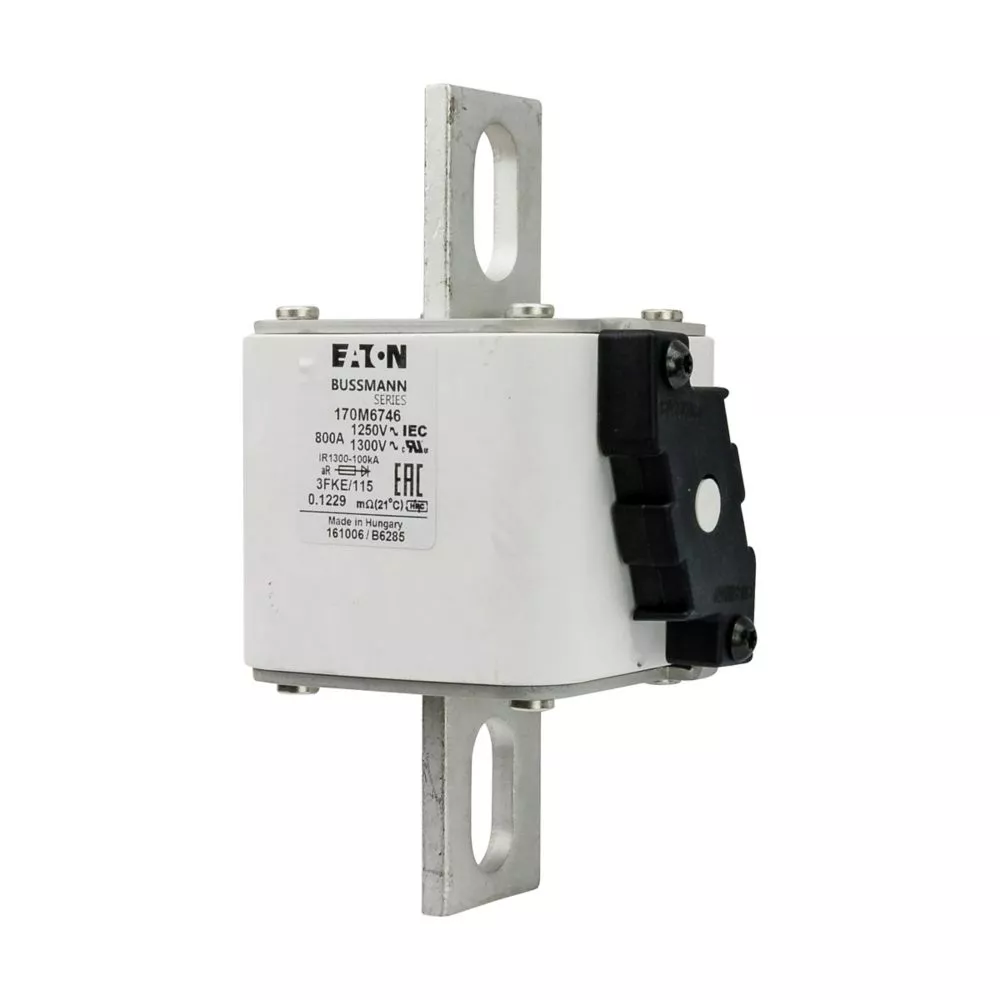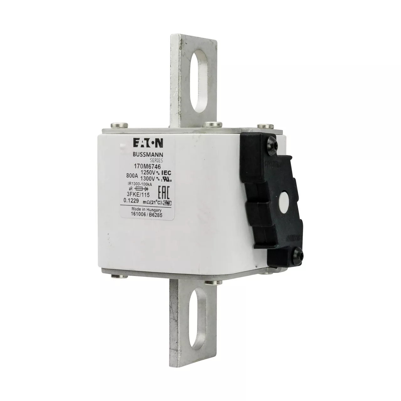 Bezpiecznik, wkladka topikowa, szybka, 800 A, AC 1250 V, rozmiar 3, 76 x 92 x 159 mm, aR, IEC, UL, pojedynczy wskaznik, korpus prostopadloscienny z zaciskami przykrecanymi centralnie, styl amerykanski, wskaznik typu K dla mikroprzelacznika, ochrona pólprzewodnika, IEC 60269-4, zdolnosc wylaczania 100 kA