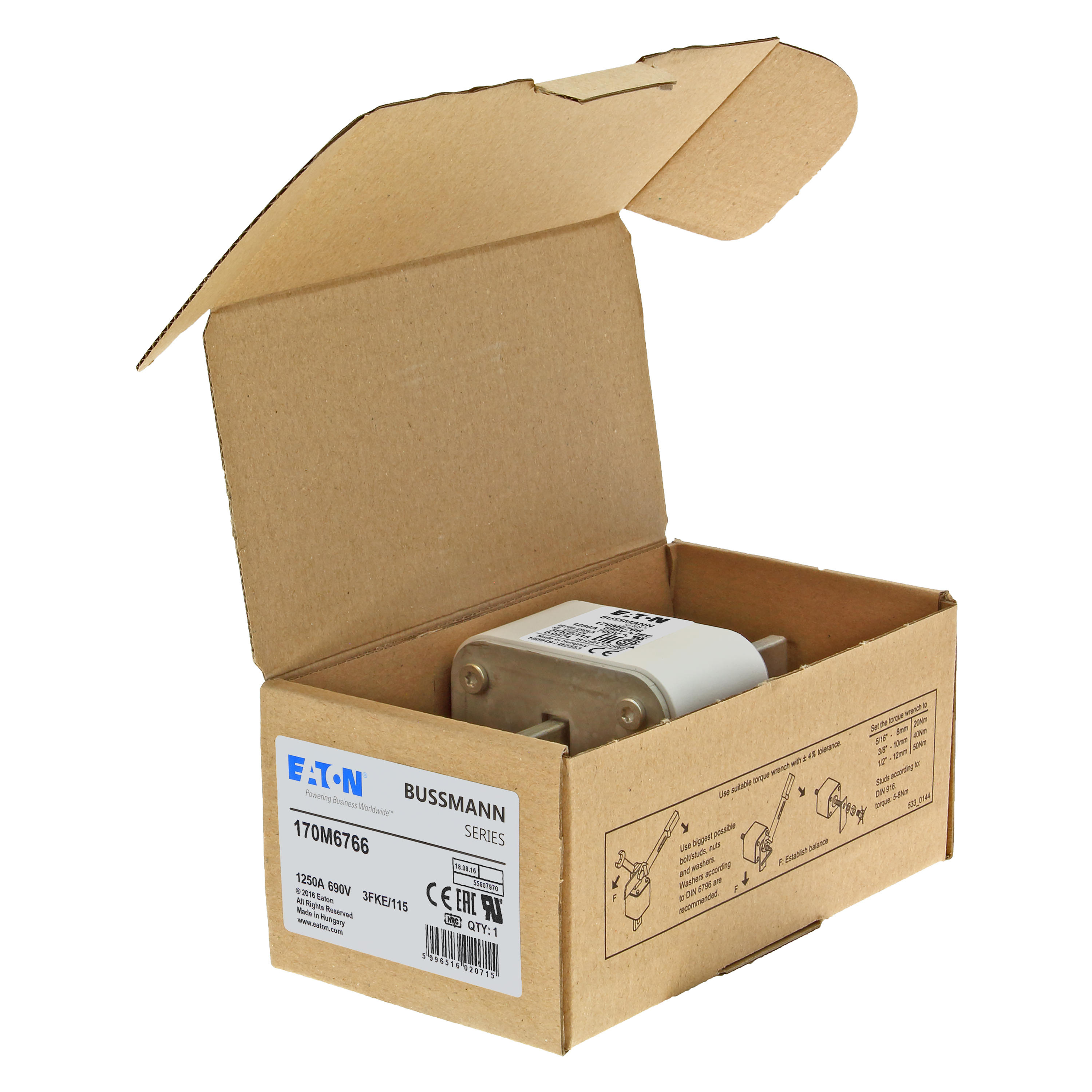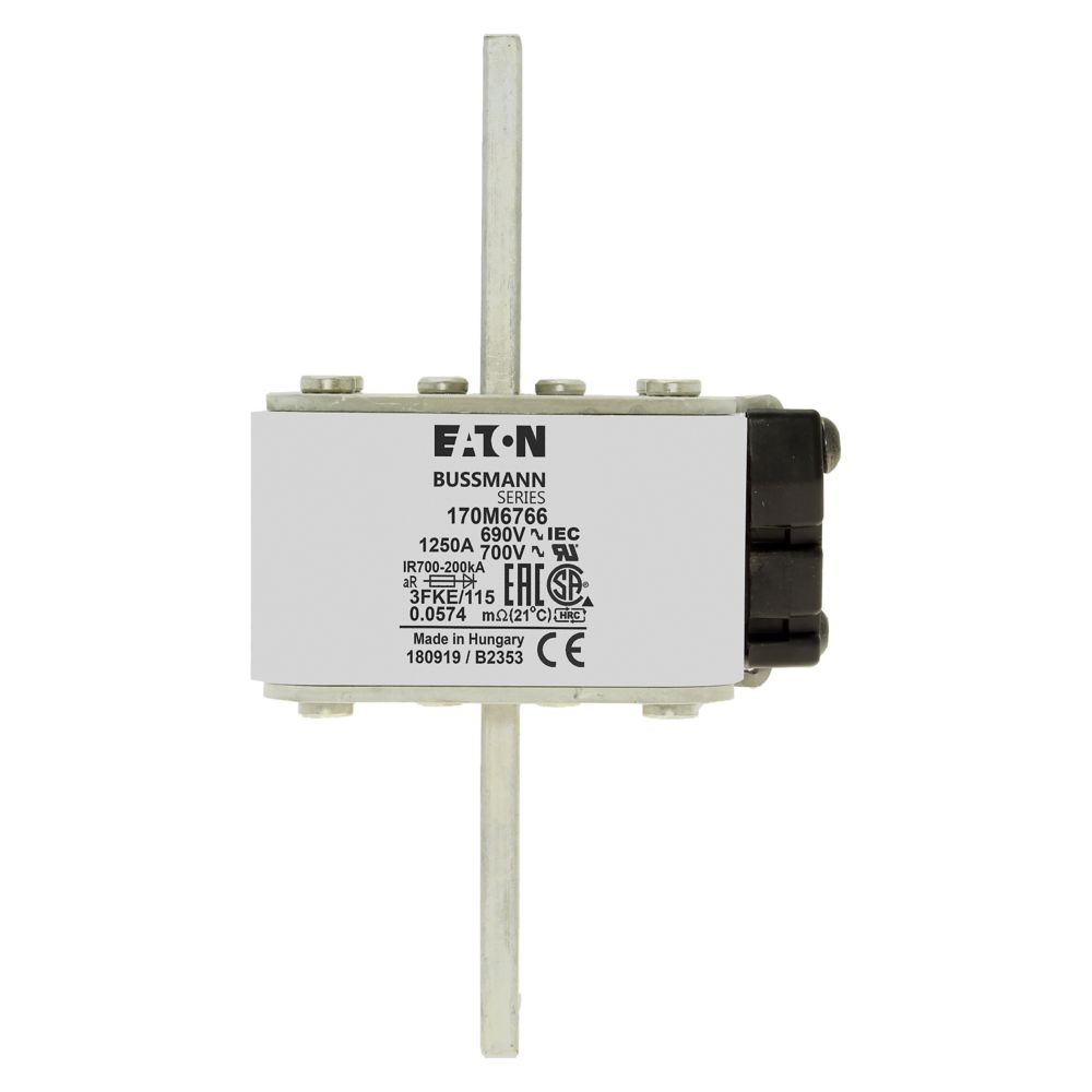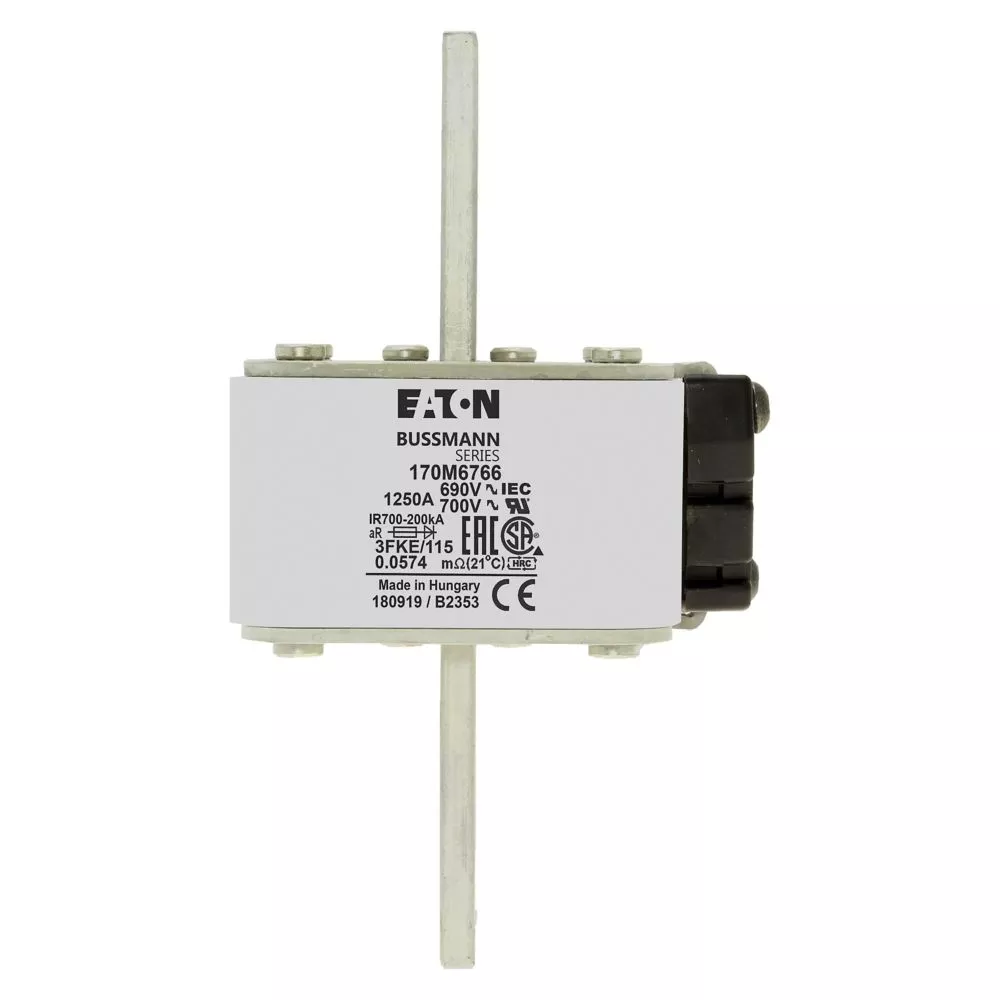 Bezpiecznik, wkladka topikowa, szybka, 1250 A, AC 690 V, rozmiar 3, 76 x 92 x 139 mm, aR, IEC, UL, pojedynczy wskaznik, korpus prostopadloscienny z zaciskami przykrecanymi centralnie, styl amerykanski, wskaznik typu K dla mikroprzelacznika, ochrona pólprzewodnika, IEC 60269-4, zdolnosc wylaczania 200 kA